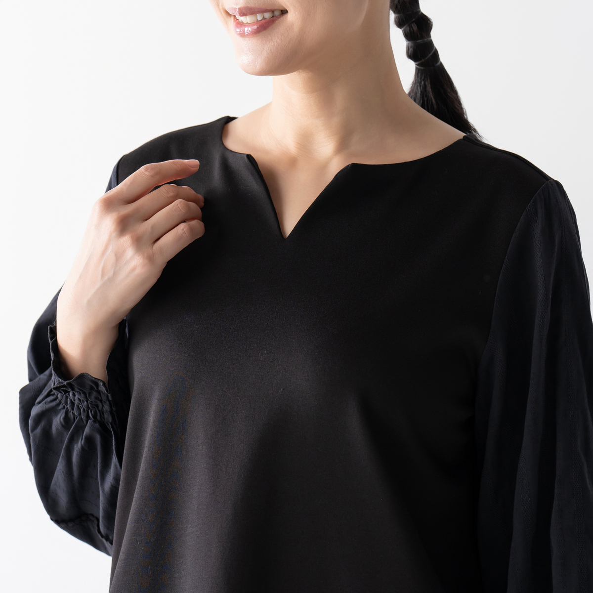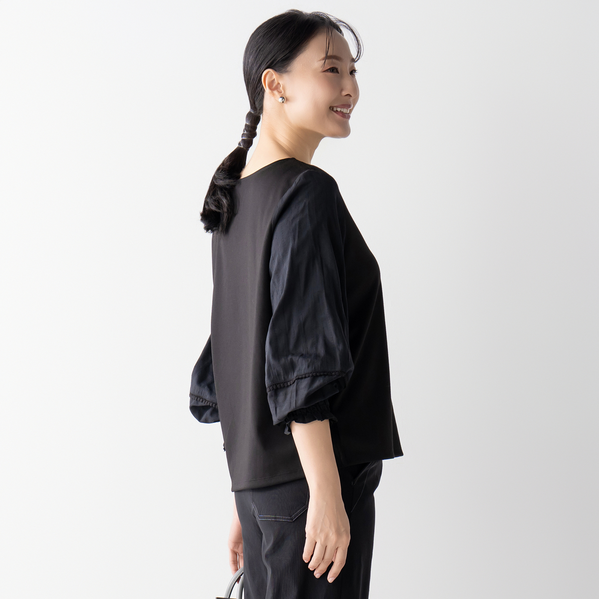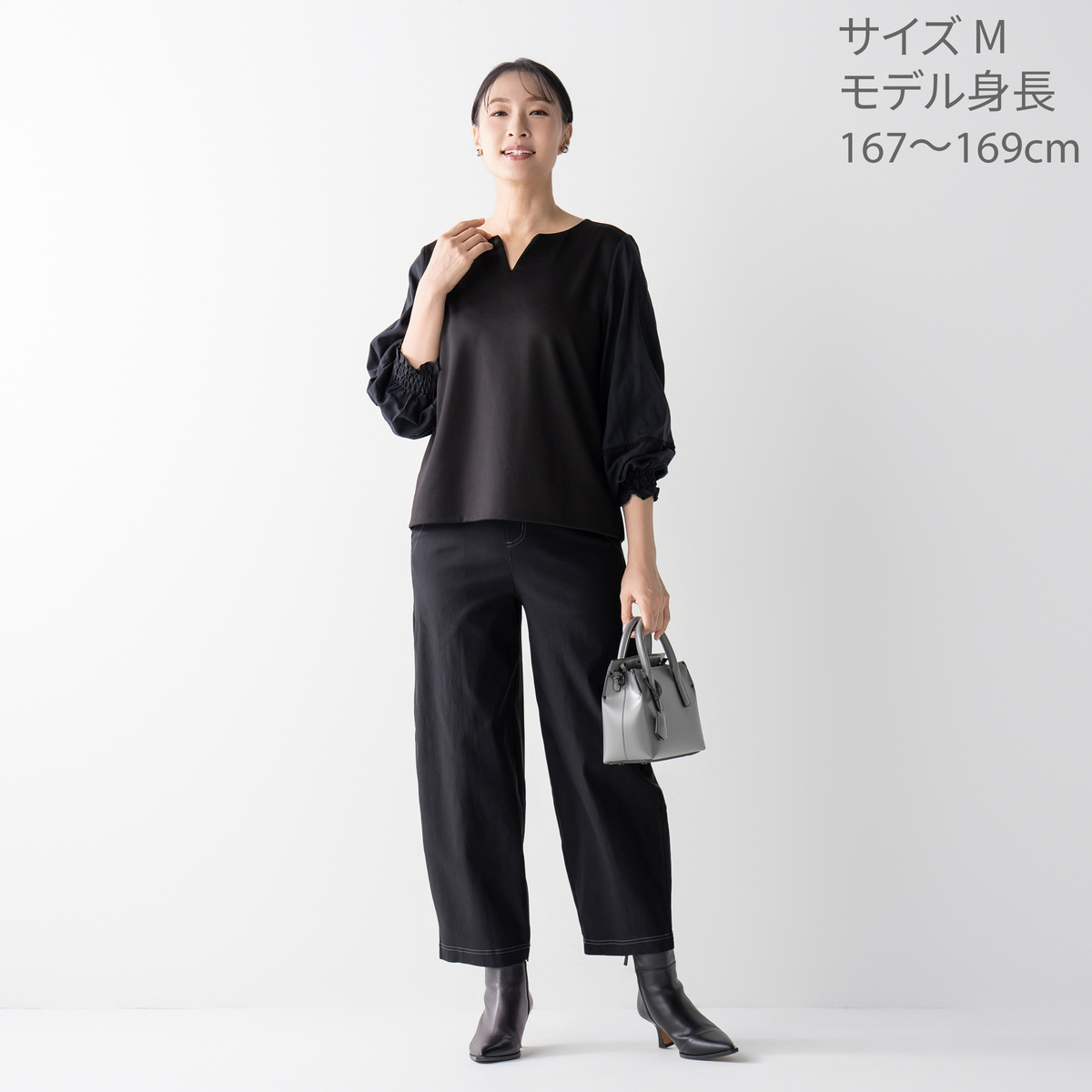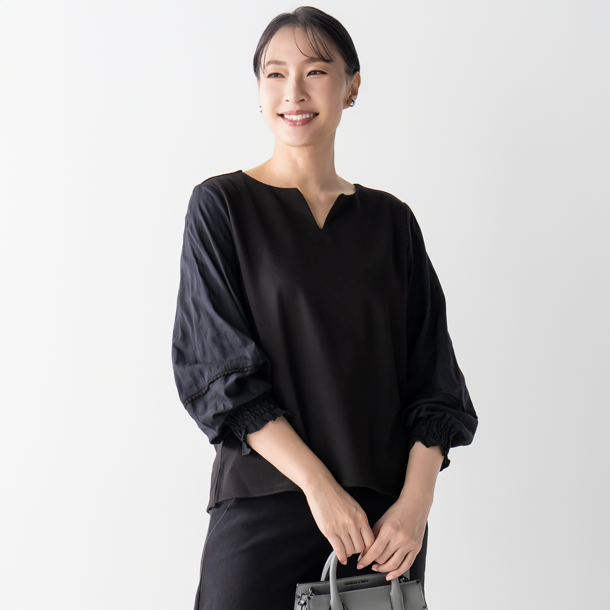 袖口はゴムシャーリングでふんわりさせ、ピコレースで高級感を添え、手元を美しく演出。首元は浅めスリットで抜け感をプラスし、ネックレスも映えるデザインに。ゆとりあるシルエットで体型をすっきりカバーし、パンツにもスカートにも合わせやすい着丈です
