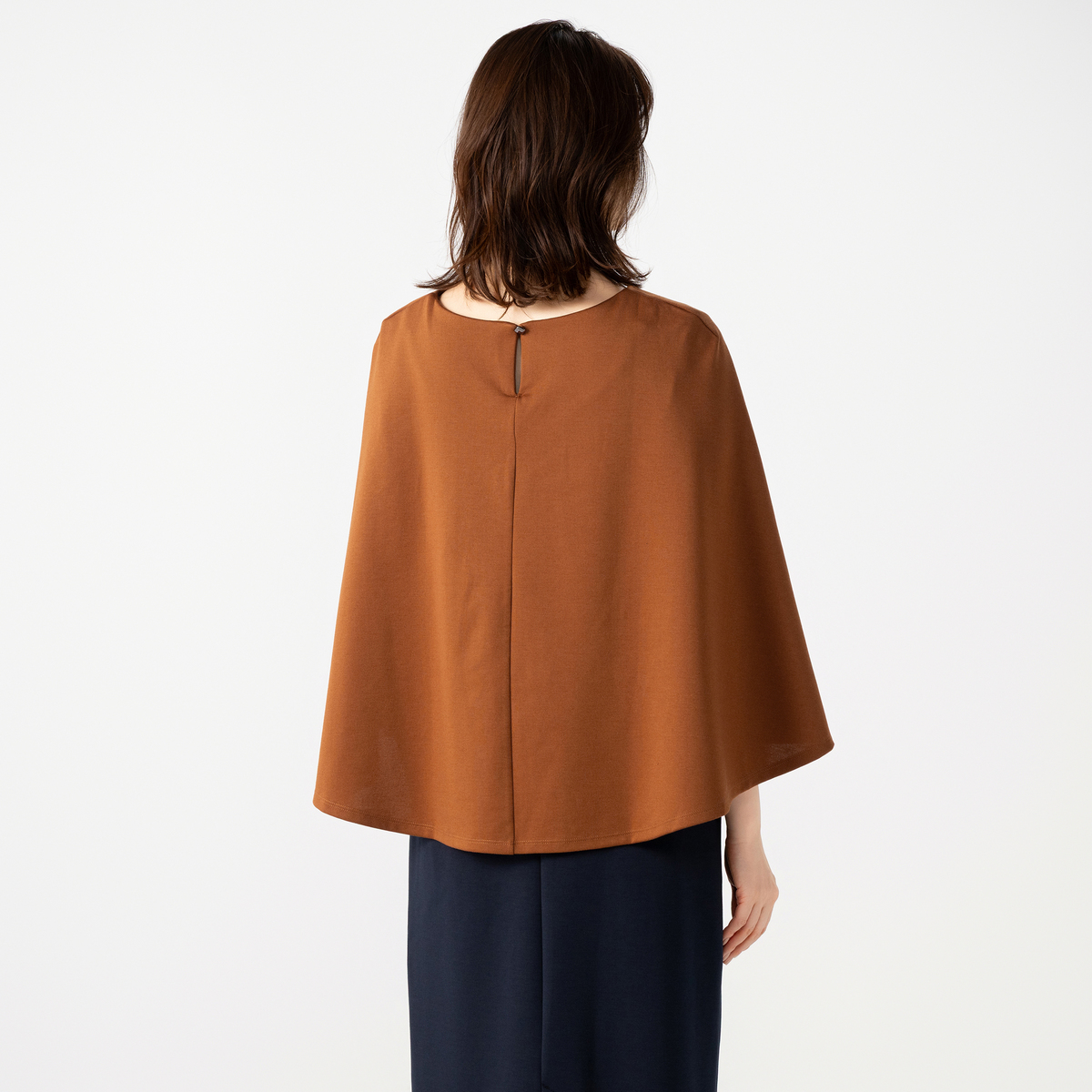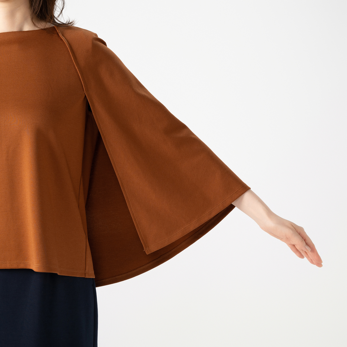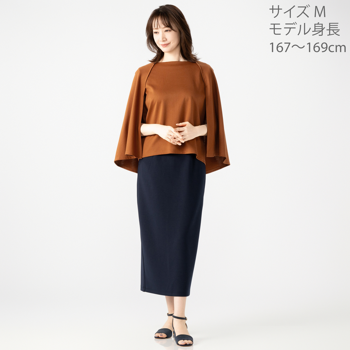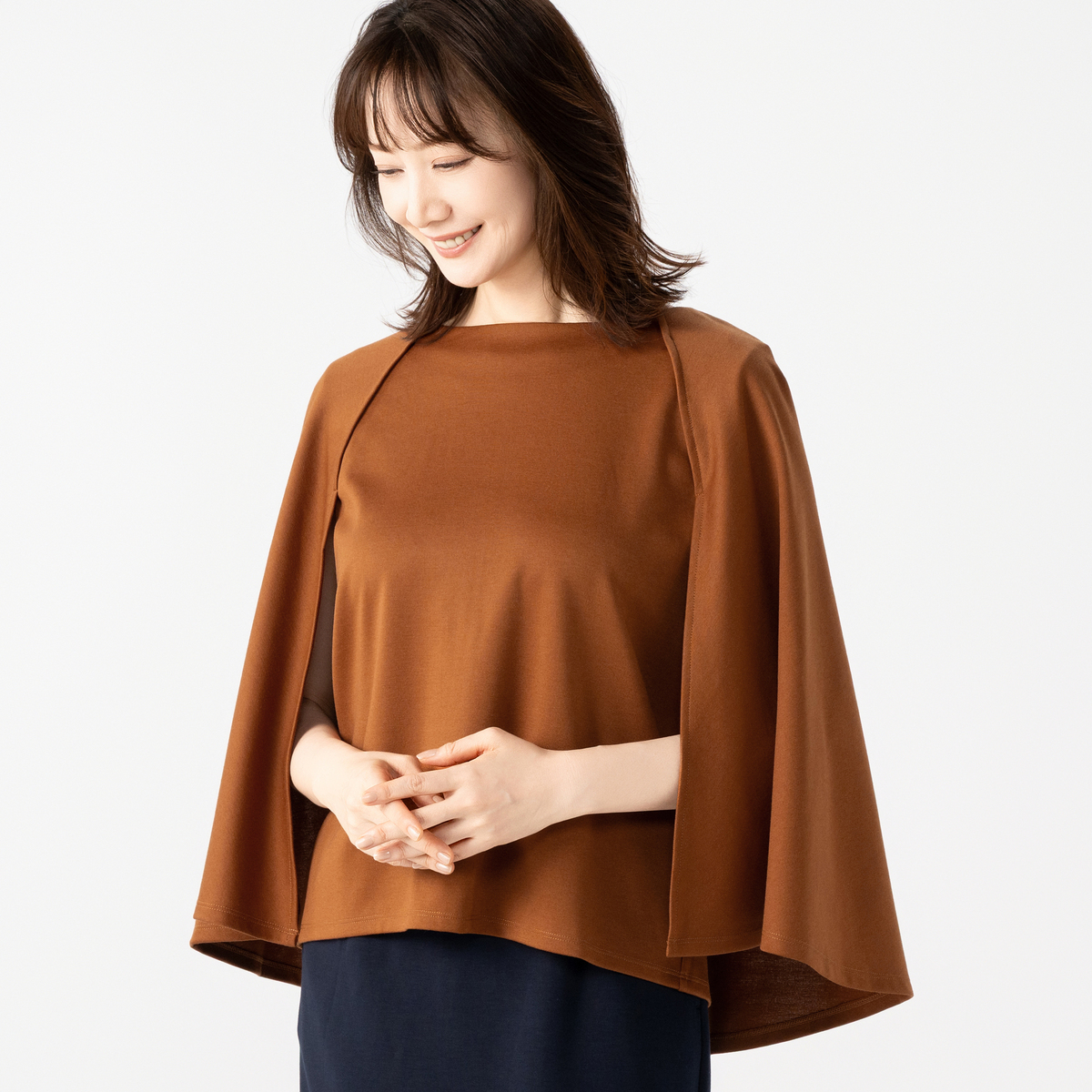 肩から流れるように施されたケープ風デザインが、華やかさと上品さを演出。ストレートすぎない程よいAラインで、気になる二の腕や腰周りを自然にカバーします。着丈は前後差を持たせることで、パンツにもスカートにも合わせやすい万能なバランスになっています
