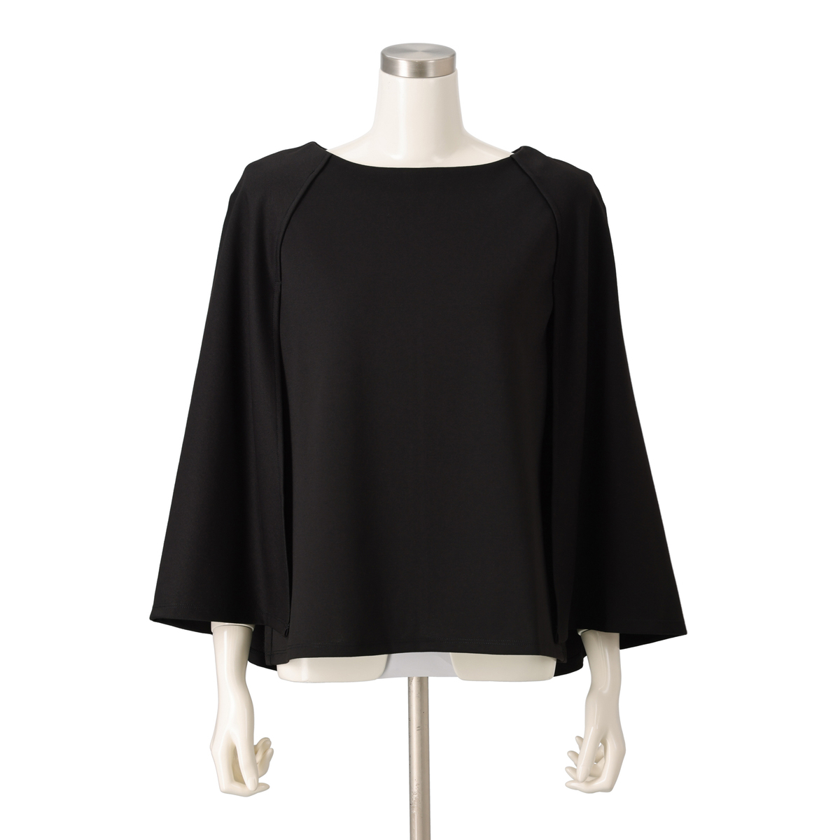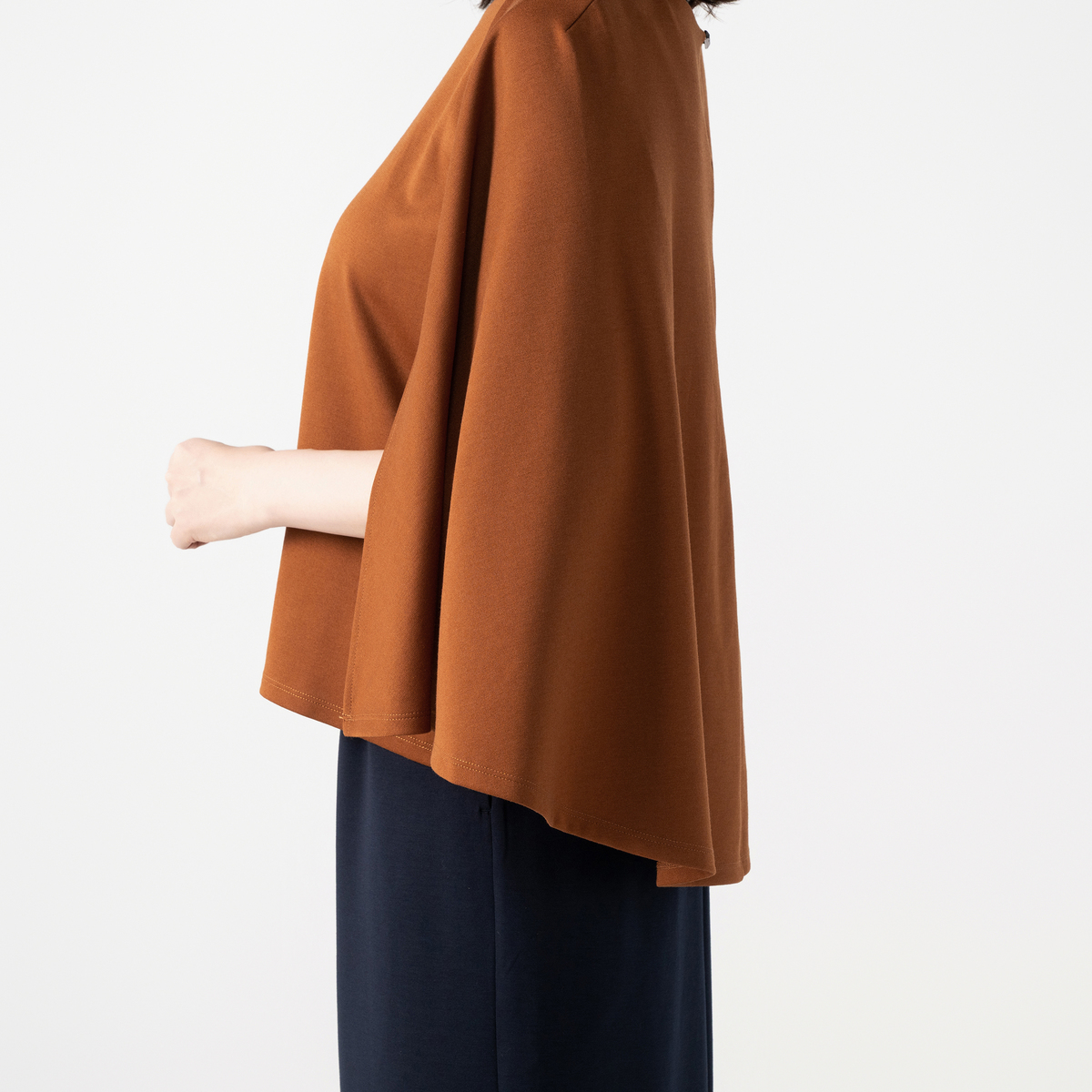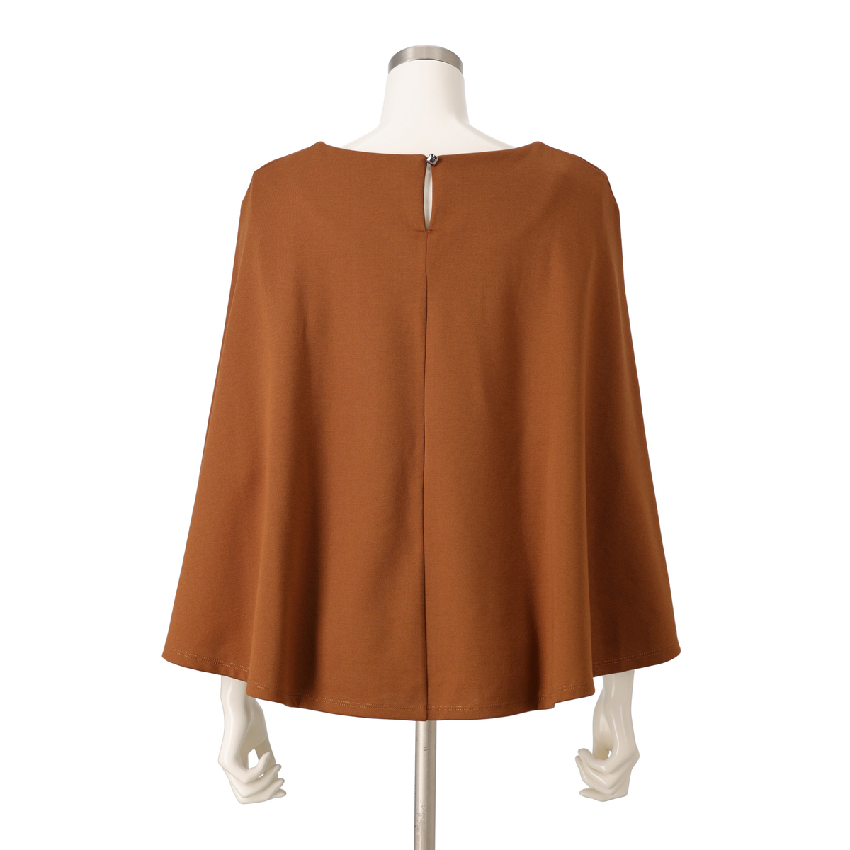肩から流れるように施されたケープ風デザインが、華やかさと上品さを演出。ストレートすぎない程よいAラインで、気になる二の腕や腰周りを自然にカバーします。着丈は前後差を持たせることで、パンツにもスカートにも合わせやすい万能なバランスになっています