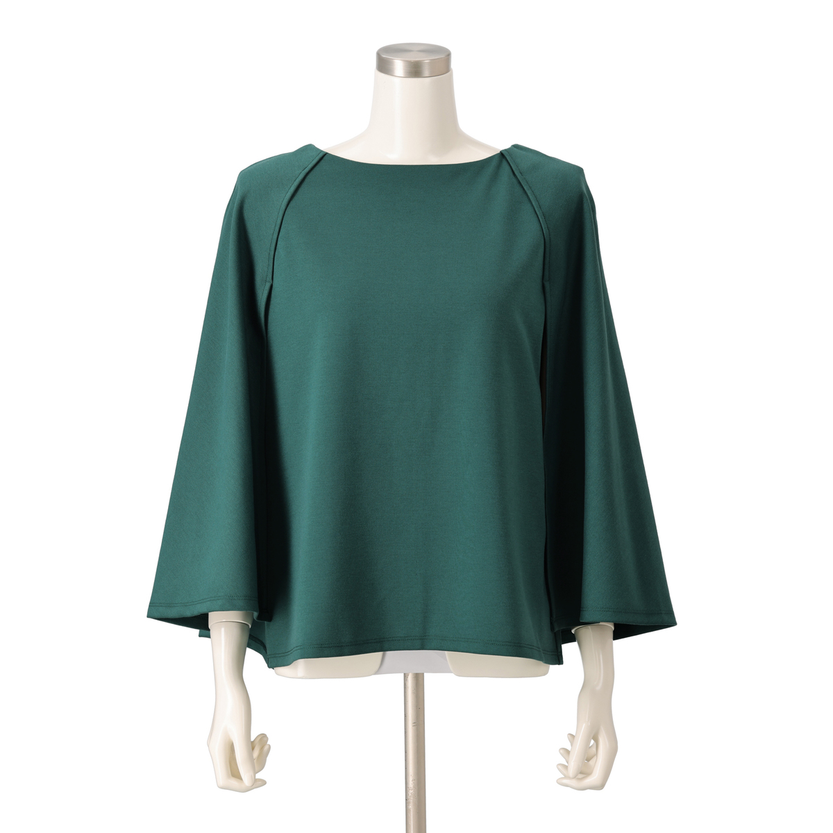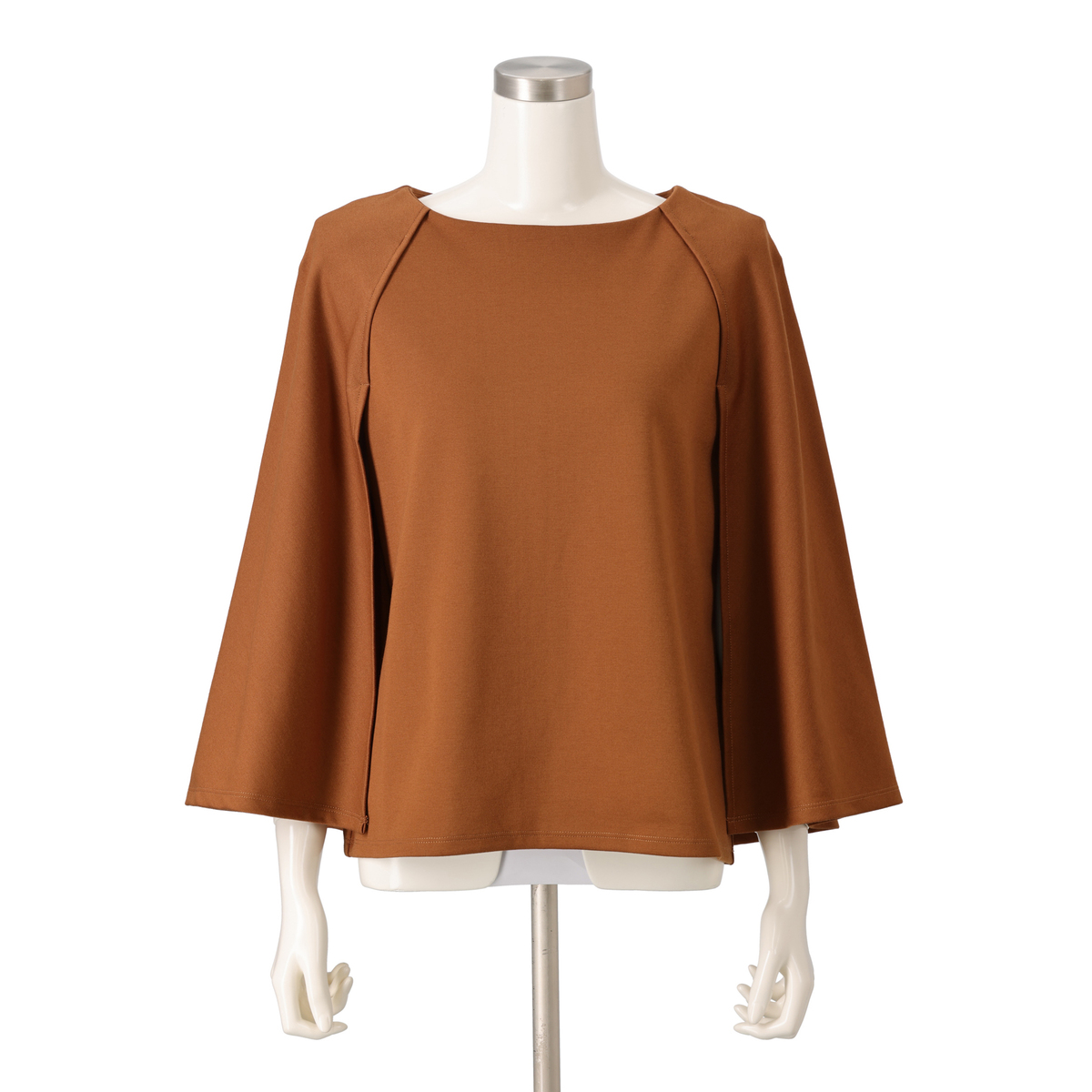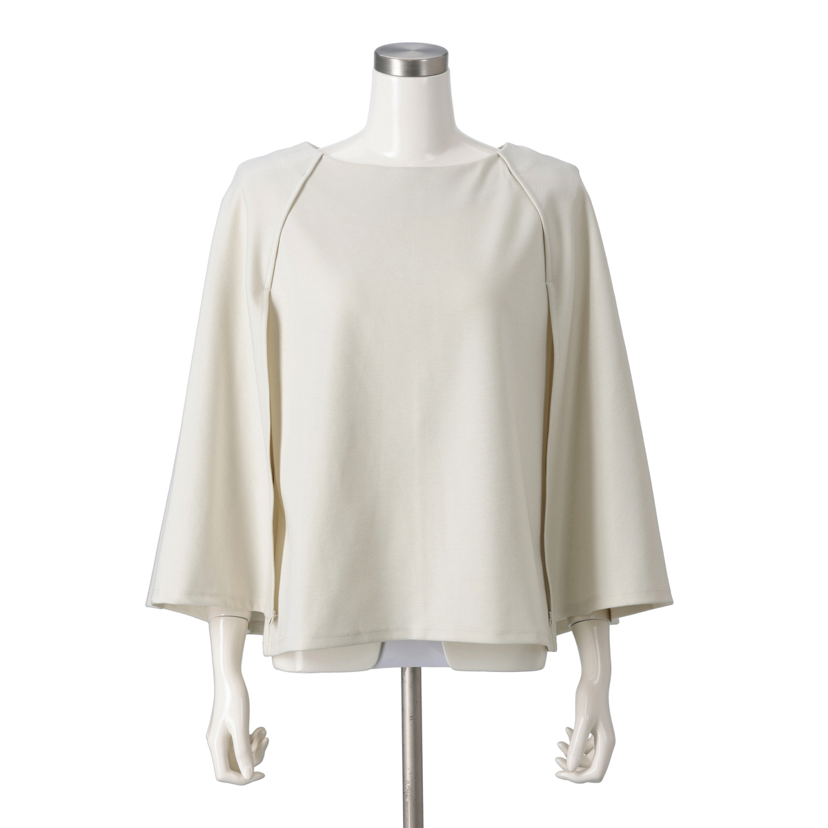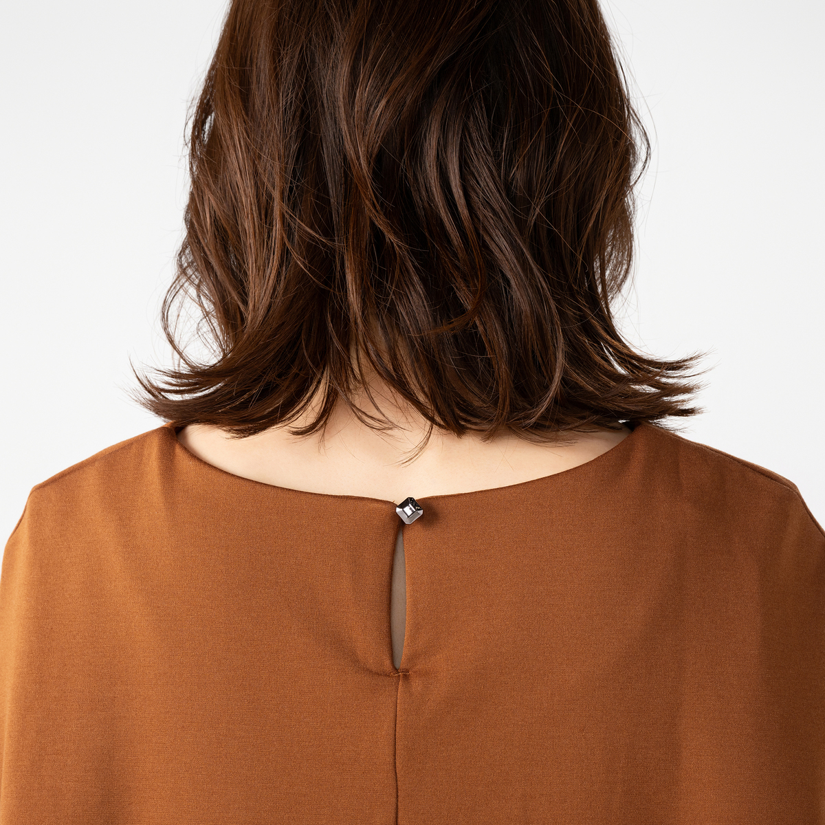 肩から流れるように施されたケープ風デザインが、華やかさと上品さを演出。ストレートすぎない程よいAラインで、気になる二の腕や腰周りを自然にカバーします。着丈は前後差を持たせることで、パンツにもスカートにも合わせやすい万能なバランスになっています