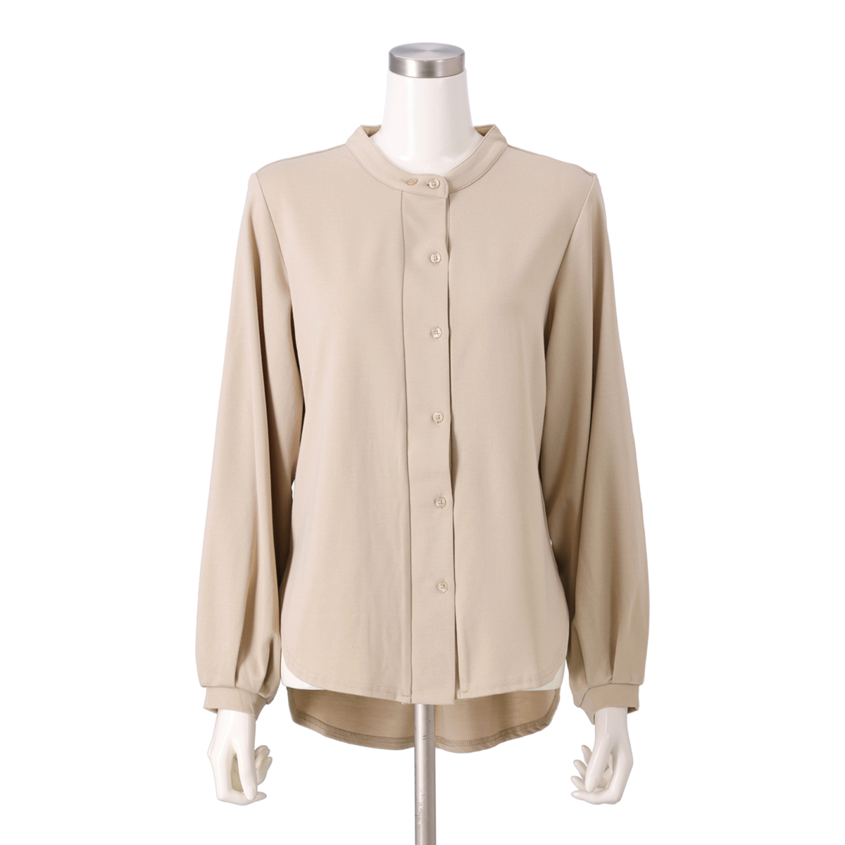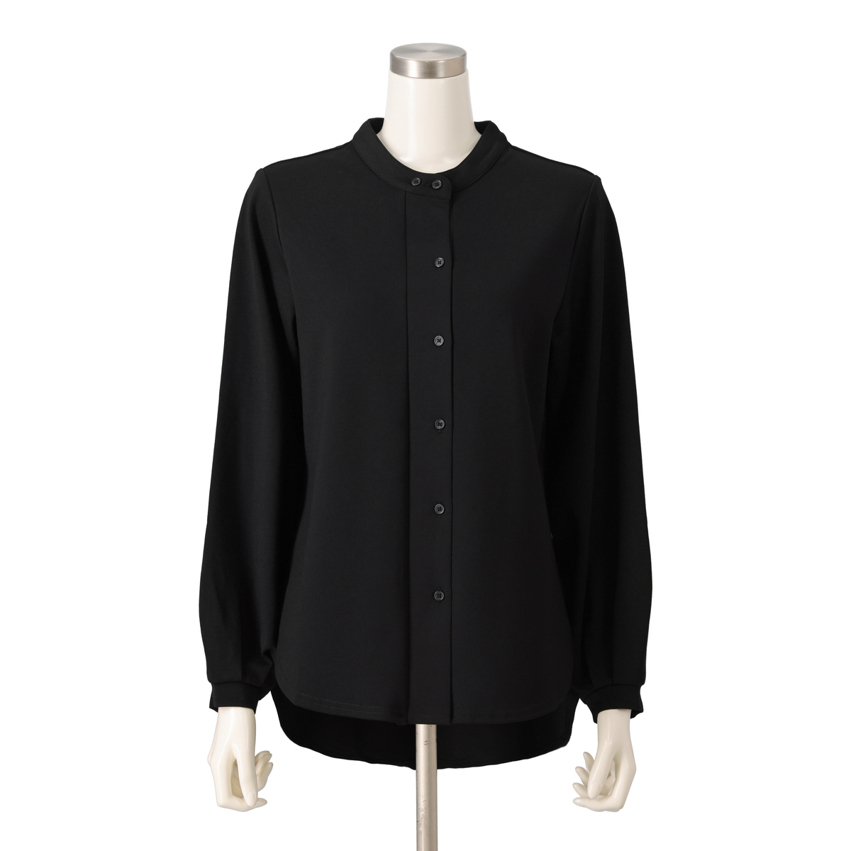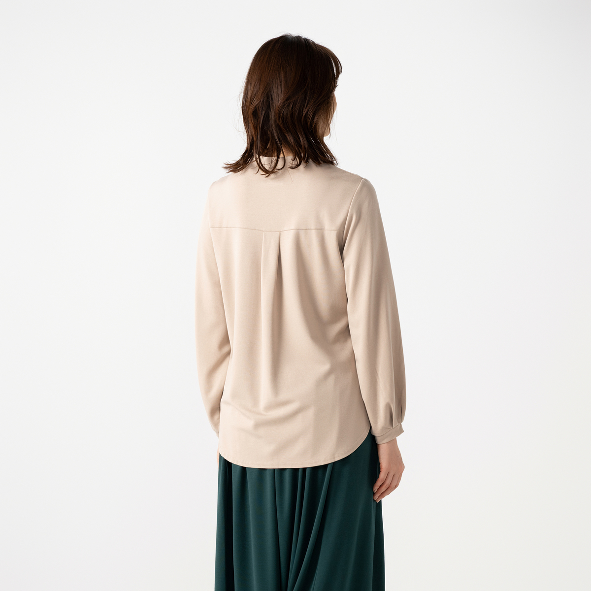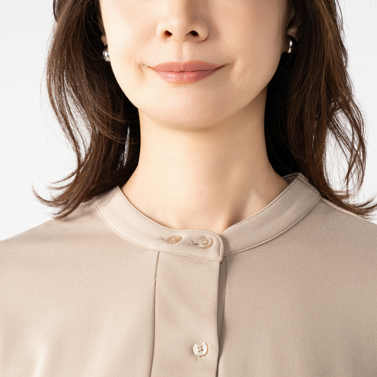 身頃は程よくゆとりを持たせたリラックスシルエット。前後差のある裾ラインで、気になる腰周りを自然にカバーします。前立てボタンのクラシックデザインで、着るだけで品よくきちんと感を演出。後ろヨーク部分にはタックを入れることで、動きやすさと立体感を両立します