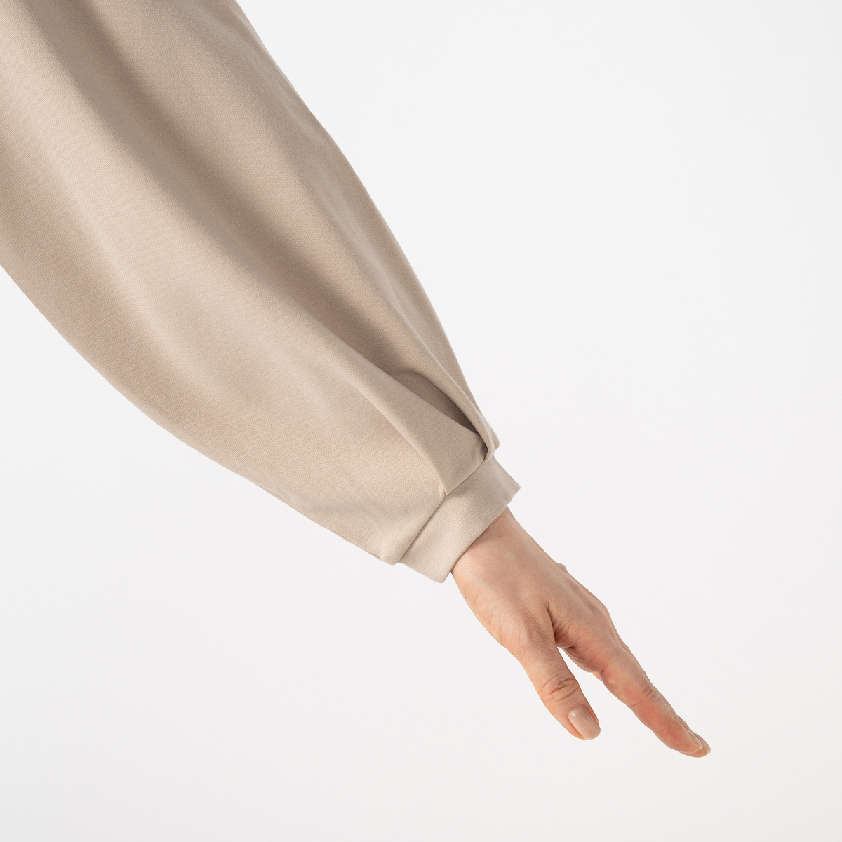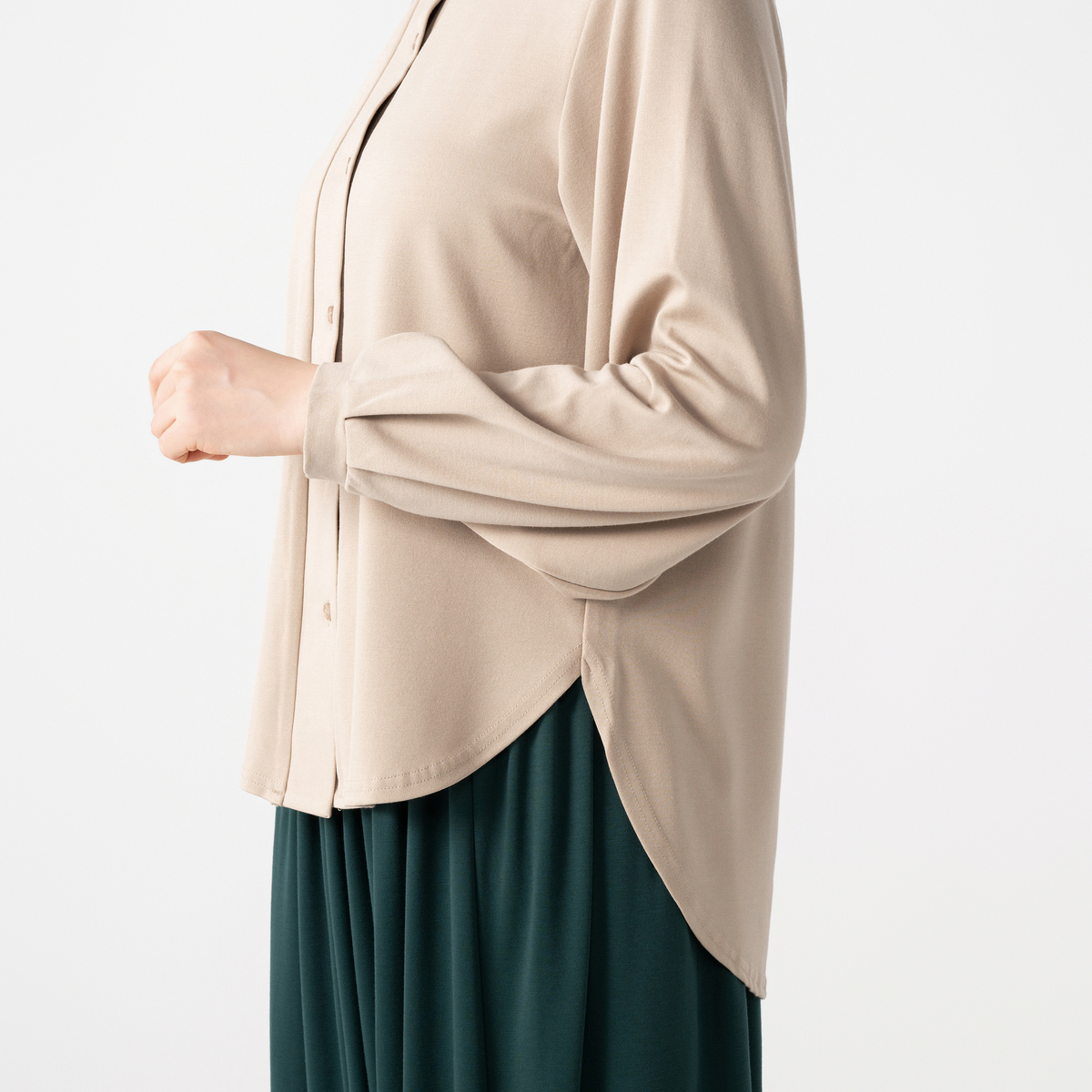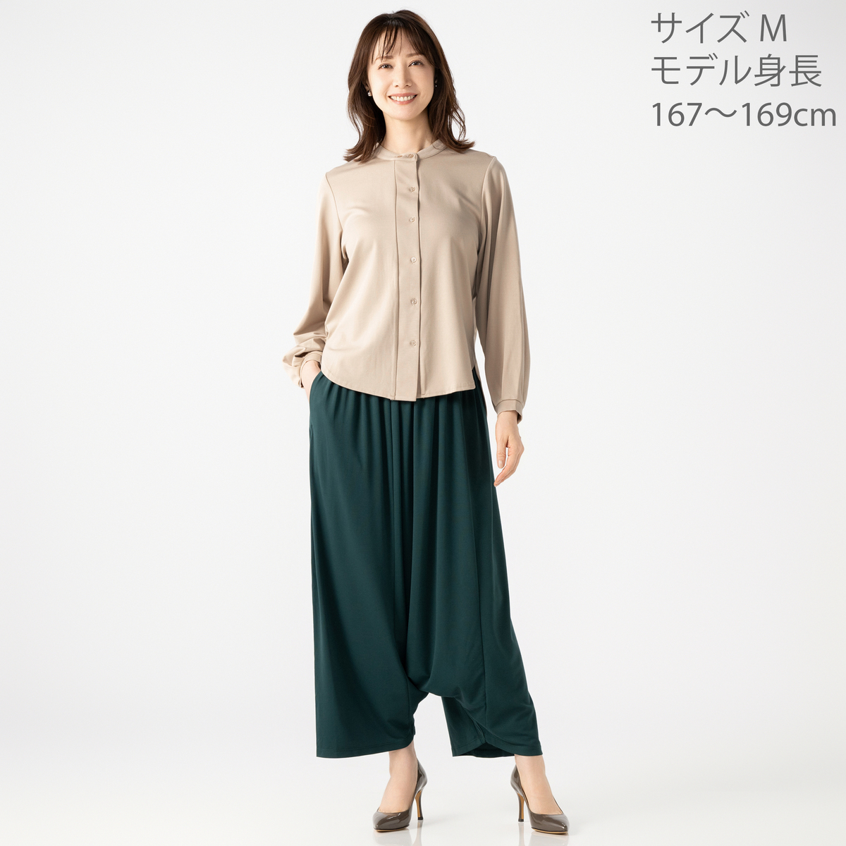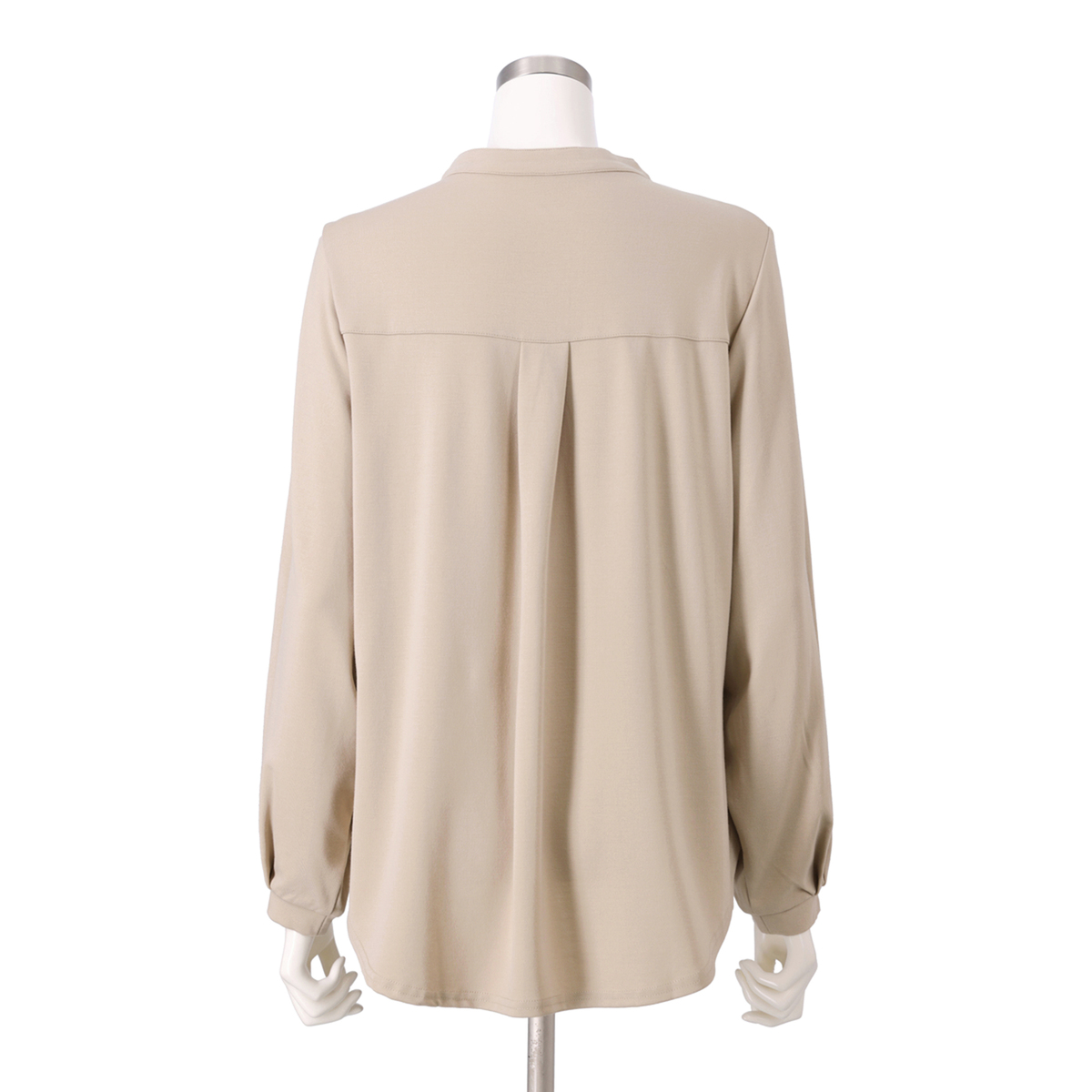 身頃は程よくゆとりを持たせたリラックスシルエット。前後差のある裾ラインで、気になる腰周りを自然にカバーします。前立てボタンのクラシックデザインで、着るだけで品よくきちんと感を演出。後ろヨーク部分にはタックを入れることで、動きやすさと立体感を両立します