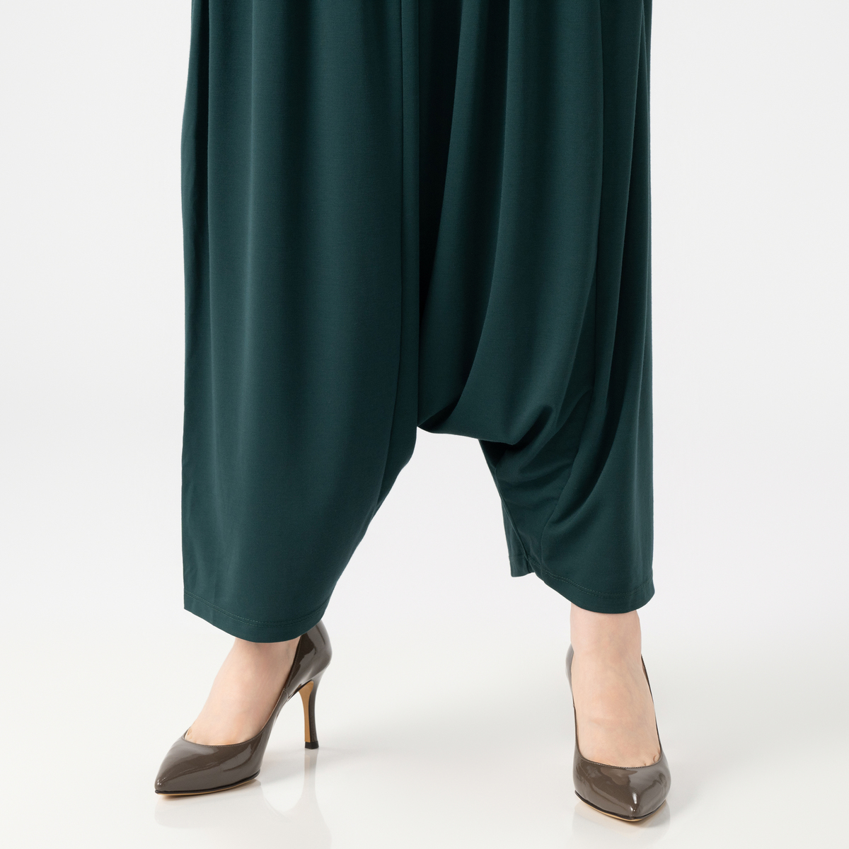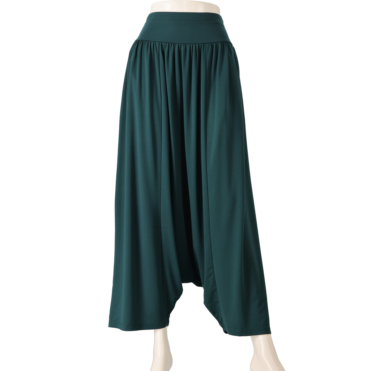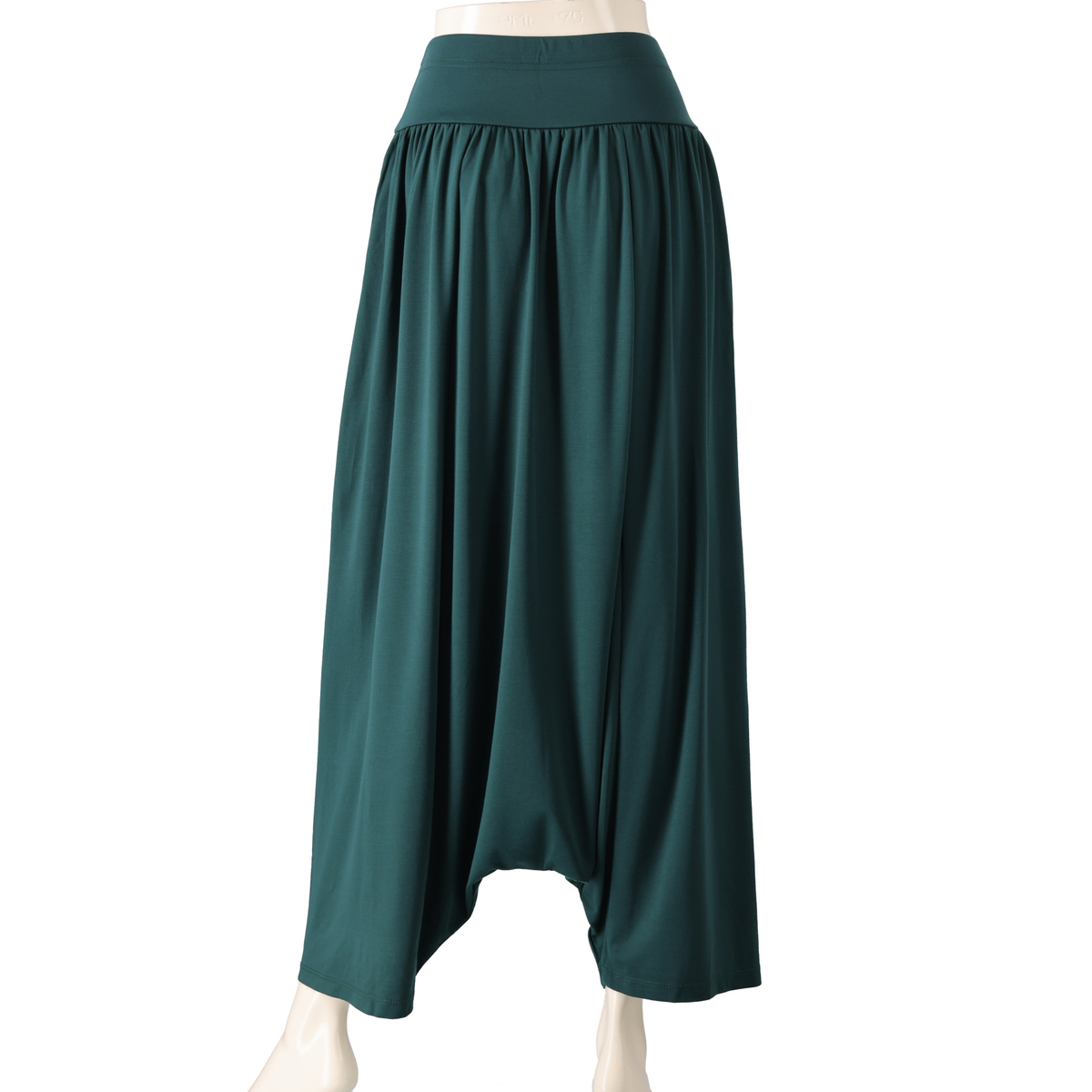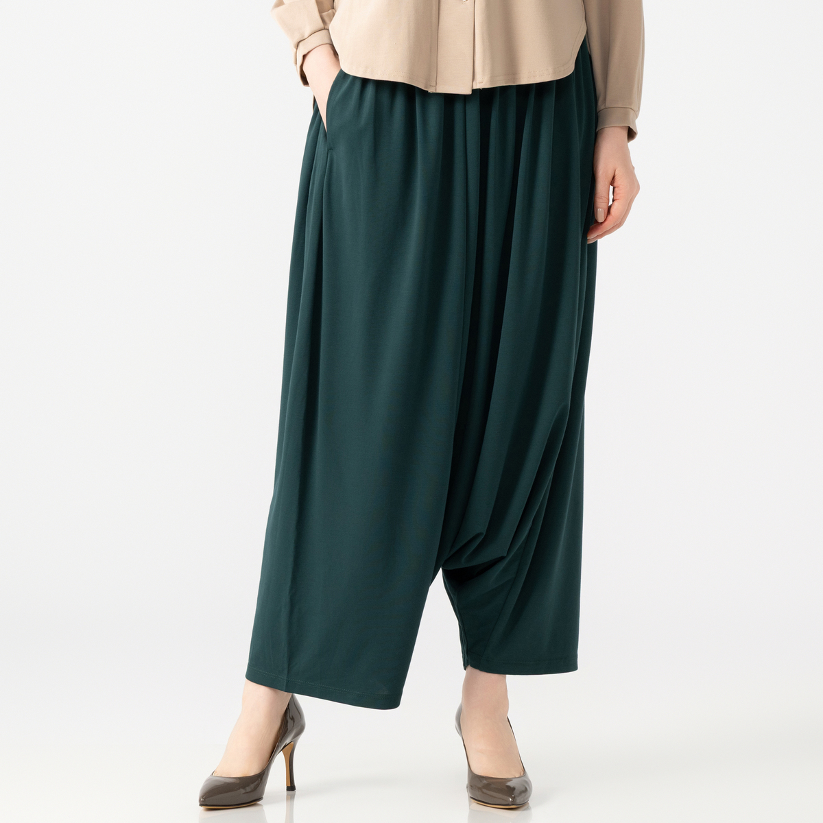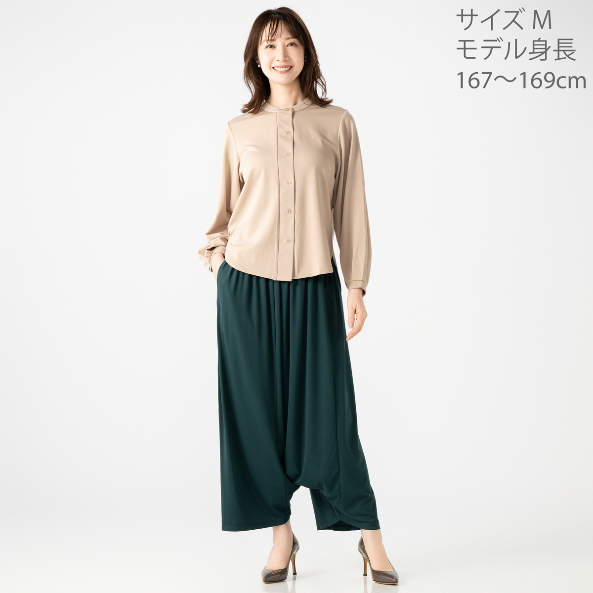 この手のパンツは民族衣装的になり太って見えるのかと敬遠していましたが、 ドレープ感が意外にフェミニンにも。 ゆったりサラッと落ち感が綺麗で大満足でした。 かなりたっぷりした生地感なのでラインが綺麗でした。