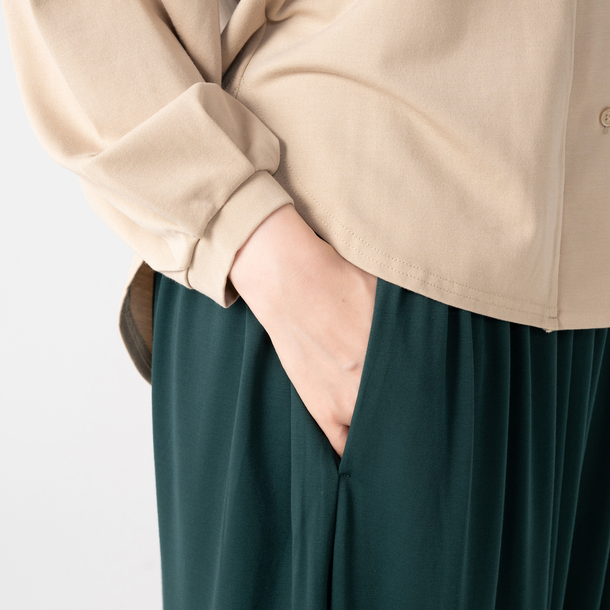 腰やヒップのラインを拾いにくく、ウエストはラクに穿ける平ゴム仕様。両サイドには便利なポケット付きです