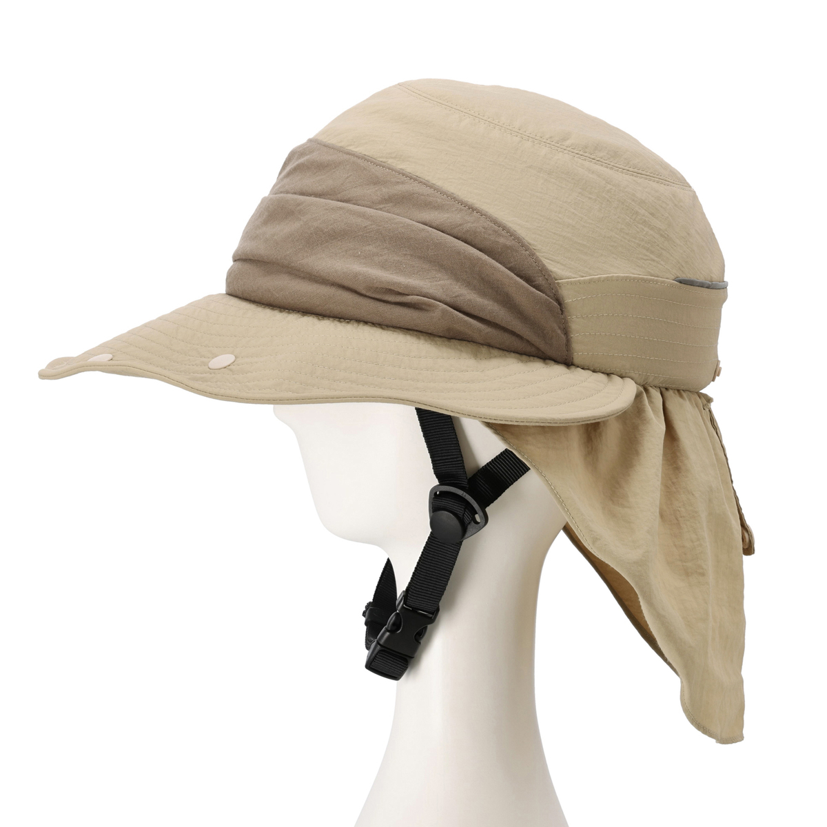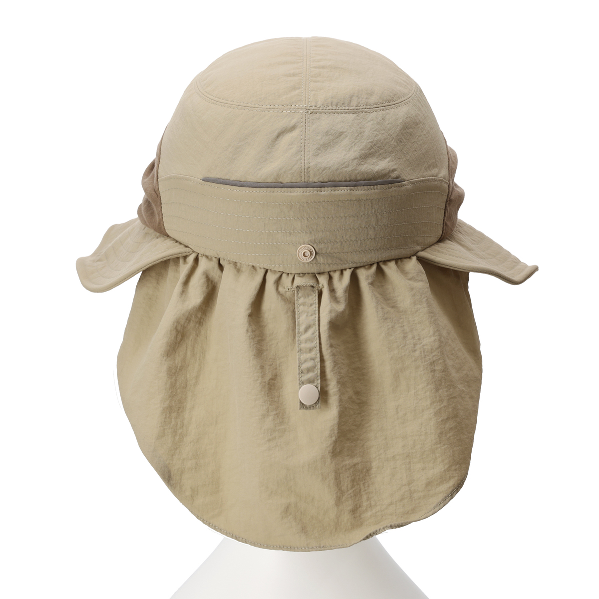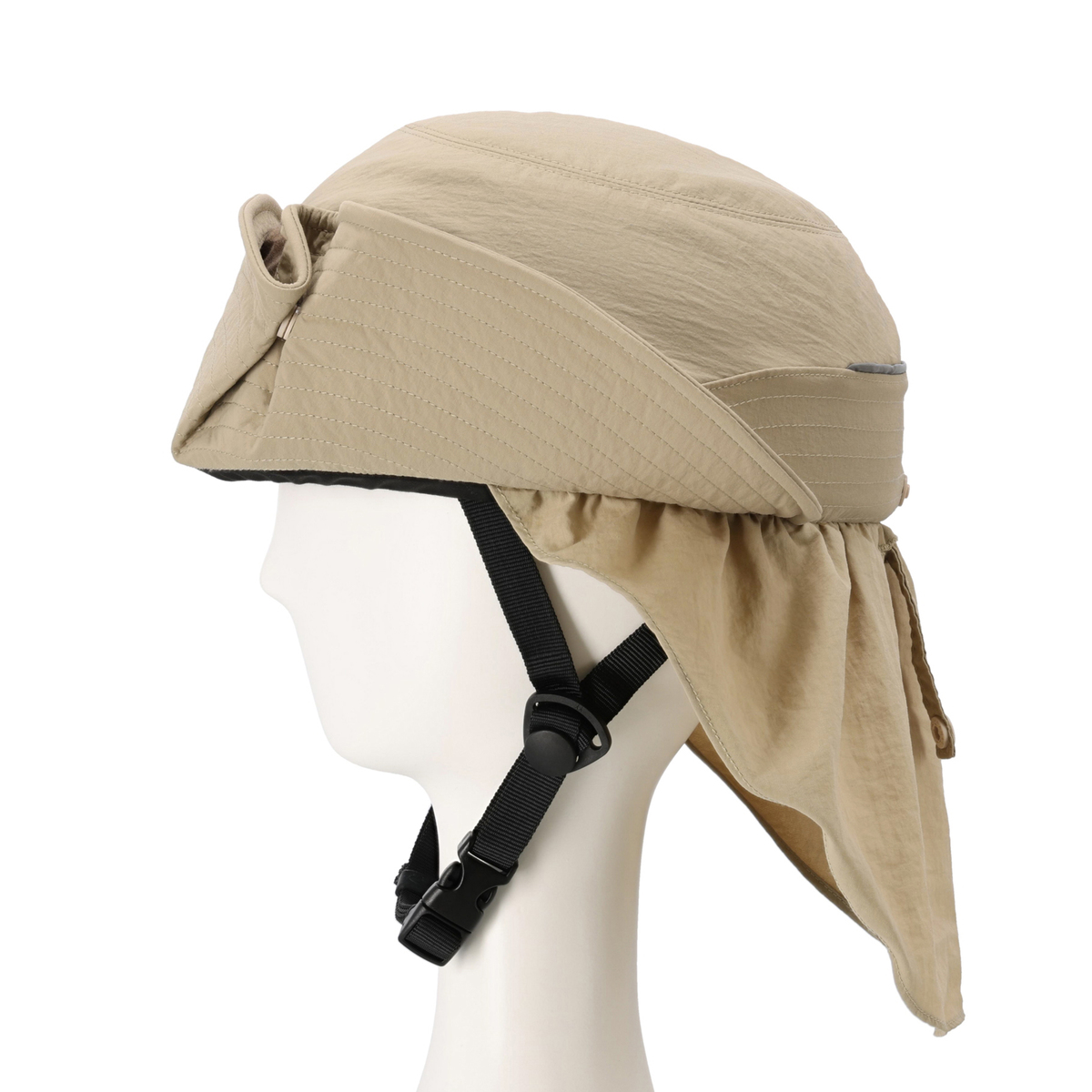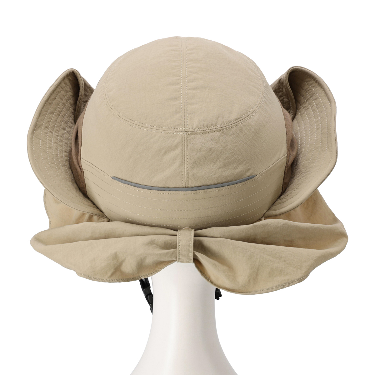 大きめのツバと、後ろの日除け布が特徴のサンハットタイプです。違和感なく使える帽子形状で、軽量コンパクトな設計。使用しない間は後部のボタン(ストッパー)で固定してリボンのような形になります
