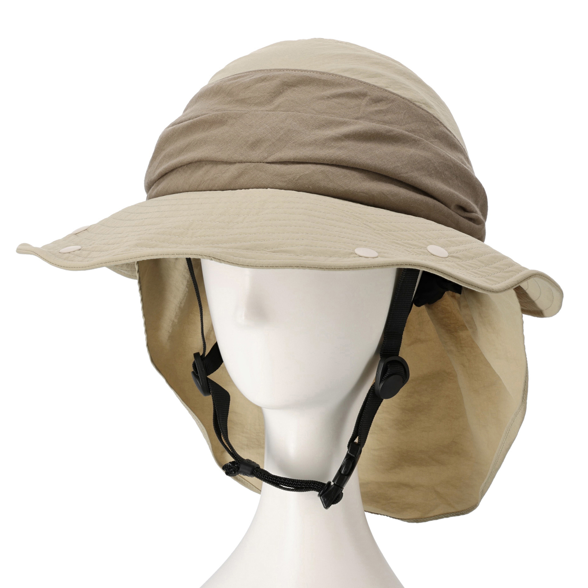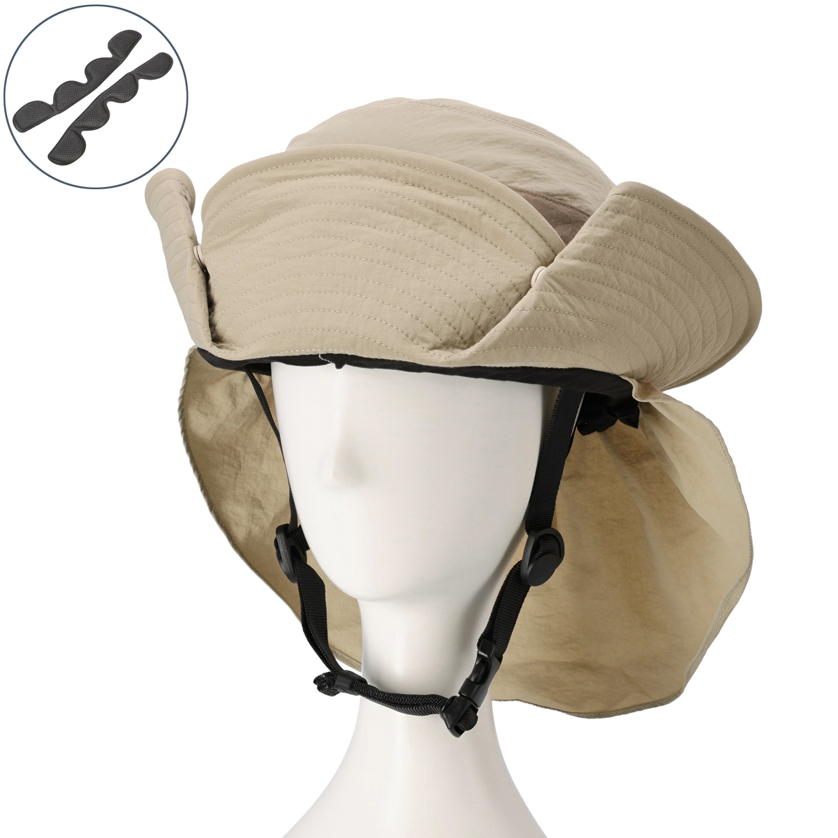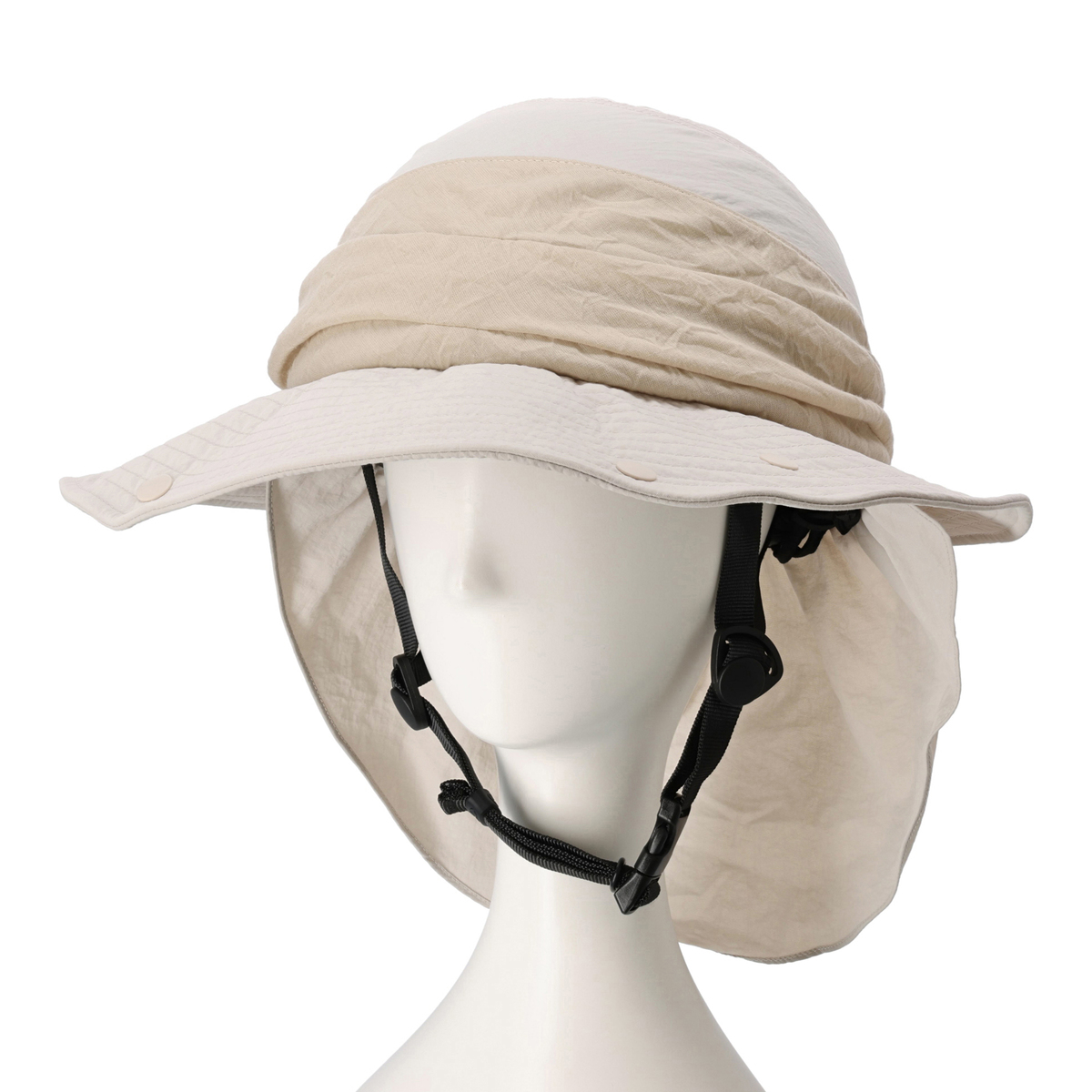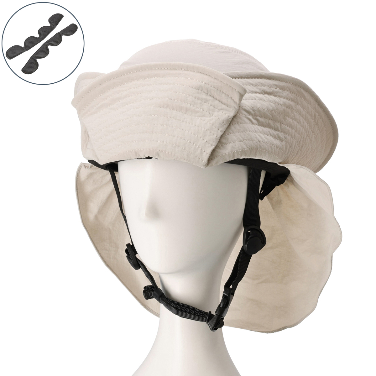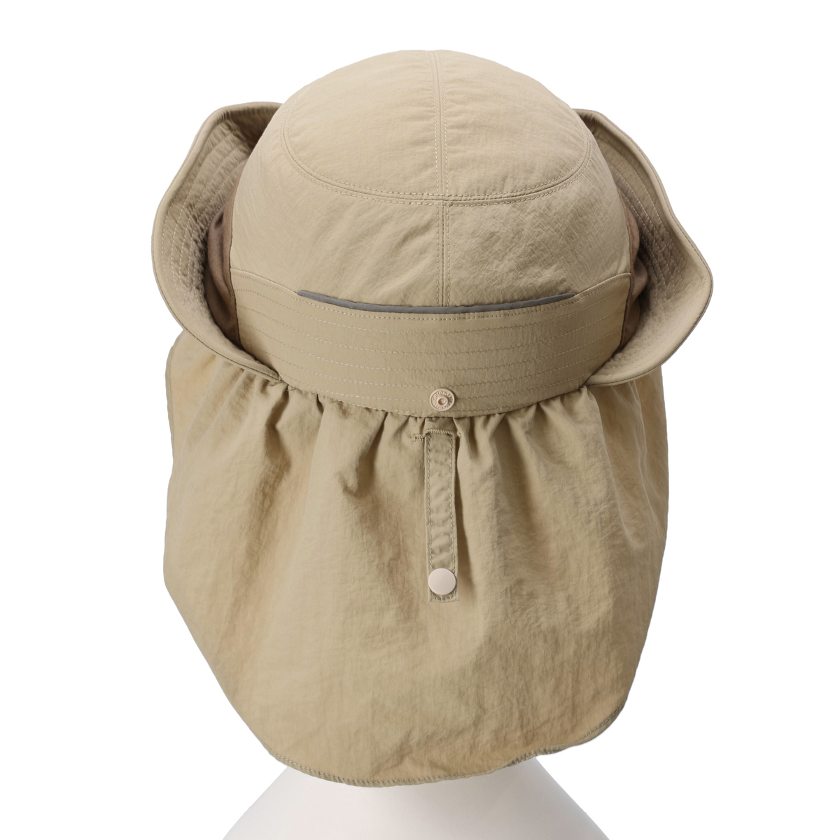 大きめのツバと、後ろの日除け布が特徴のサンハットタイプです。違和感なく使える帽子形状で、軽量コンパクトな設計。使用しない間は後部のボタン(ストッパー)で固定してリボンのような形になります