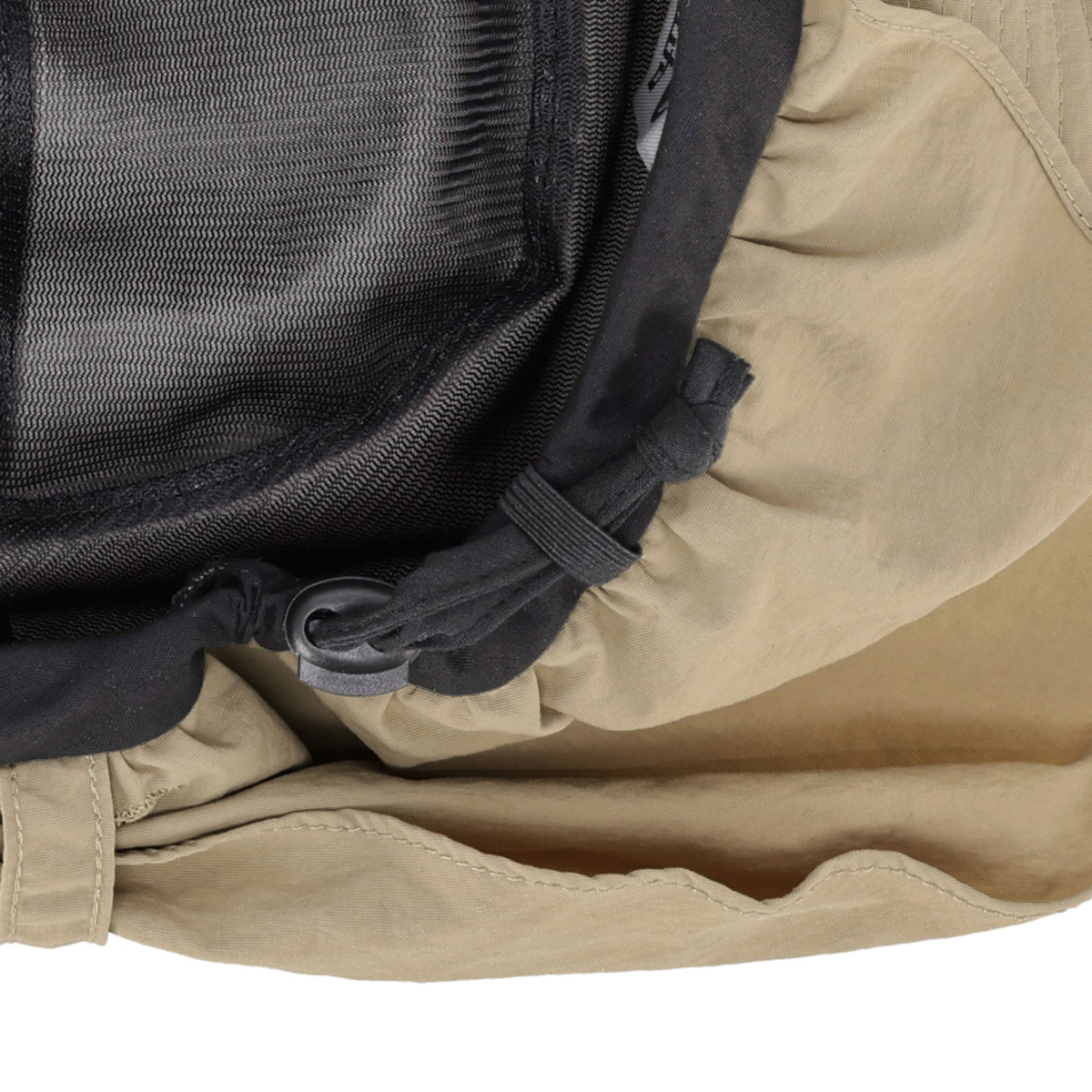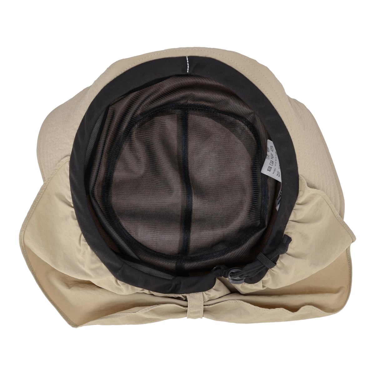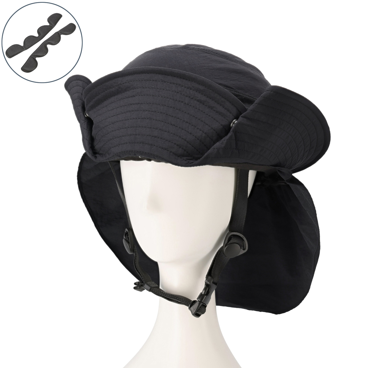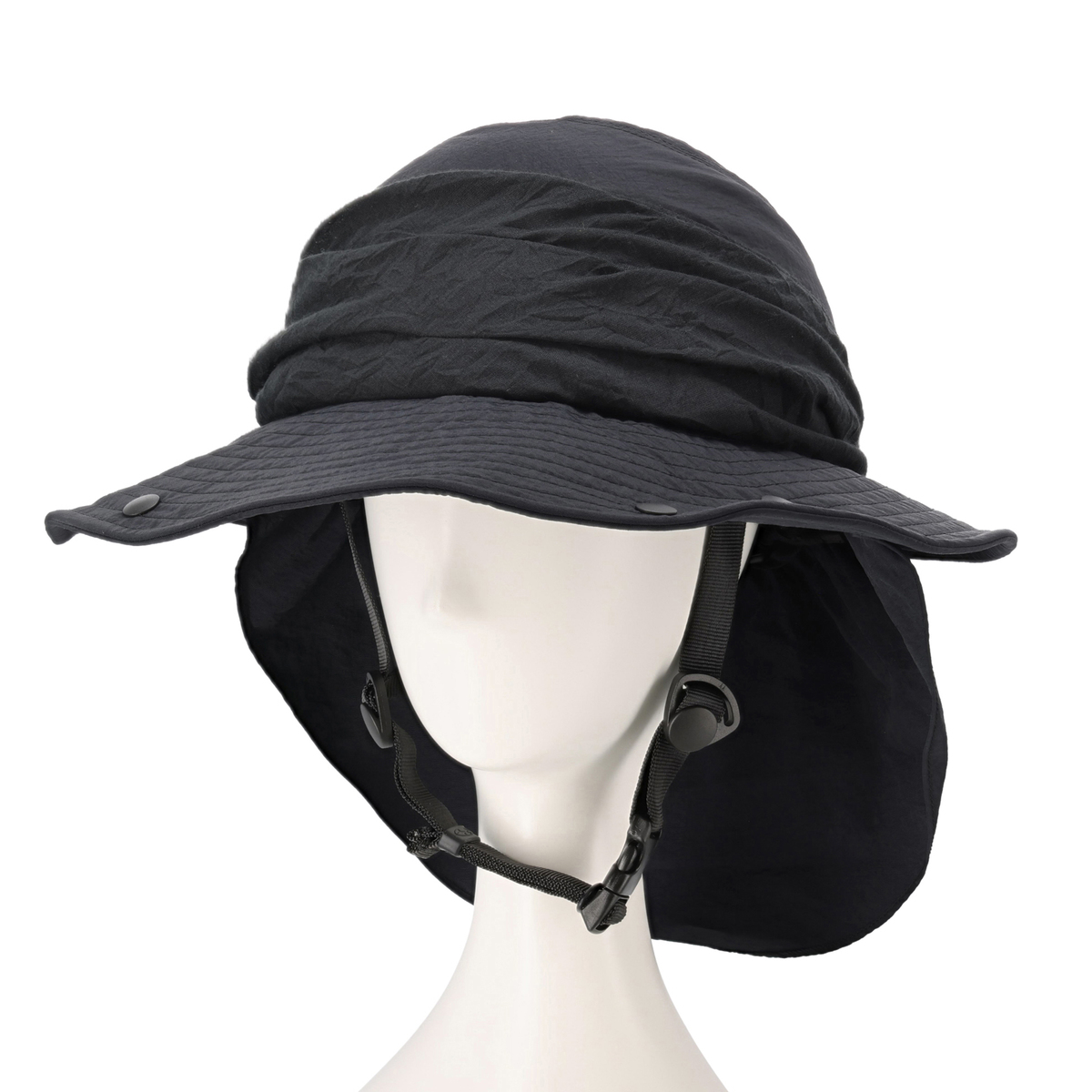 大きめのツバと、後ろの日除け布が特徴のサンハットタイプです。違和感なく使える帽子形状で、軽量コンパクトな設計。使用しない間は後部のボタン(ストッパー)で固定してリボンのような形になります