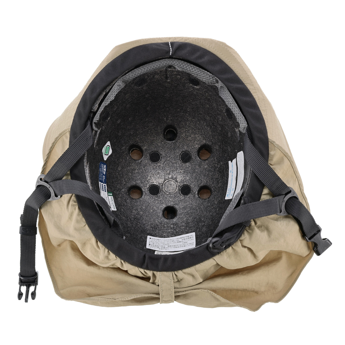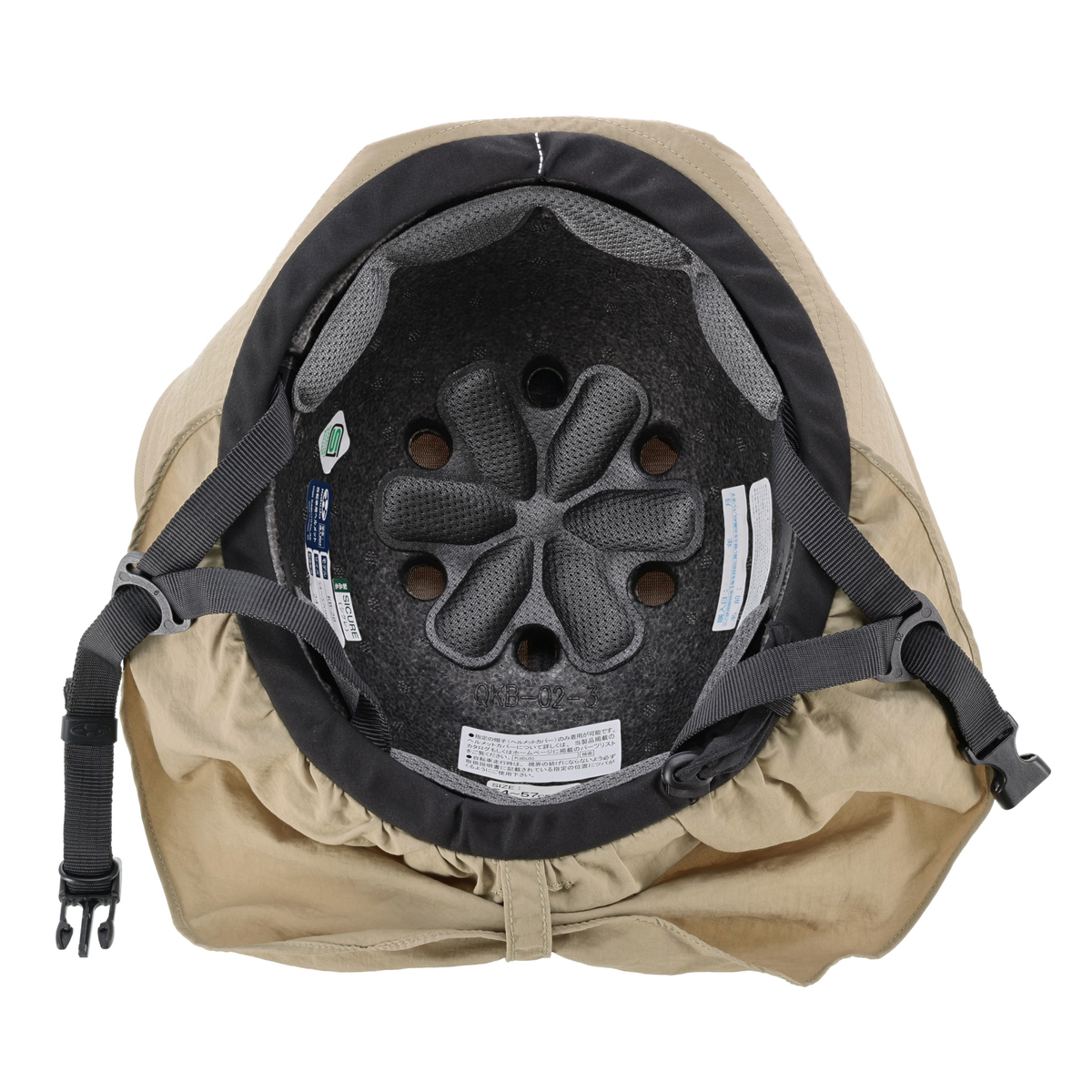 ボタンを使ったツバの跳ね上げ構造で、走行時のバタつきを抑え、視認性を確保。帽子カバーの縁にある紐を締めることで内部のヘルメットとしっかり密着します。SGマーク付きで、反射材も付いています