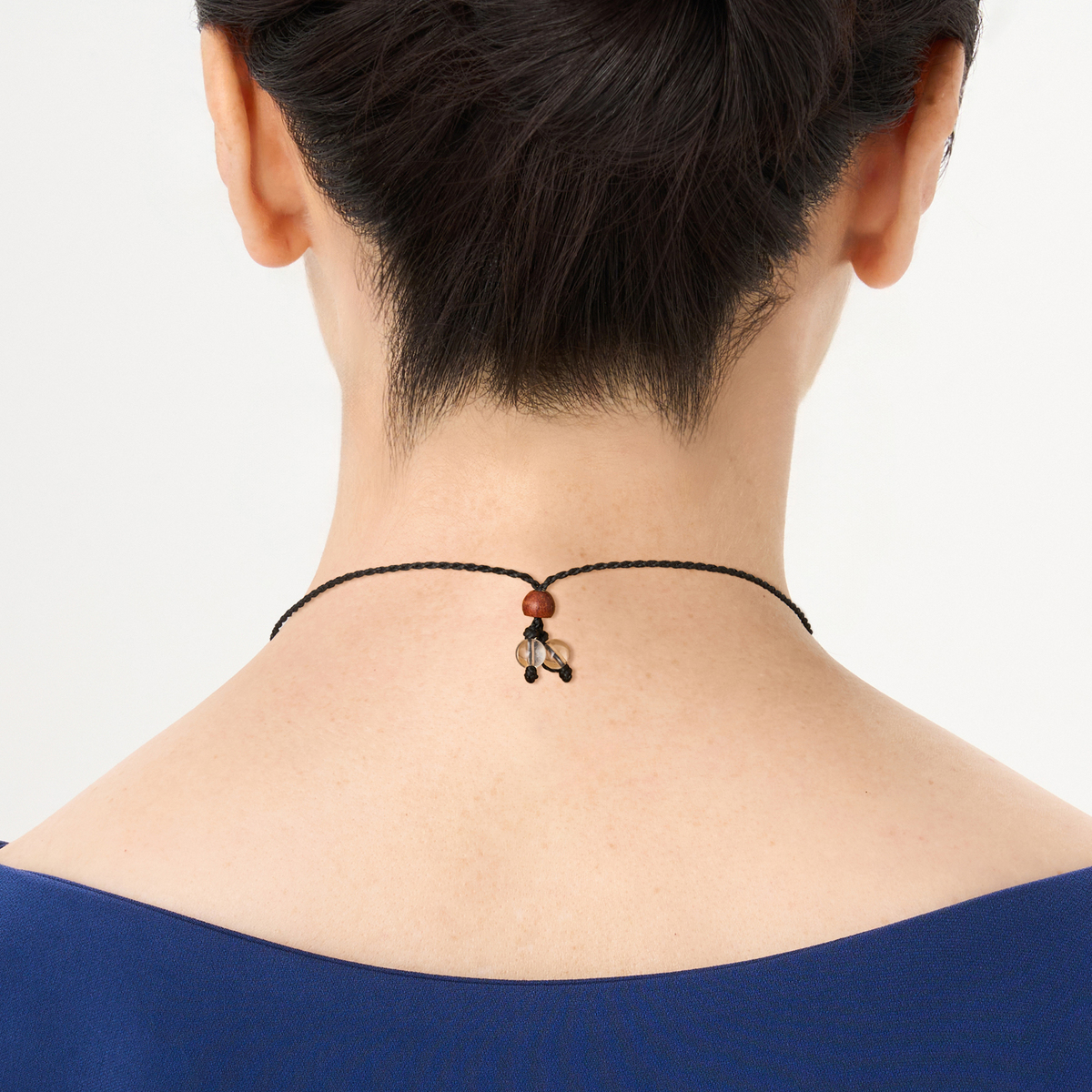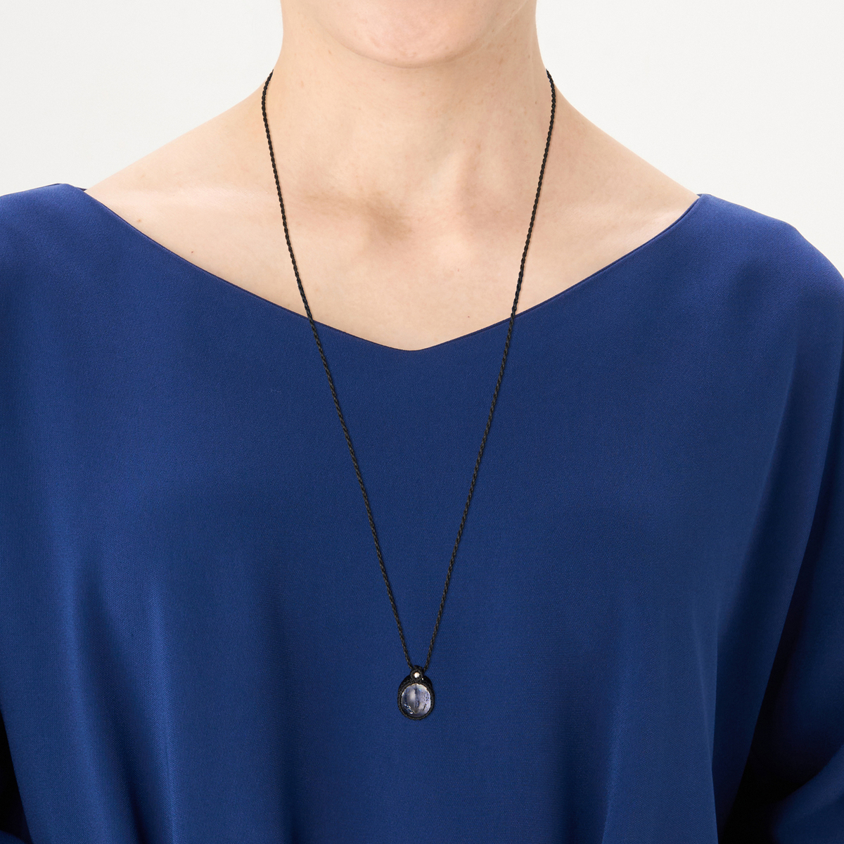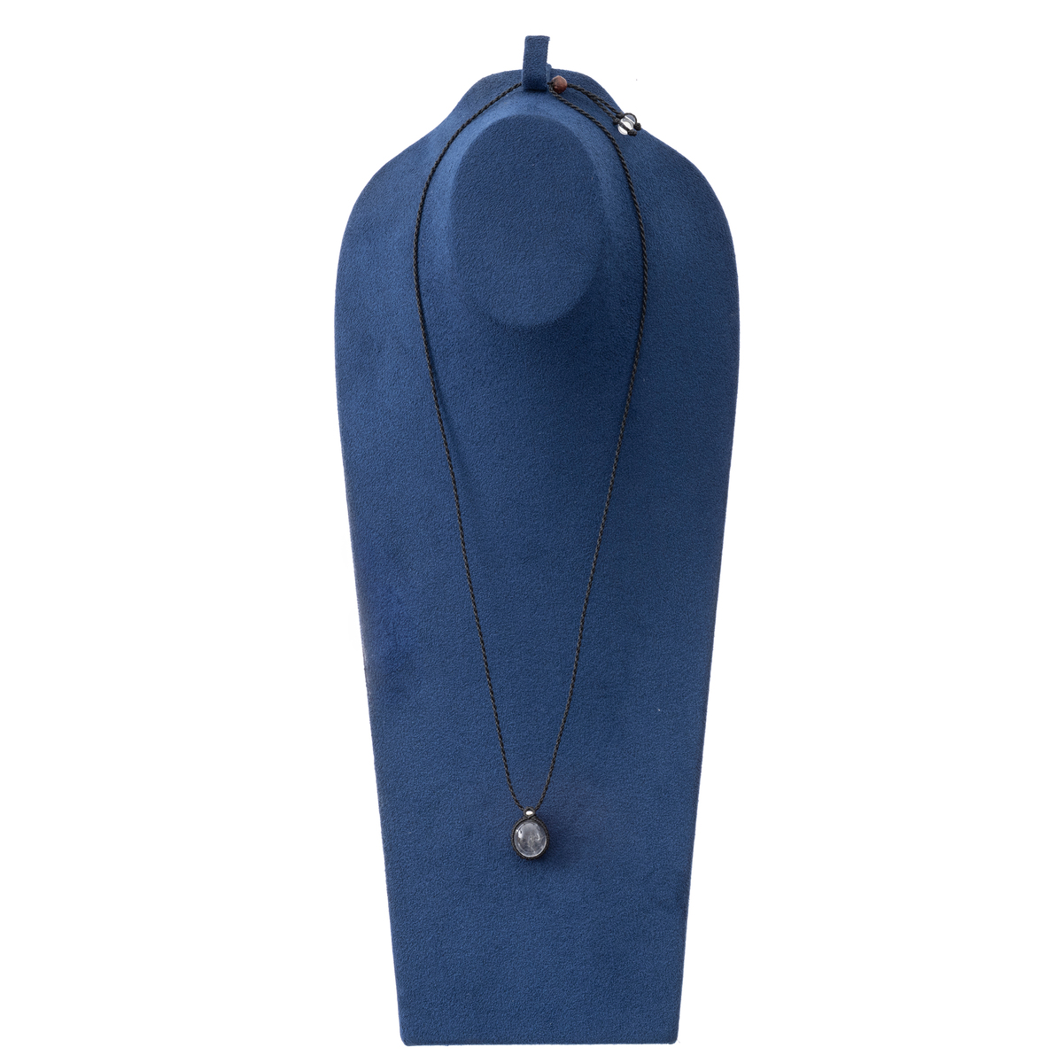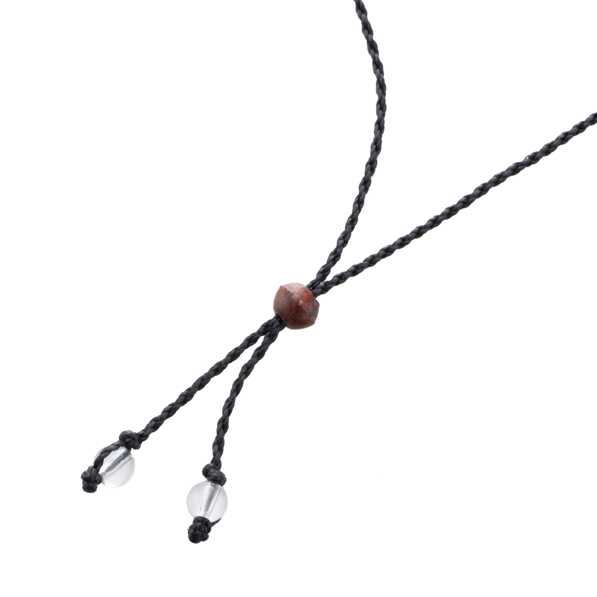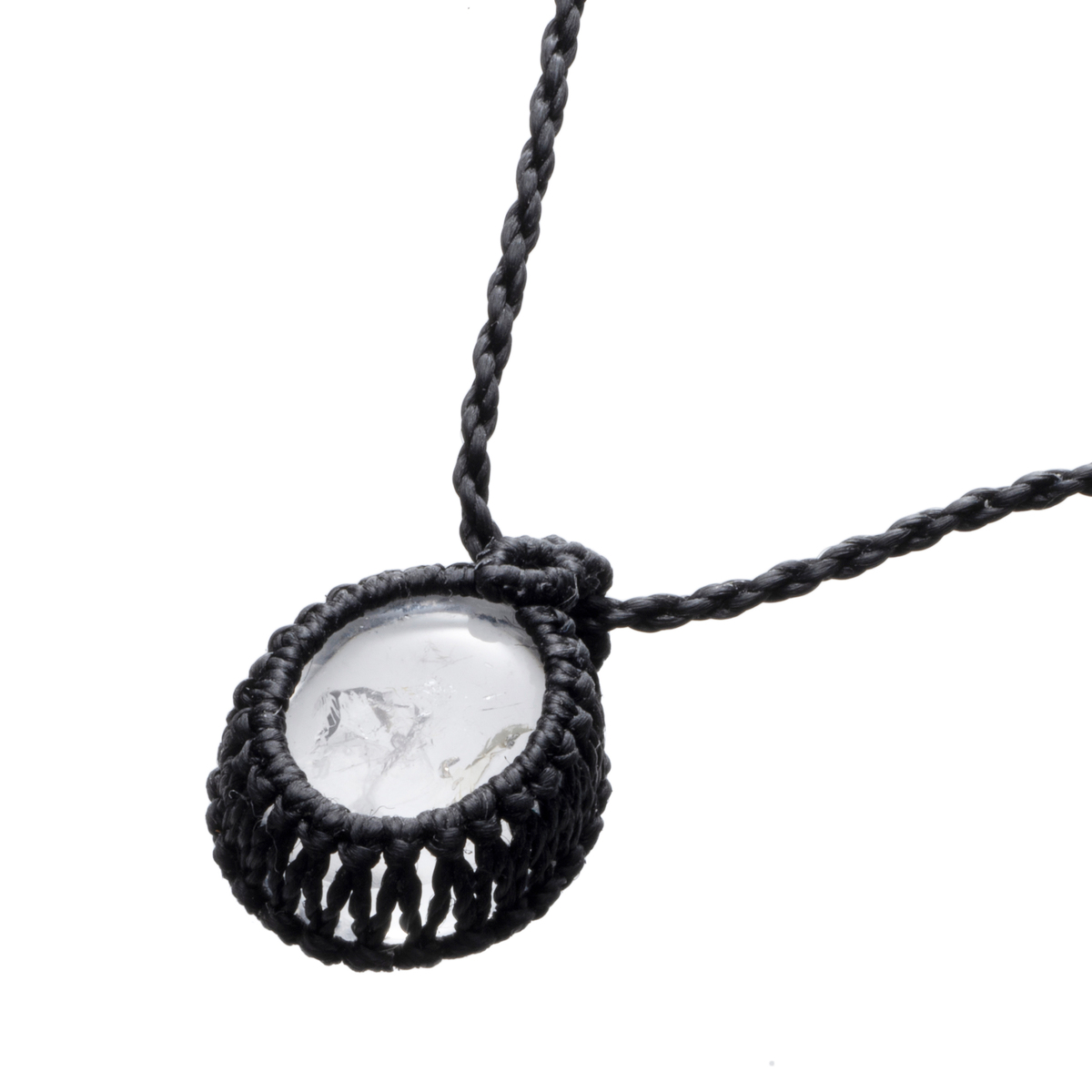 ファンシーシェイプ・カボションカットの水晶を蝋引き紐を用いたマクラメ編みで編み留めています。スライドして長さ調節ができ、装いに合わせて楽しめます