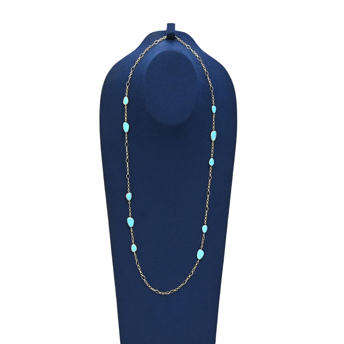 素材:[トルコ石] 不定形 ベゼルセッティング/接着 10石 合計12.00ctUP 総重量(約) 5.6g 長さ(約) 70.0cm 幅(約) 大:7.5mm(個体差有) 小:2.5mm チェーンの形状 デザイン 留具の形状 引き輪 アジャスターの有無 無 [地金]18Kイエローゴールド ■受注発注商品のためデザイン・価値に影響のない範囲で仕様が変わる場合がございます ■素材の大きさ・形・色合い、製品のサイズは1点1点多少異なります ■中空製品のため、強い衝撃を与えますと破損や変形の恐れがありますのでご注意ください 【日本製(トルコ石はアメリカ/アリゾナ州キングマン産)】