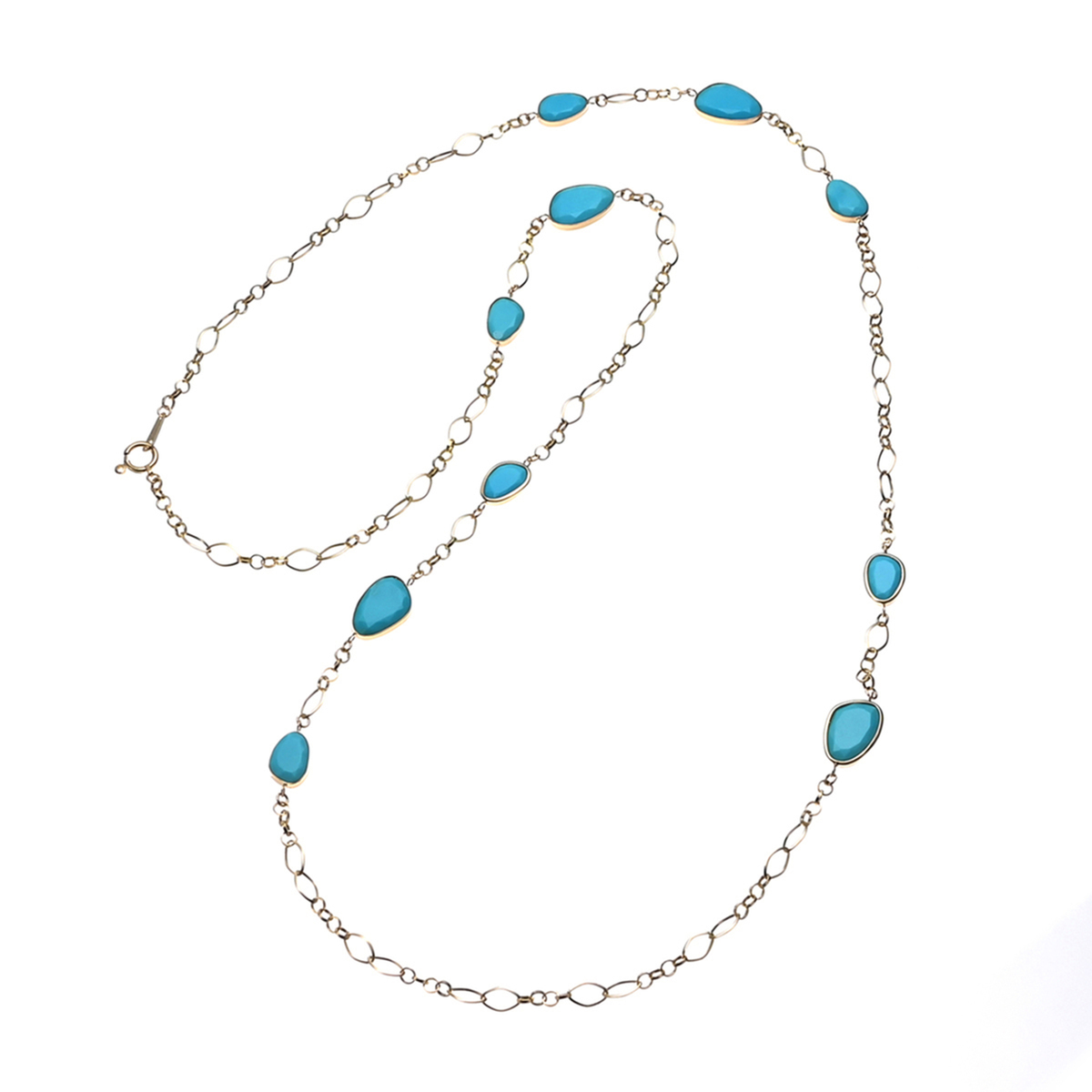 アメリカ合衆国・アリゾナ州キングマンにある鉱山で採れたキングマンターコイズのネックレス。手作業で金線を巻きつけたターコイズをステーション状に配した、ボリューム感たっぷりのロングデザイン。鮮やかなターコイズのブルーと18Kイエローゴールドの組合せがとても華やかです