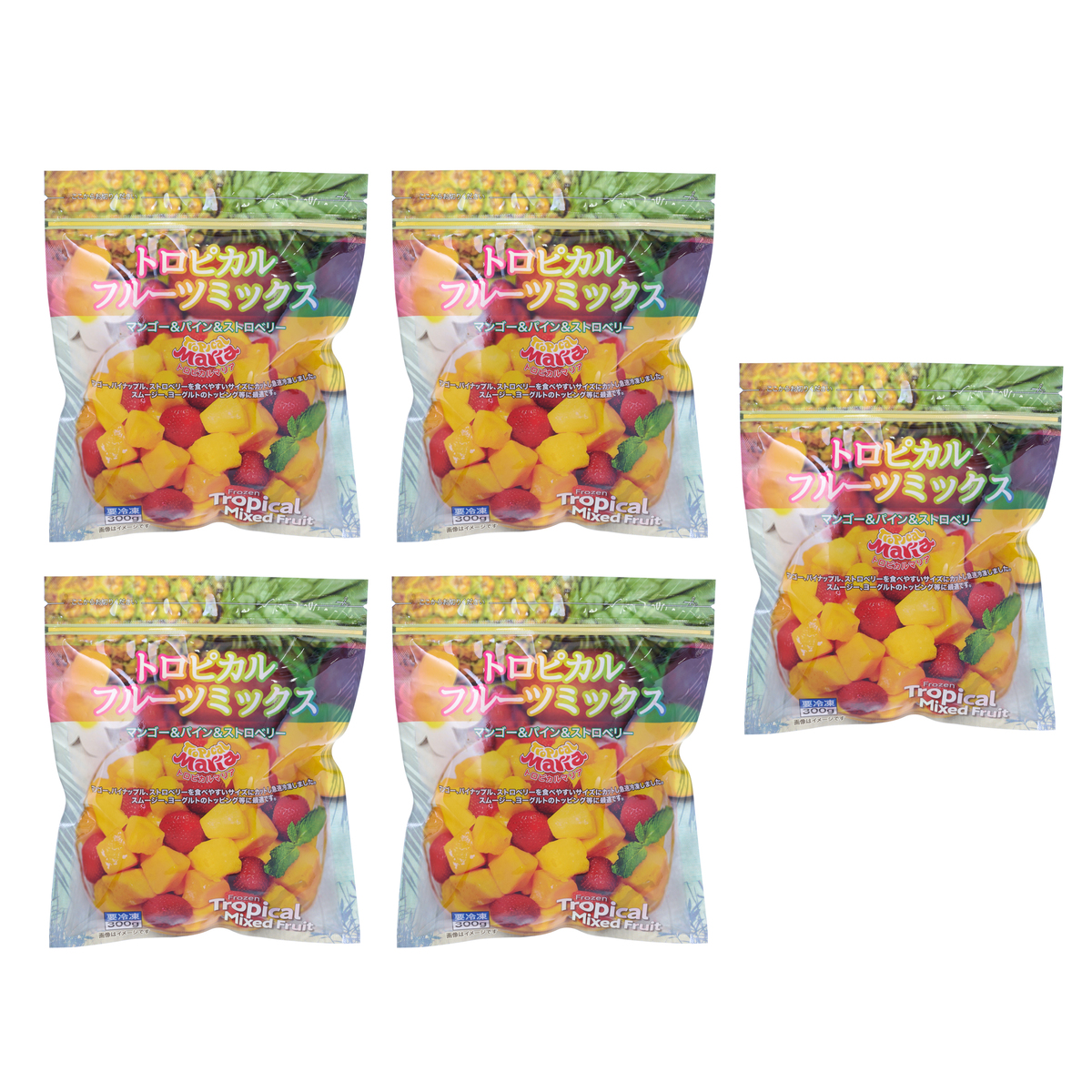 [アレルギー物質特定原材料8品目] なし [内容量] 300g×5袋 [賞味期限] 出荷時点で賞味期限まで240日以上ある商品をお届けします [保存方法] 開封前:冷凍(ー18℃以下)にて保管してください 開封後:開封後はお早めにお召し上がりください [お召し上がり方] 冷蔵庫または常温で半解凍し、そのままお召し上がりください。解凍後1時間を目安にお召し上がりください [注意事項] ※一度解けたものを再び凍らせると、味、品質、鮮度が落ちますのでご注意ください ※解凍後はすぐにお召し上がりください(解凍後1時間を目安にお召し上がりください) ※冷蔵庫内に保存すると庫内の匂いが付着する恐れがございますのでご注意ください [原料原産地] マンゴー(ペルーまたはベトナムまたはエクアドル) [原産国] 日本 [原材料] マンゴー(ペルーまたはベトナムまたはエクアドル)、パイナップル、ストロベリー