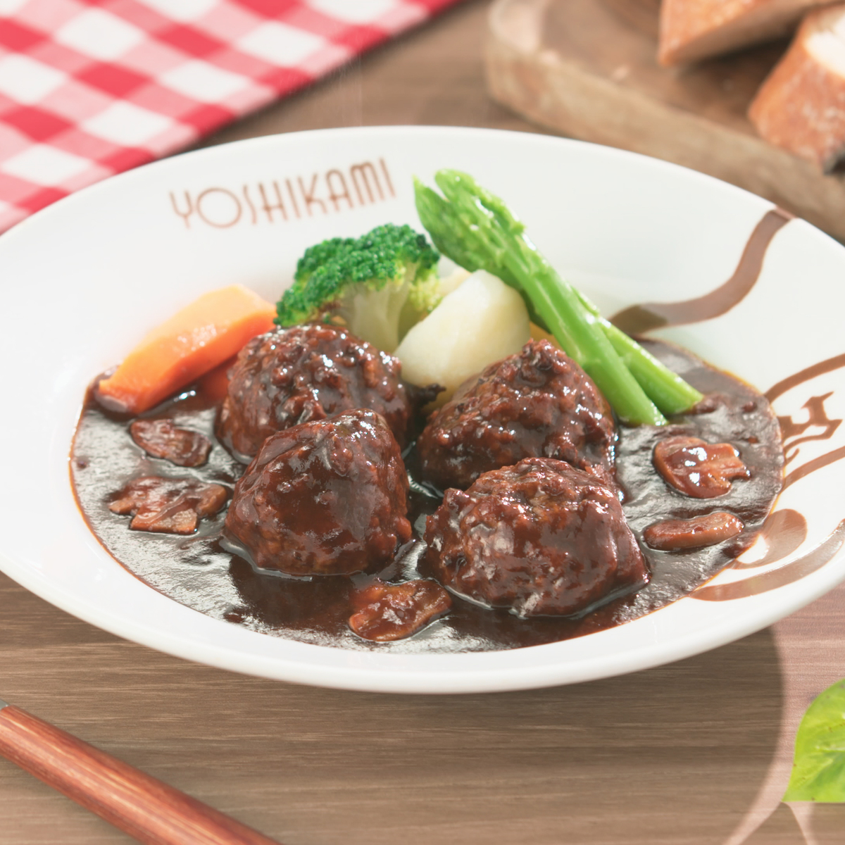 下町の老舗洋食屋「浅草ヨシカミ」より、ミートボールシチューをご紹介。お店でもメニューにある「ミートボールシチュー」をご家庭でも楽しめるように商品化*。牛肉と豚肉を合わせた大ぶりなミートボールとデミグラスソース、マッシュルームを合わせた、ボリュームのあるシチューです