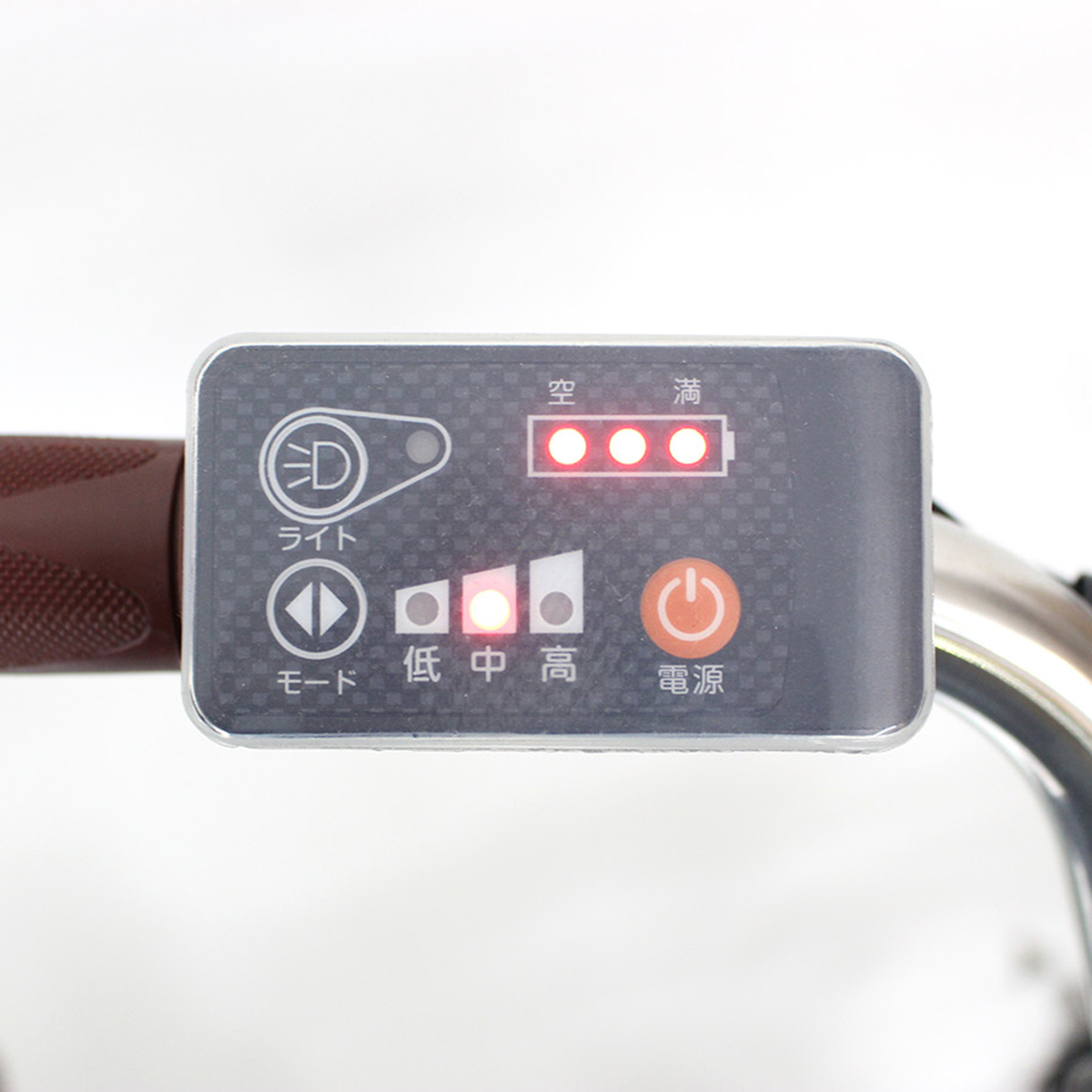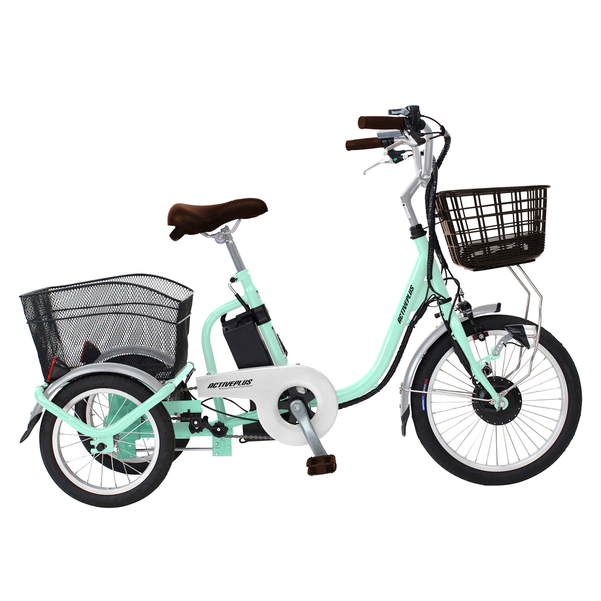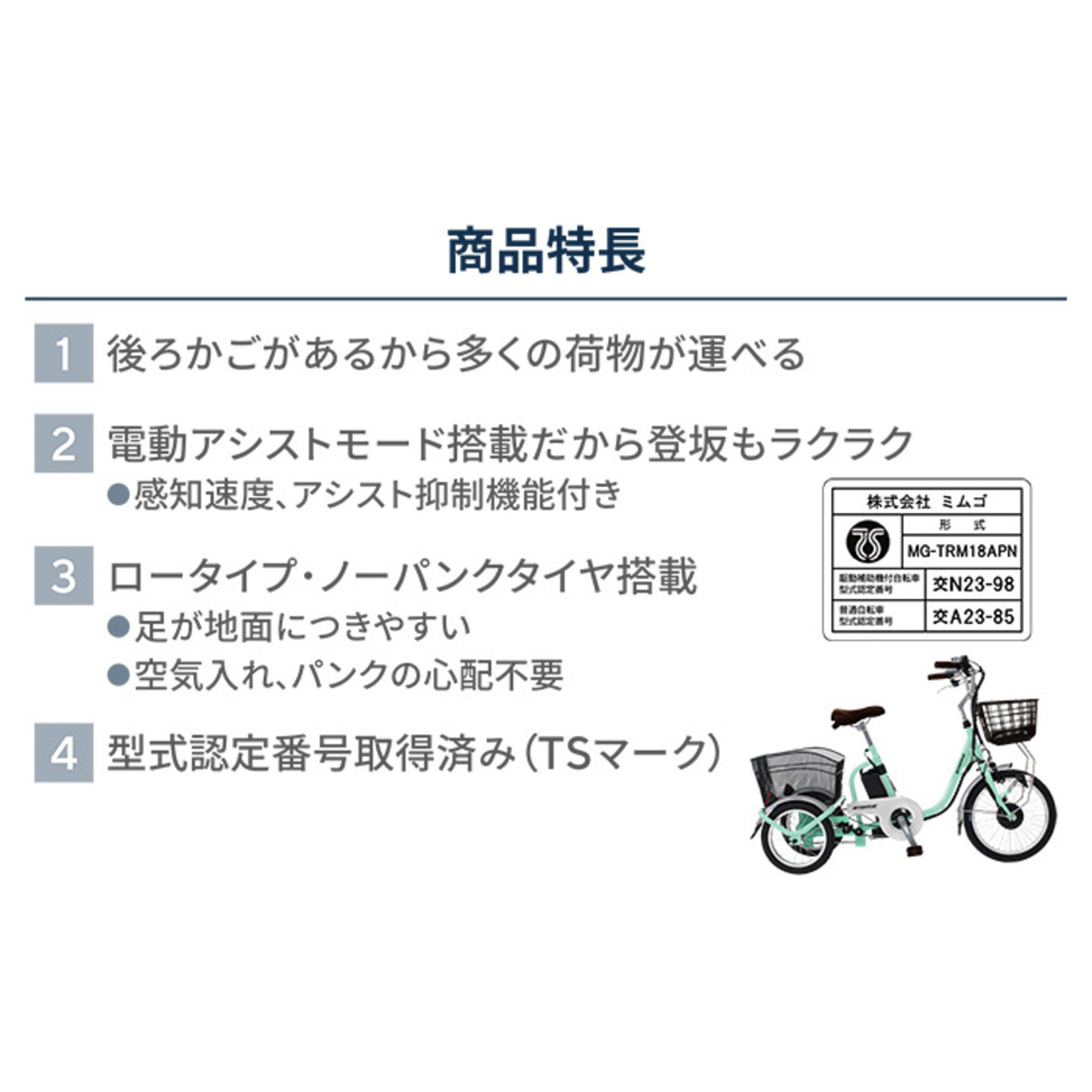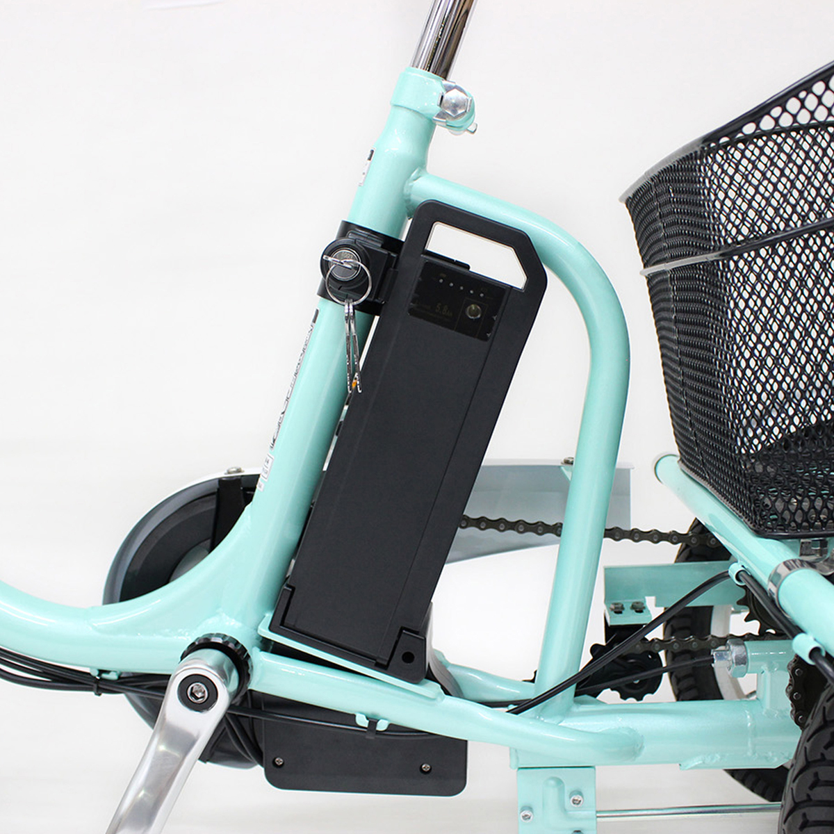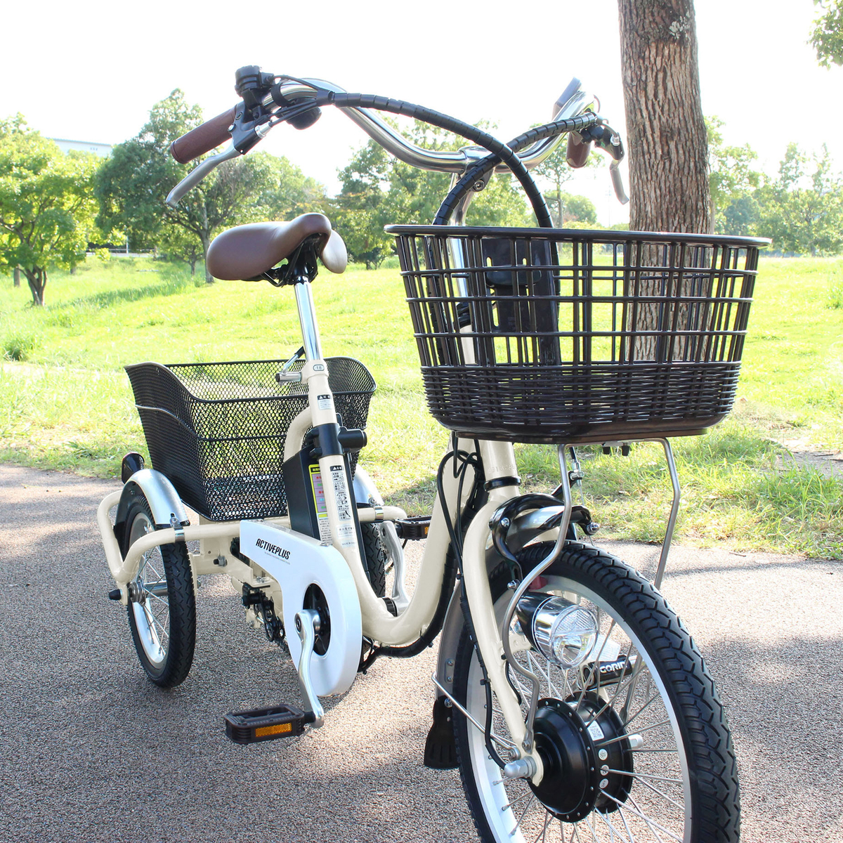 ロータイプの三輪自転車です。ペダルを踏む力に応じてモーターの補助的な力を加え、走行を助ける電動アシスト機能付き。満充電で走行できる距離の目安は、中モードの場合で約25kmです(*1)。電動アシスト機能が働かない場合(*2)も、普通の自転車として走行できます