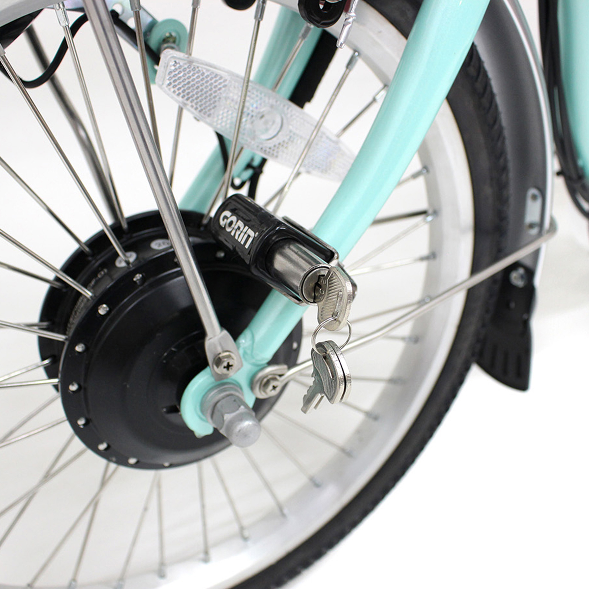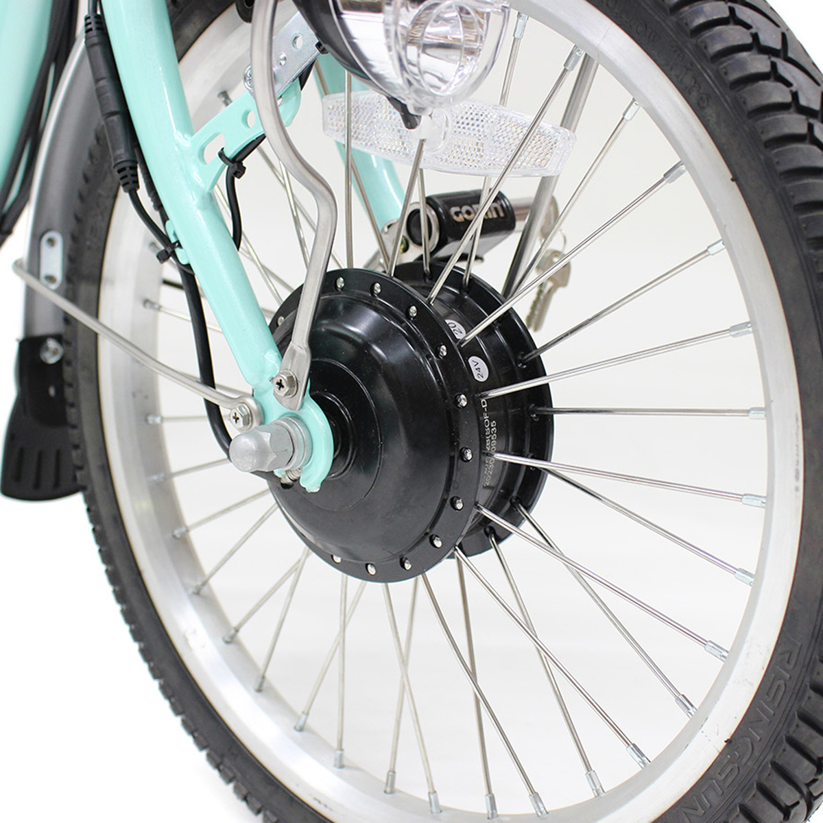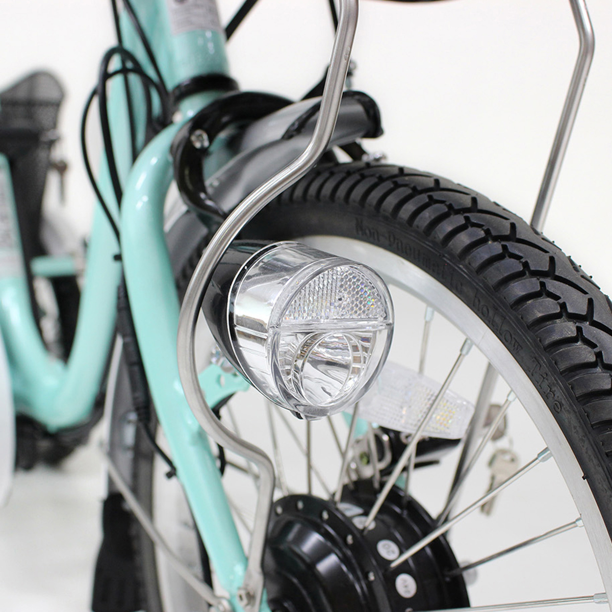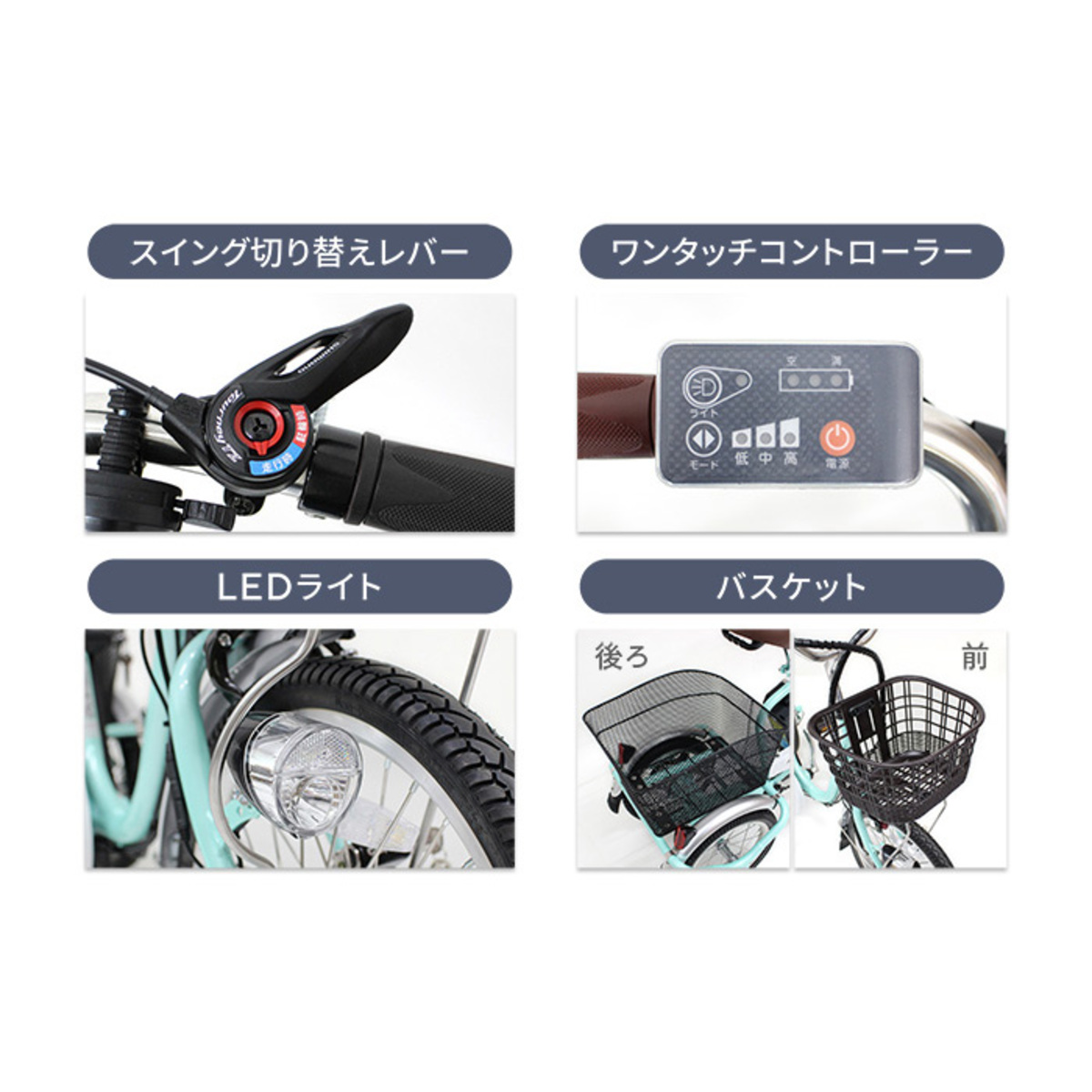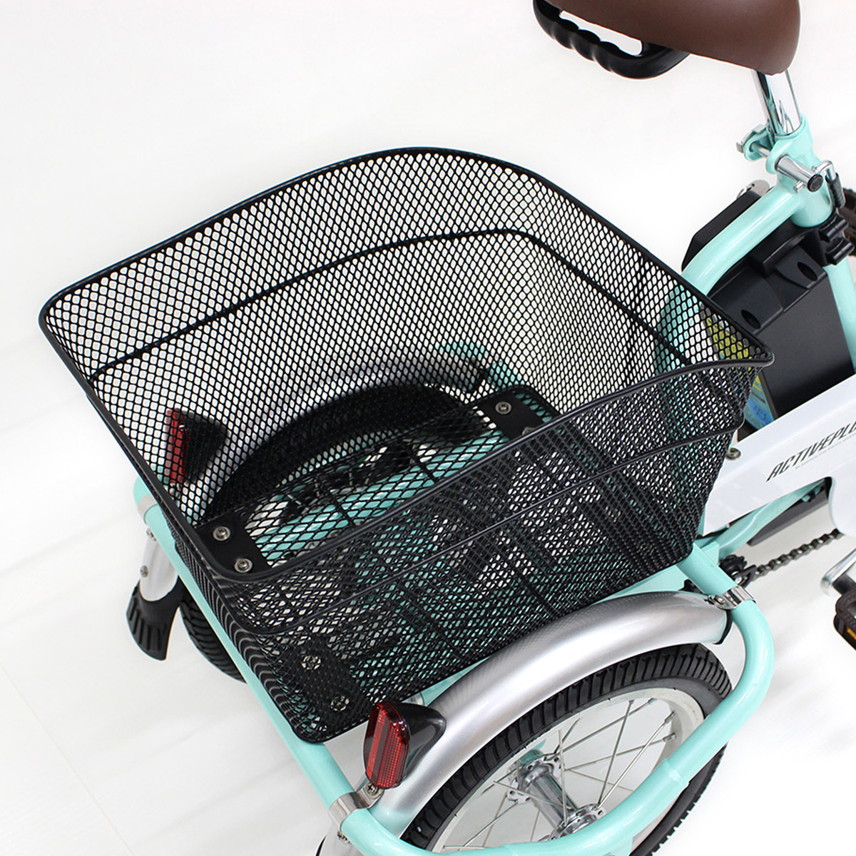 ロータイプの三輪自転車です。ペダルを踏む力に応じてモーターの補助的な力を加え、走行を助ける電動アシスト機能付き。満充電で走行できる距離の目安は、中モードの場合で約25kmです(*1)。電動アシスト機能が働かない場合(*2)も、普通の自転車として走行できます