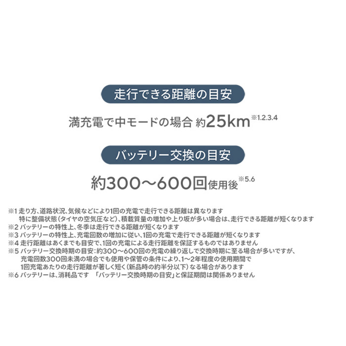 *3)バッテリー交換時期の目安として、約300〜600回の充電の繰り返しで交換時期に至る場合が多いですが、充電回数が300回未満の場合でも、ご使用や保管の条件により、1〜2年程度の使用期間で一回充電あたりの走行距離が著しく短く(新品時の約半分以下)なる場合があります