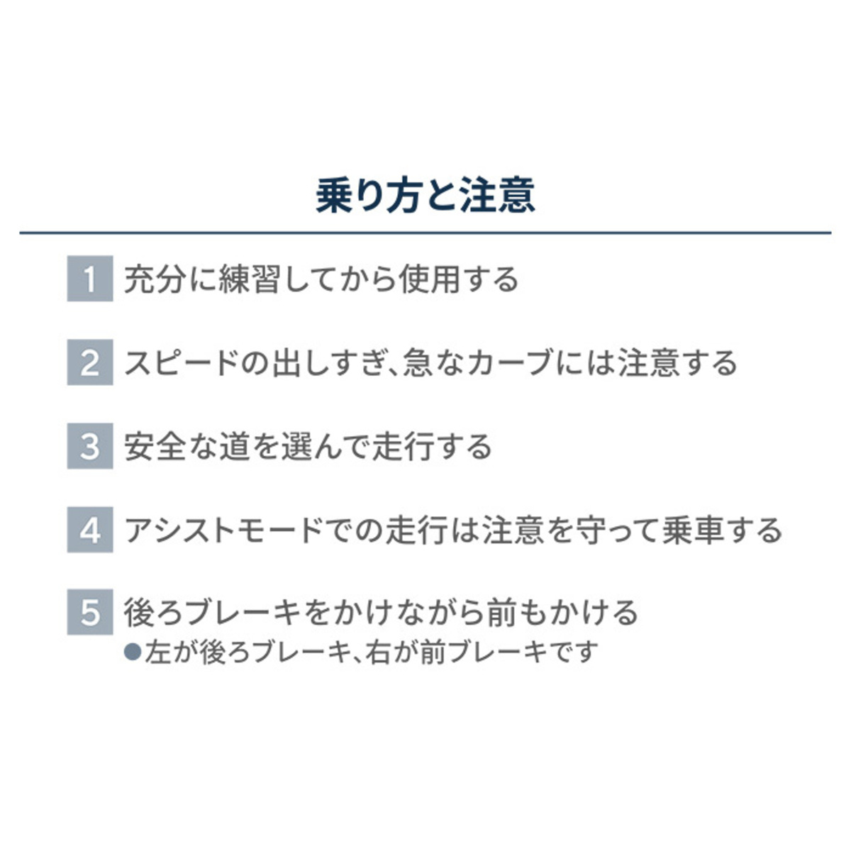 [商品内容] ・本体・充電器・簡易工具二種(スパナ、六角レンチ)・ハブキャップ(後輪の両端ナット部に取付)・ステムキャップ(ステムのネジ穴に取付)・バッテリー用キー×3・前輪ロック用キー×3 ※組立て式 [サイズ] 幅140×奥行58×高さ95.5cm サドル高さ:約67.5〜84.5cm ※適用身長:約130cm〜 [重量] 約30kg [充電時間] 約3.5時間 [走行距離] 約30km(充電1回分/低モード時) [材質] スチール ■組立て式 ■取り扱い説明を充分にご確認の上、ご使用下さい 【中国製】 [注意事項] ※お客様ご自身による改造はしない。またモーターユニット、クランクセンサー(電動アシストシステム)の分解や注油もしない ※滑りやすい靴やかかとの高い靴などをはいて乗らない ※幼児を乗せない ※飲酒時や風邪薬を服用した時、体調が悪い時は乗らない ※下り坂や雨の日、濡れた路面ではスピードを出しすぎない ※荷物を手やハンドルに引っ掛けたりペットをつないだりして乗らない ※二人以上で乗らない ※走行中に手や足でライトの照射角度を調整しない ※前ブレーキだけのブレーキ操作はしない ※巻き込まれやすい服装で乗らない ※滑りやすい所(積雪、凍結した道、鉄板の上やぬかるみ等)では乗らない。また風の強い時も乗らない ※外部の音を遮断した状態で乗らない ※サドルやハンドルの引き上げ限界線が見える状態では乗らない ※組み立て前の三輪自転車や未調整の三輪自転車には乗らない ※車輪の着脱後やサドルとハンドルの調整後は締め付けを確認してから乗る ※異常がある場合は乗らない ※乗車するときは自転車用ヘルメットを着用する ※傘やステッキ、釣り竿等を下げたり差し込んだりして乗らない。またスポークの間にボール等を挟まない ※カーブを走行する時は曲がる側のペダルを下げない ※停車中にペダルを強く踏み込まない ※乗車前は前後ブレーキ操作、ハンドル・車輪の固定、タイヤの空気圧等を点検する ※ブレーキシュー、タイヤ、リムには絶対に注油しない ※自動車の横を走行する時は安全を確認する ※回転している部分(車輪、チェーン等)には手や足、物を近づけない ※三輪自転車を走行以外の目的(腰かけや踏台の代わり等)で使用しない ※走行中はリモコンのスイッチ操作をしない。表示ランプ等を注視しない ※スピードを出しすぎたまま急ハンドル操作をしたり急カーブを曲がったりしない ※バッテリーを本体から外すときはハンドルを持つ ※坂道で駐停車をしない ※使用を開始してから二か月以内に必ず点検を行う ※荷物を載せるときは積載条件を守る ※走行中に異音がしたり三輪自転車が転倒し水に浸かったりする等の異常が発生した場合直ちに使用を中止し自転車店またはカスタマーサービスに相談する ※停車している時はペダルに足を乗せず前後輪ブレーキをかける ※1年ごとに以下の点検、交換を行う ・ブレーキワイヤ/ブレーキレバー/チェーン/タイヤ/ブレーキゴム ※水洗いはしない ※電動アシスト三輪自転車の発進特性に慣れるまで車通りや人通りの多い道で乗らない ※山岳、河川などでは絶対に使用しない ※部品が変形したまま使用しない ※凸凹の激しい所を走らない ※走行中ブレーキワイヤーを引っ張ったり曲げたりしない ※急ブレーキはかけない ※雨の時/服装(雨具)を整える。傘を持って片手運転は絶対にしない。雨合羽やレインコートを着る時は裾が引っ掛からないよう必ずセーフティバンド、輪ゴム、クリップ等で留める。雨の日はブレーキが効きにくくスリップしやすい為ゆっくり走る ※強風の時/ハンドルがふらつきやすく安全に運転できない為降りて押して歩く ※乱暴に運転したりアクロバット的な乗り方をしない ※夜間、トンネル、霧発生時等視界が悪い時は無灯火で乗らない ※子供が乗る場合はブレーキレバーに指が届いているか確認する。正しいブレーキのかけ方ができるまで繰り返し教える ※バッテリーを火に入れたり加熱したり分解、改造はしない ※バッテリーを落としたり衝撃を与えたり、端子間を金属などで接触させない ※専用のバッテリーの為他の機種や用途に使用しない ※バッテリーケースやバッテリーハンドルが破損したバッテリーは使用しない ※充電器のケース、コードやプラグが傷んだりコンセントの差し込みが緩い時は使用しない ※バッテリーを充電する場合は専用の充電器を使用する ※充電器の分解、改造はしない、専用電池(バッテリー)以外の充電には使用しない ※バッテリーに水や海水をかけたり水中に入れたりしない ※充電器を落下させたり衝撃を与えたりしない。またフロントバスケットに挟んだまま走行しない ※延長コードの使用、他の電気器具とのタコ足配線はしない