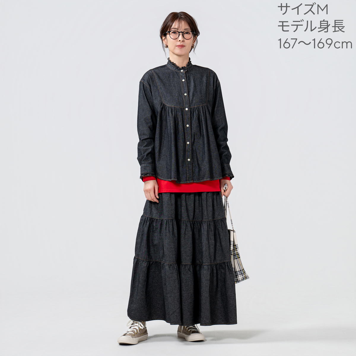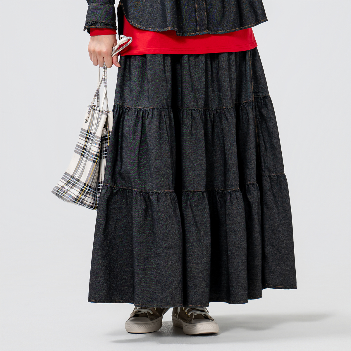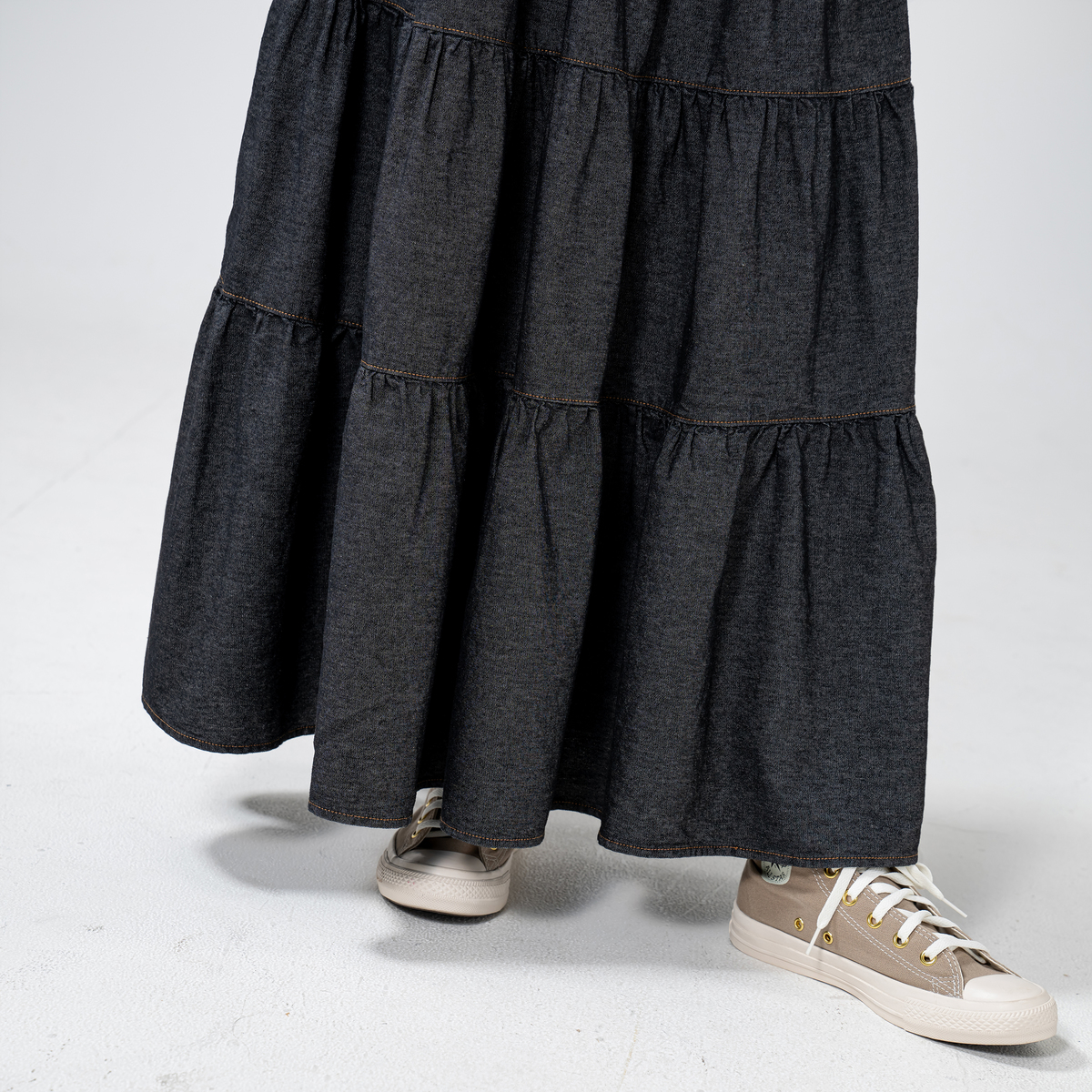 4段のティアード切替がフェミニンな印象を演出。程よいギャザーで広がりすぎず、バランスの良いボリューム感です。ステッチワークがデニムらしいアクセントになっています