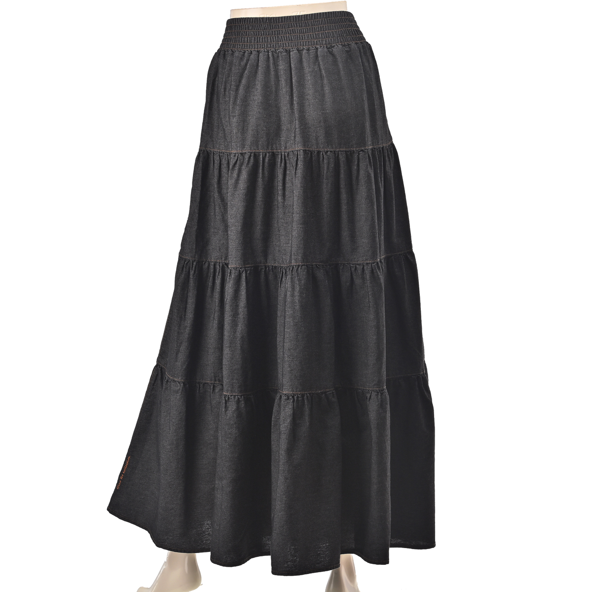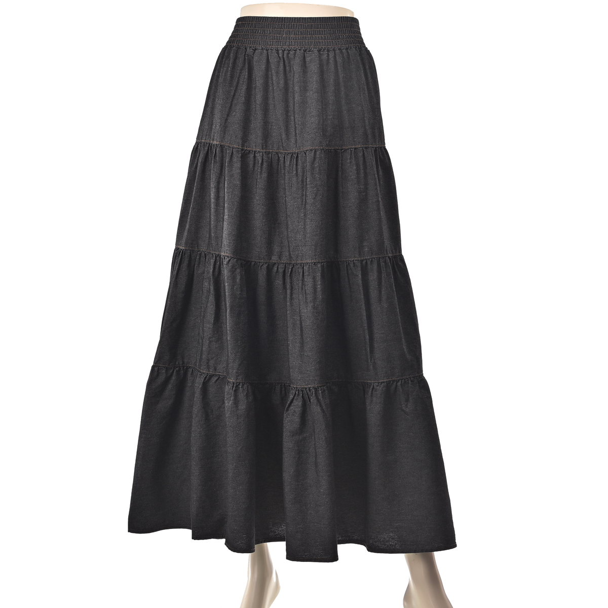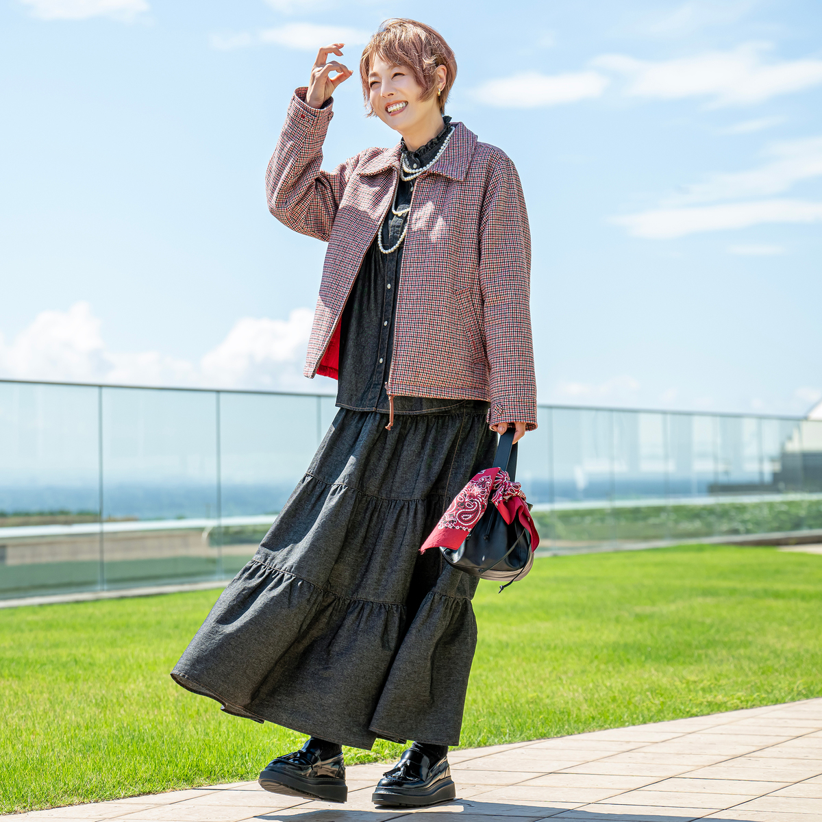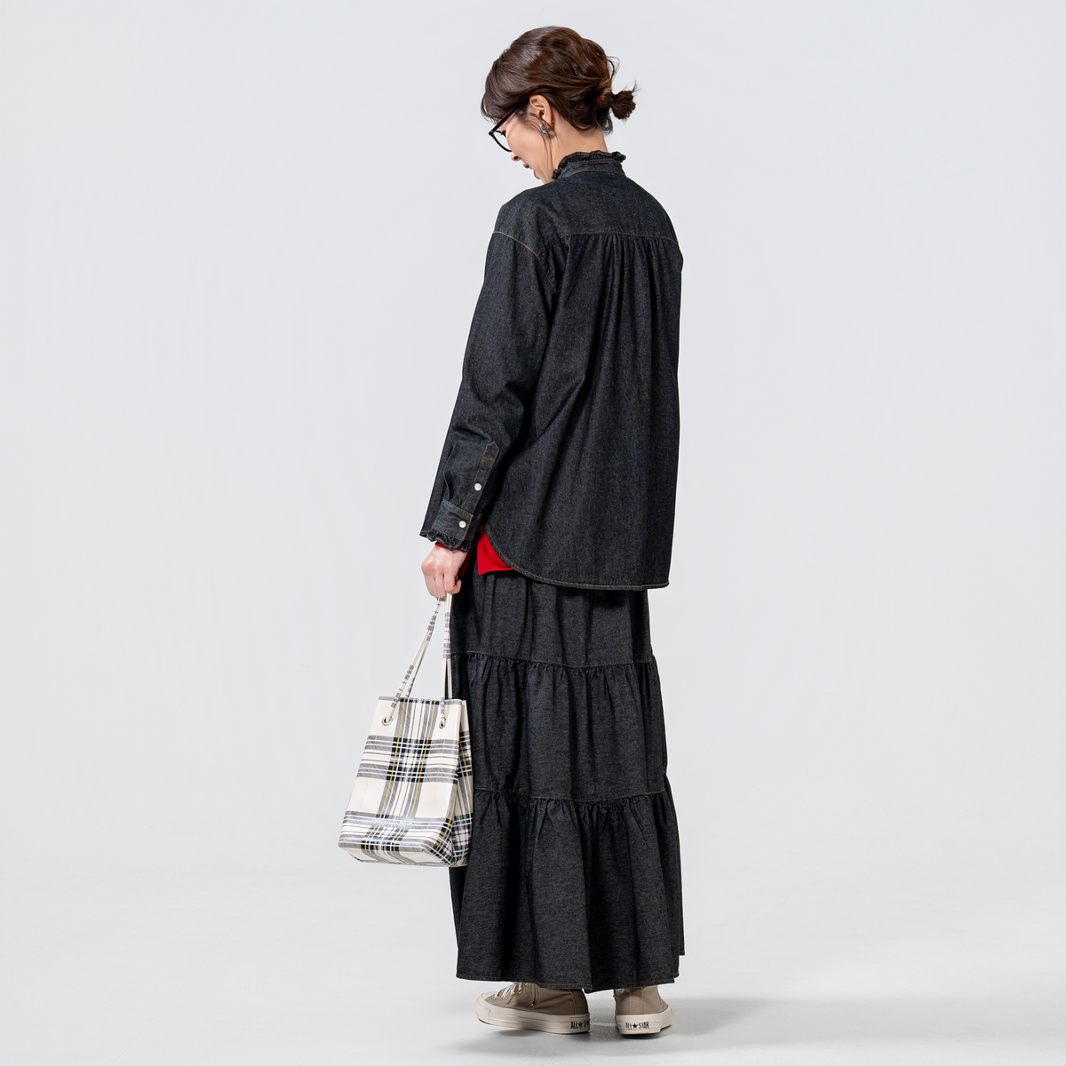 4段のティアード切替がフェミニンな印象を演出。程よいギャザーで広がりすぎず、バランスの良いボリューム感です。ステッチワークがデニムらしいアクセントになっています