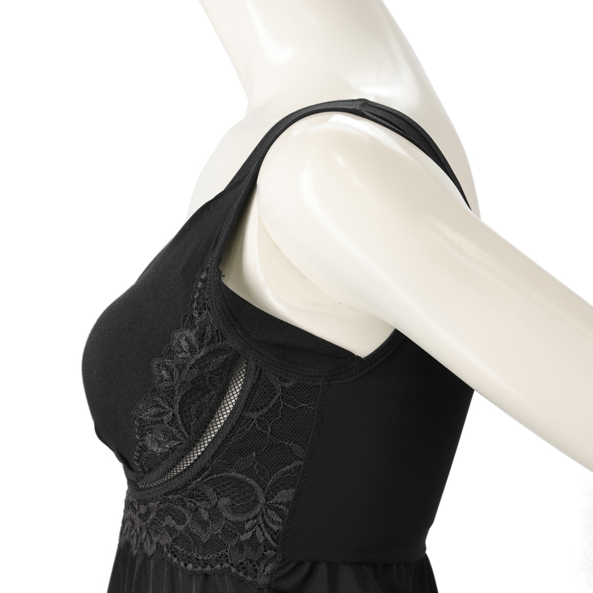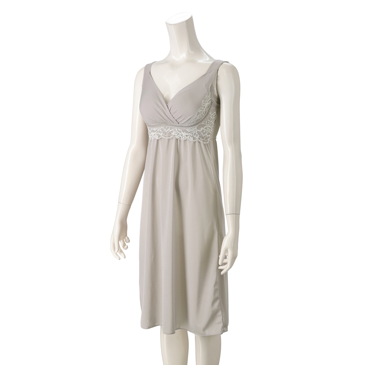 オリジナルパターンのノンワイヤーブラスリップ。すべりが良いトリコット素材のスカート付きなので、ワンピーススタイルにぴったりです。カップのサイドと前アンダー部分にオリジナルの光沢落下板レースを使用。ツタモチーフと繊細に光る透明感のある葉っぱ模様がラグジュアリー感を演出します
