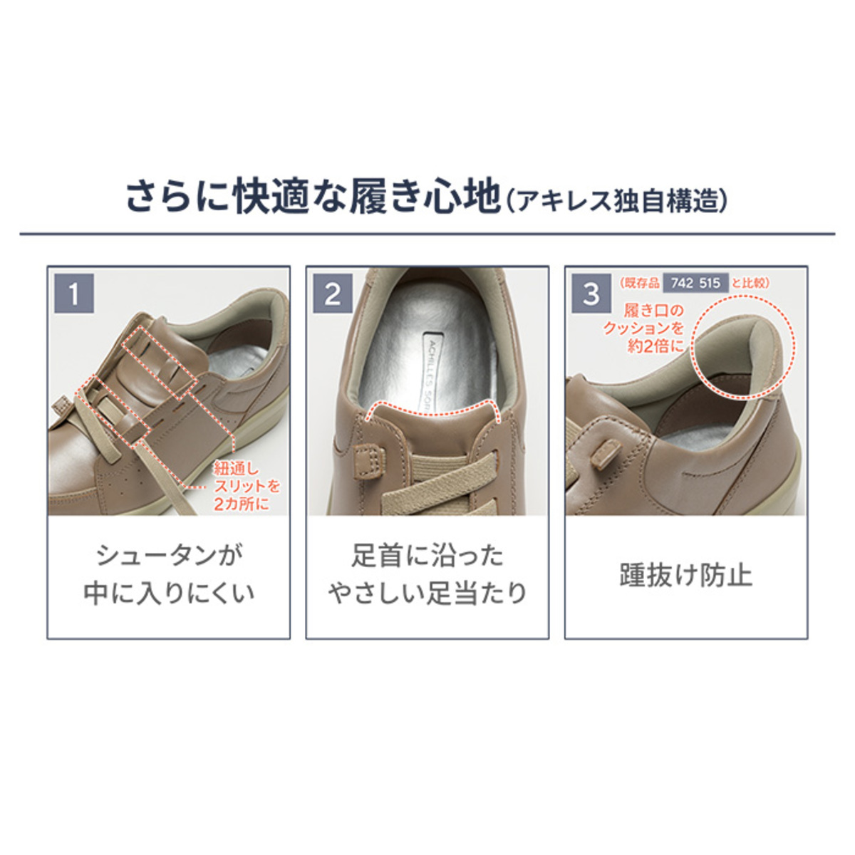 アキレス独自のクイックイン構造。カウンターと弾力性のある材料を組合せることで、程よい柔らかさがありつつ強度を保つ(つぶれにくい)ハンズフリー仕様となっています。履き口には滑りの良いなめらかな感触のライニング材を使用し、足入れがスムーズです