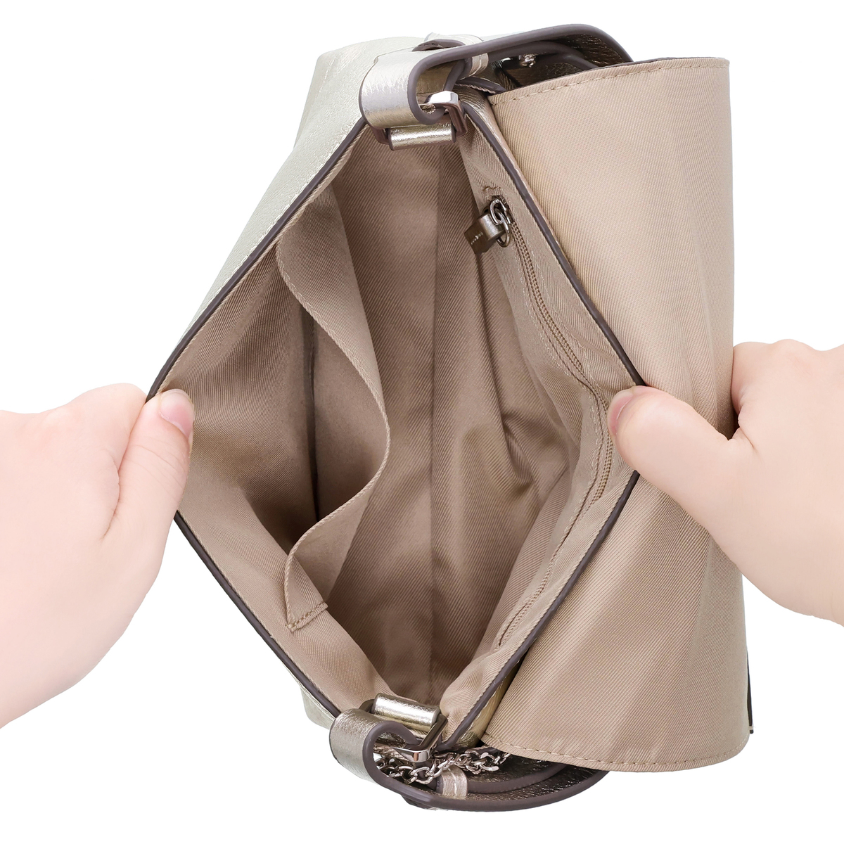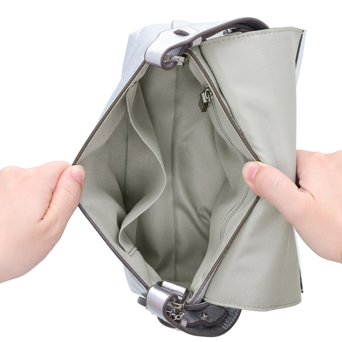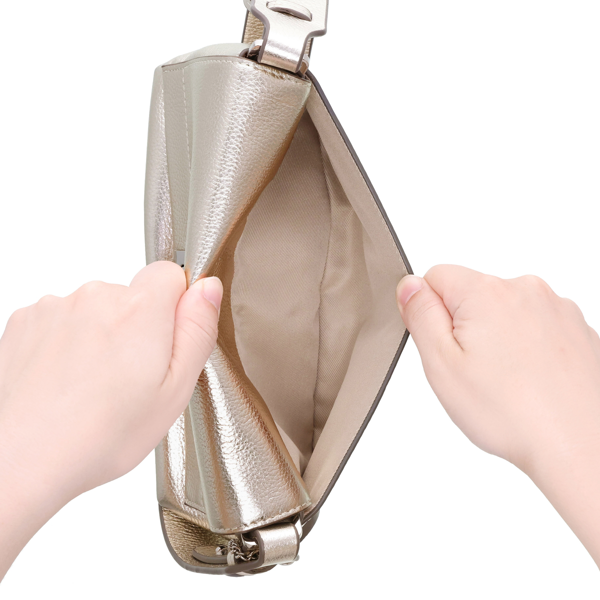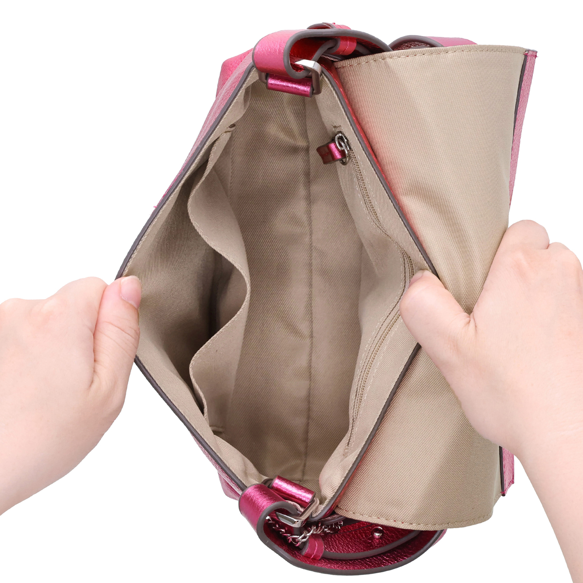[サイズ(約)] 縦13×横21.5×マチ8cm ショルダー立ち上がり:46〜60cm [重量(約)]※付属品含む 470g [素材] 牛革 ※裏地有 [仕様] 付属(取り外し可):チャーム×1 開閉:ひねり金具式 底ビョウ:無 [ポケット] 内側:オープンポケット×1、ファスナーポケット×1 外側:オープンポケット×1 [注意事項] ※この製品に使用している素材は摩擦や水濡れで色落ちすることがございます ※使用中、淡色のものへ色移りすることがございますのでご注意の上ご使用ください 【中国製】