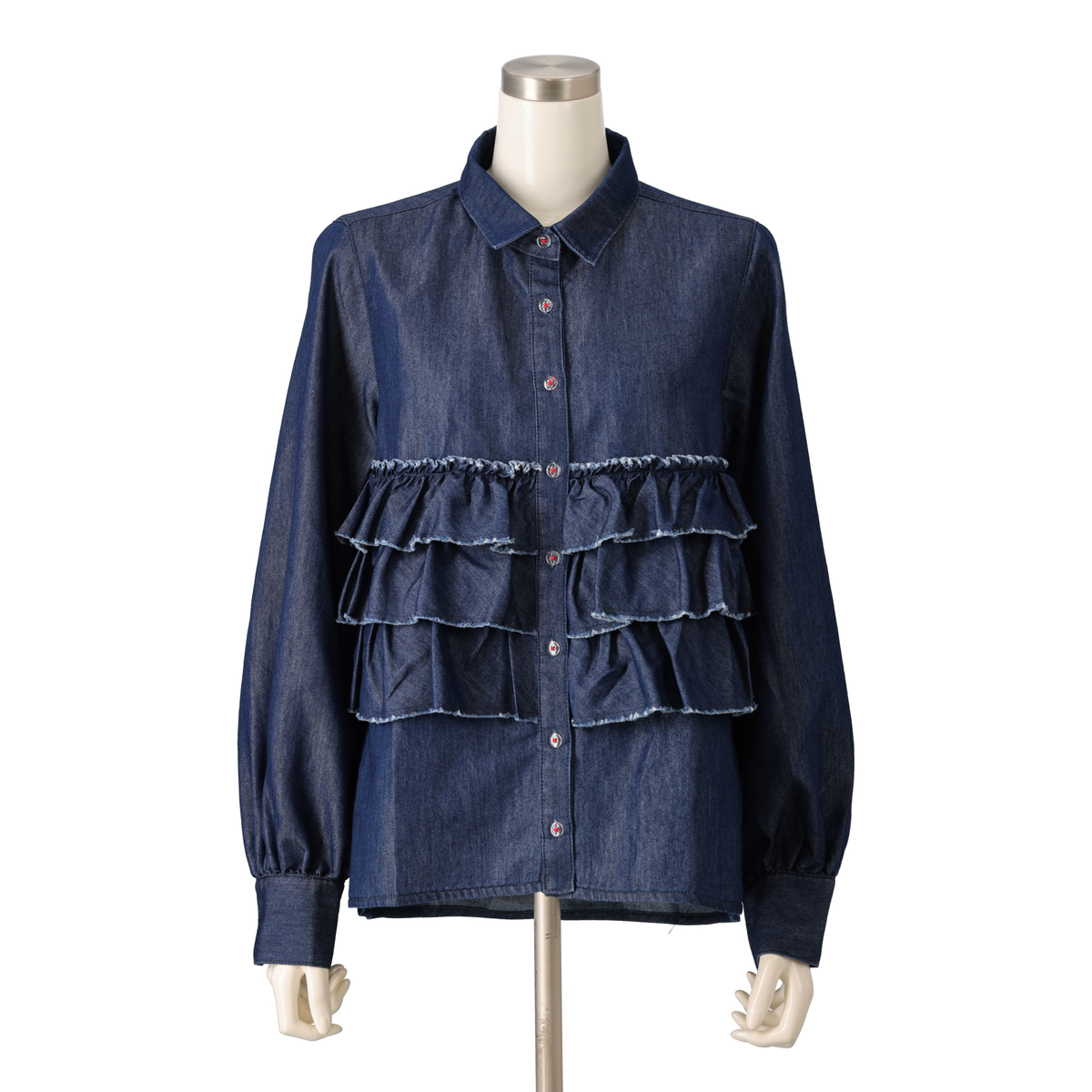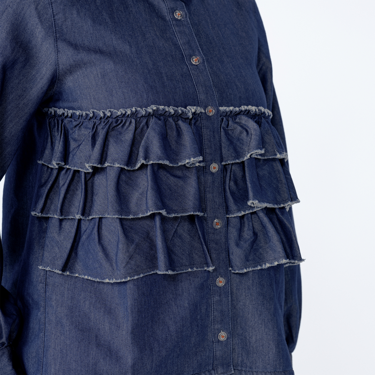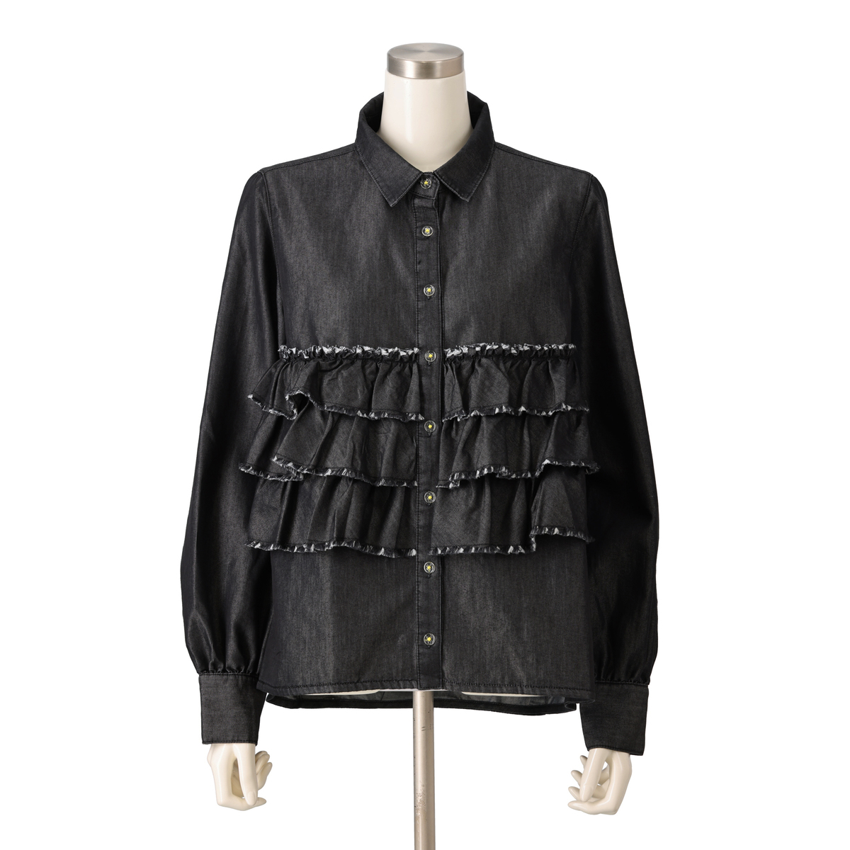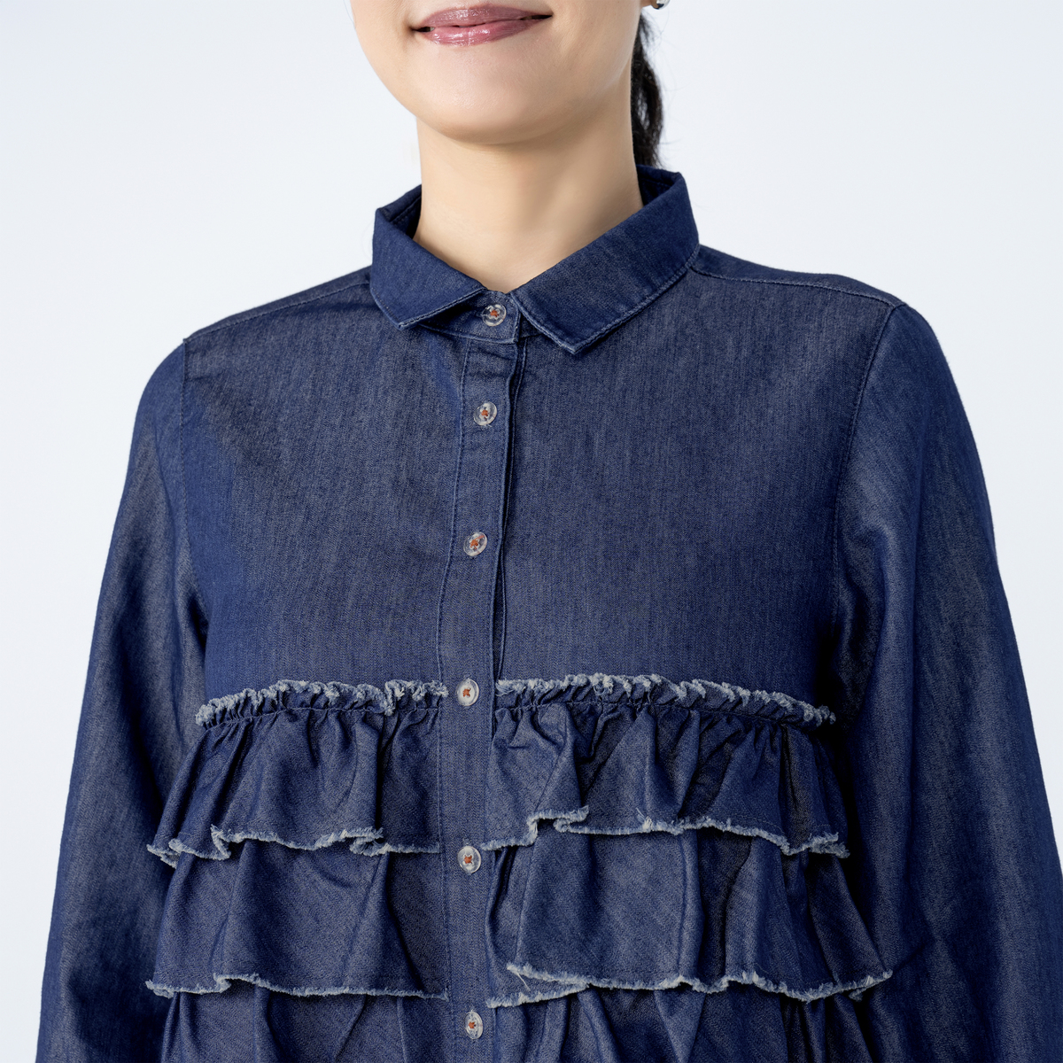 前身頃に贅沢な3段フリルをあしらったデニムシャツ。断ち切りデザインが可愛らしさのなかに、程よいラフさをもたらしてくれます