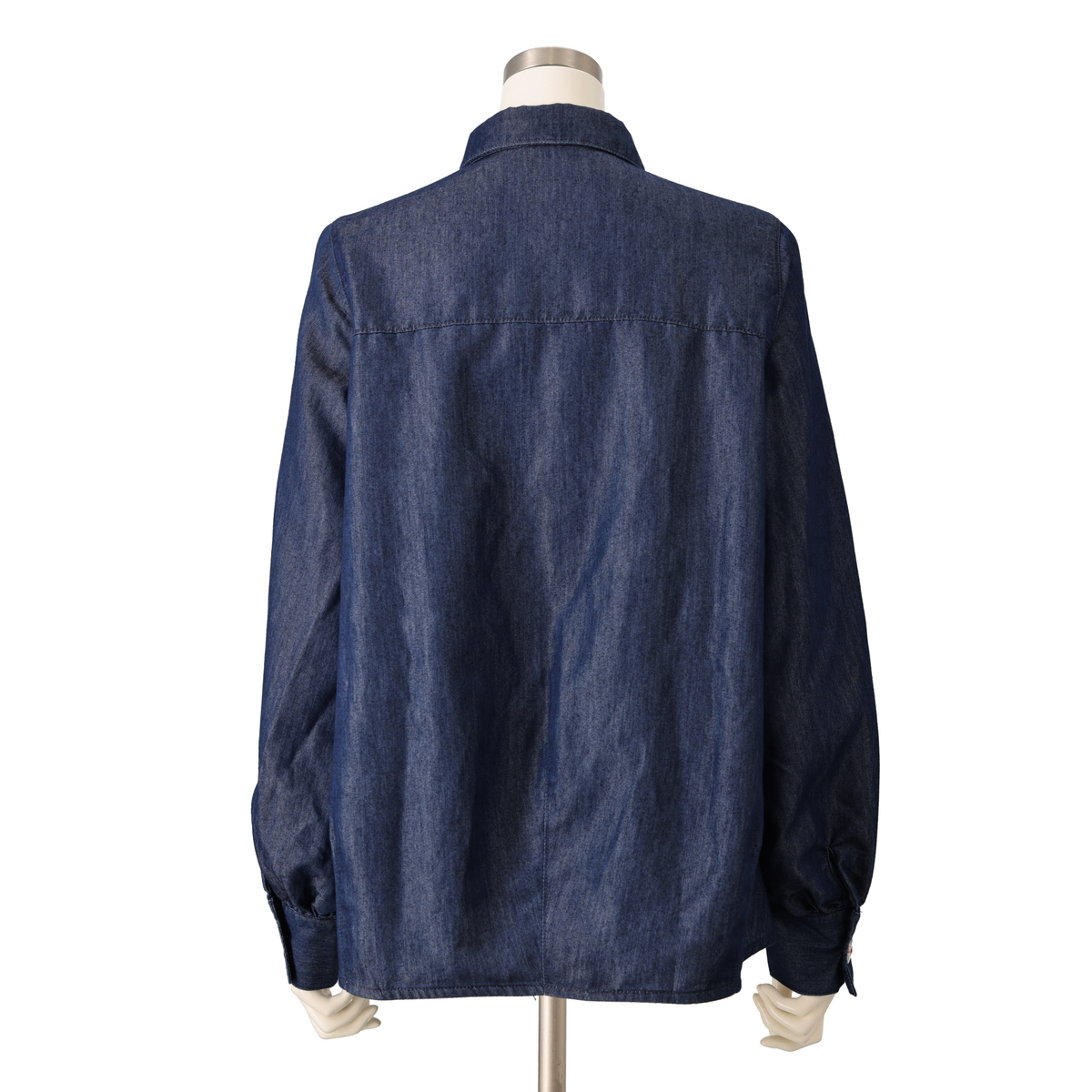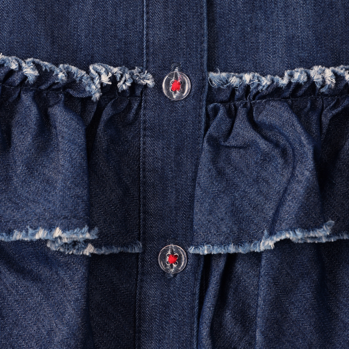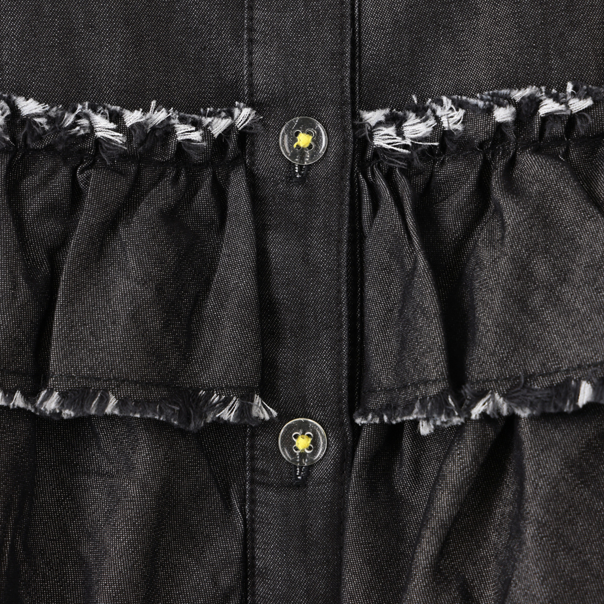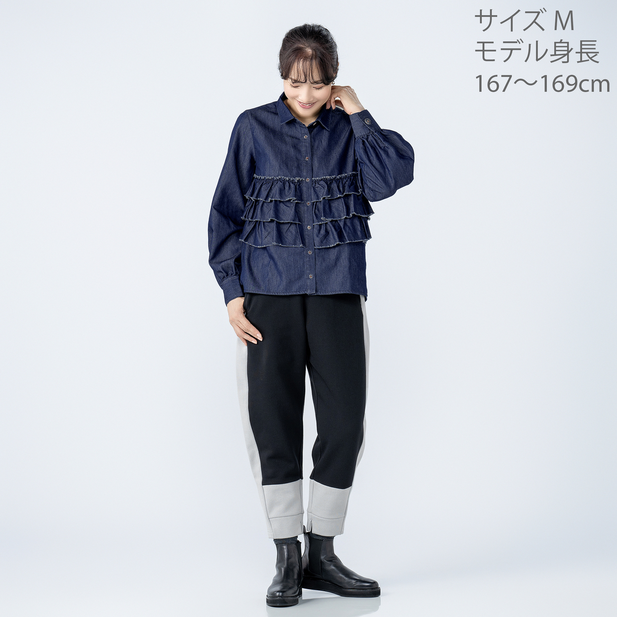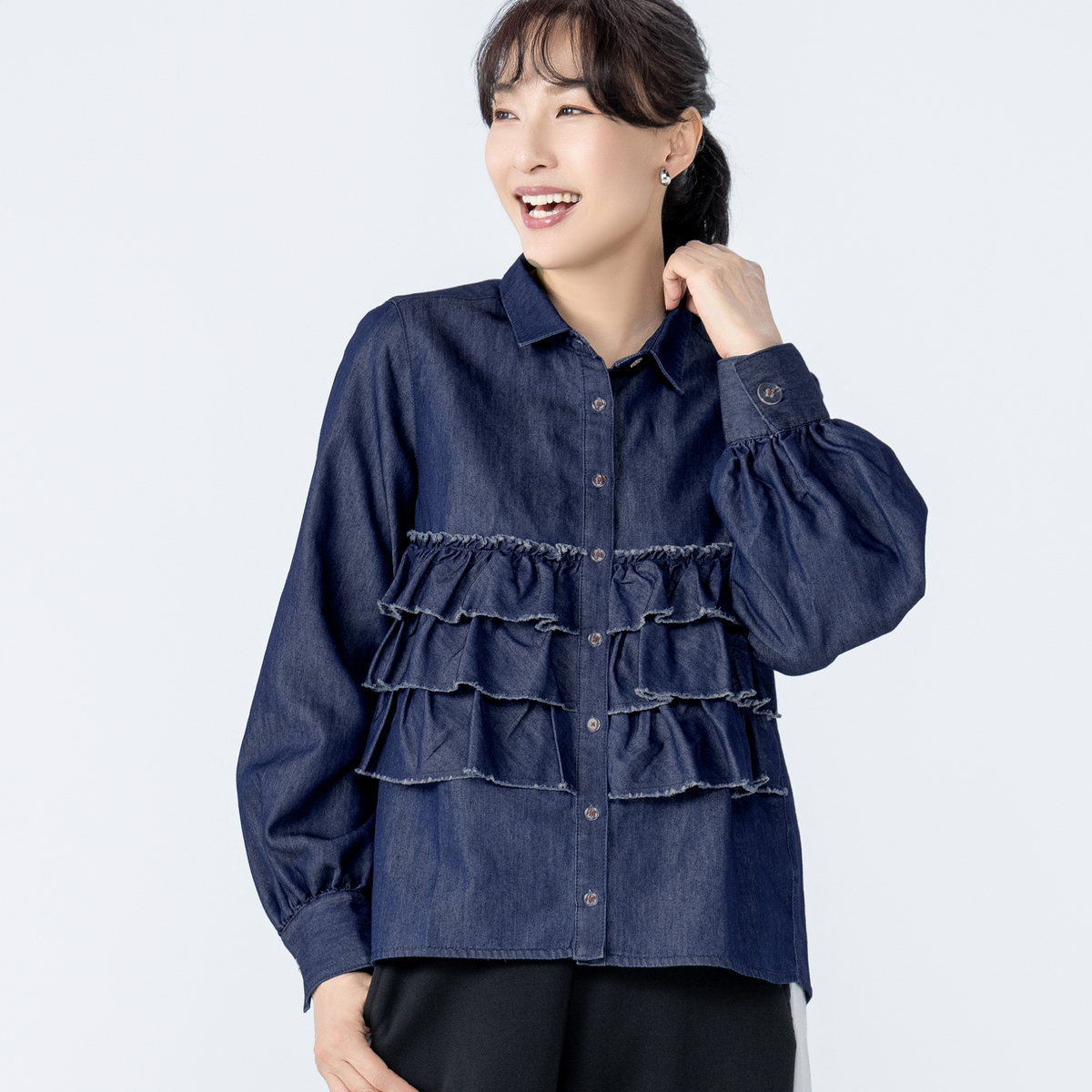 前身頃に贅沢な3段フリルをあしらったデニムシャツ。断ち切りデザインが可愛らしさのなかに、程よいラフさをもたらしてくれます