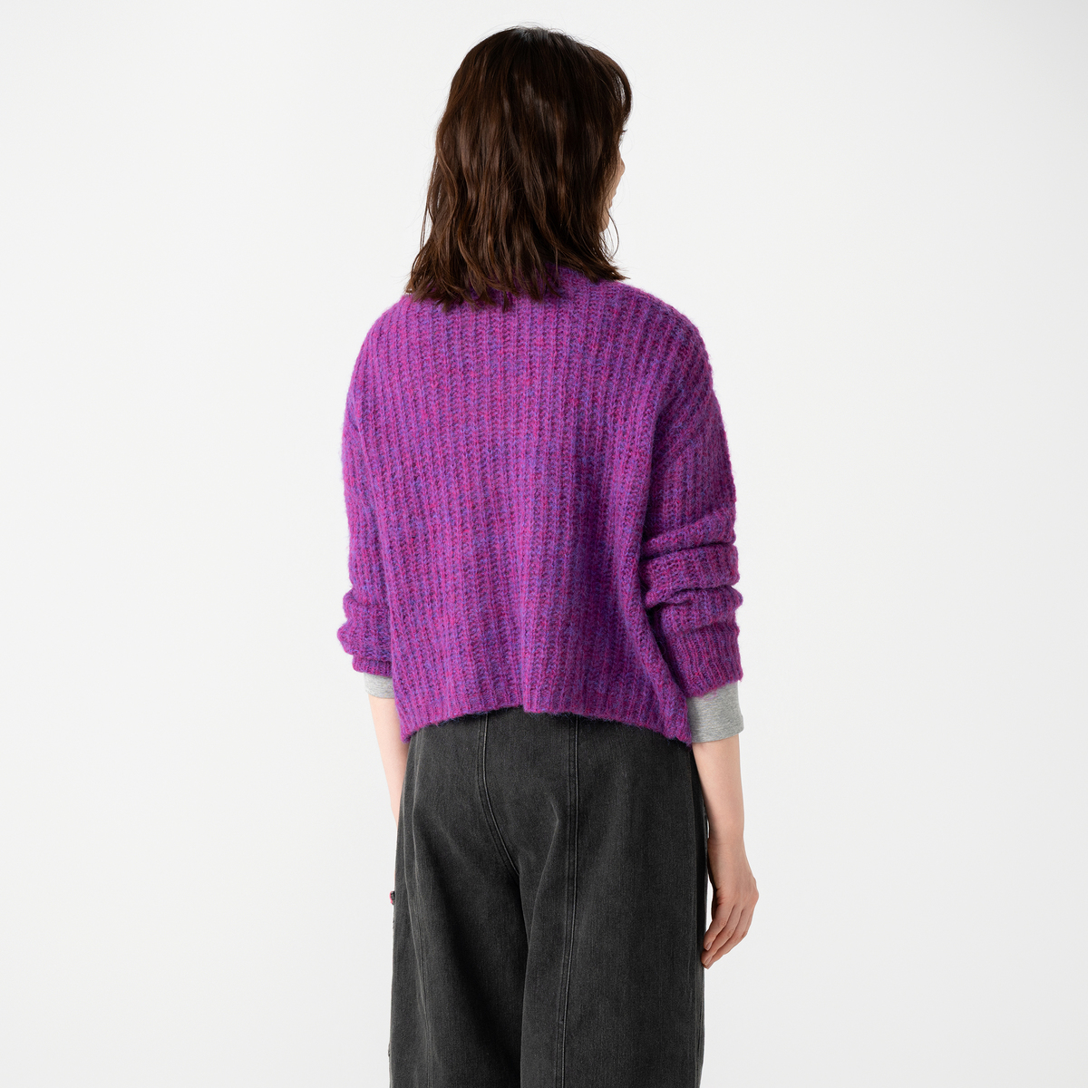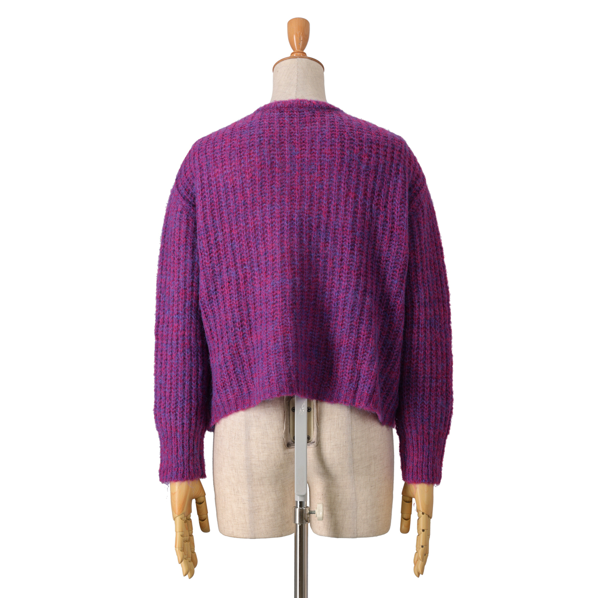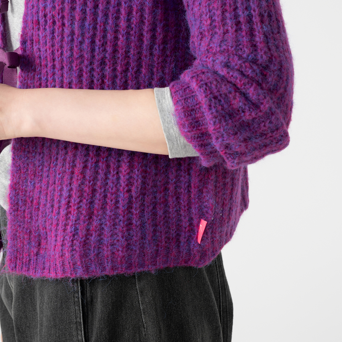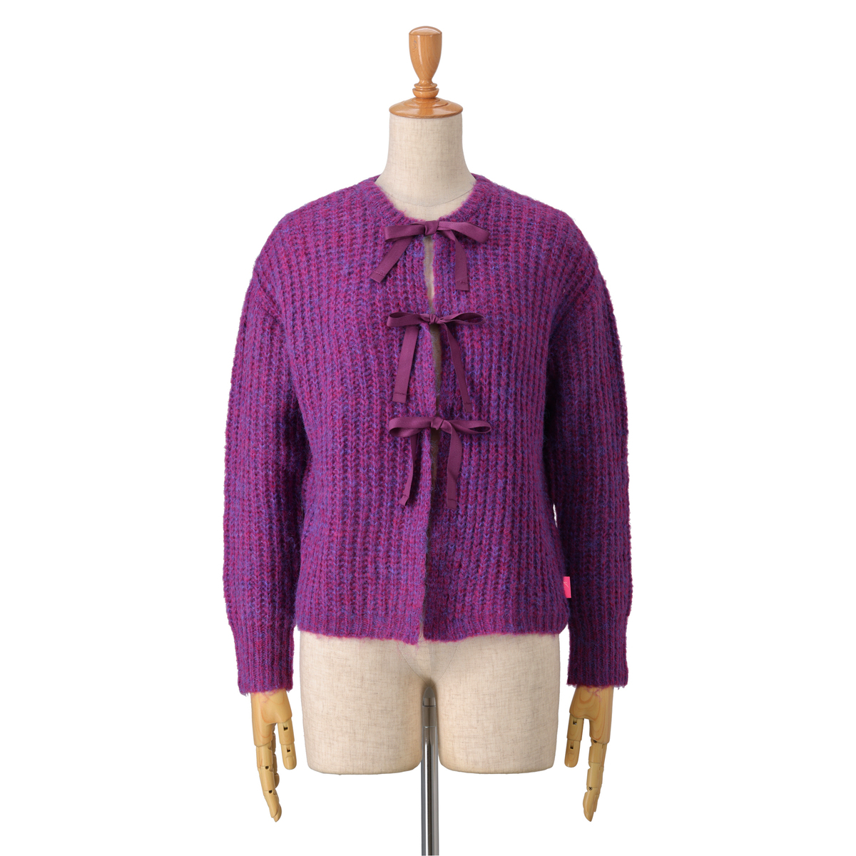 色はベリーを選びました。 ぽっちゃり体型なのであぜ編みは着膨れしてしまうかな。。と心配でしたが、そんな心配もなく 素敵です。編み地が兎に角軽くてニット特有の重さはゼロです。リボンを結ぶ数によって甘さを調節出来るのも凄く素敵です。2025年の秋色のお洋服の第一号となりました。