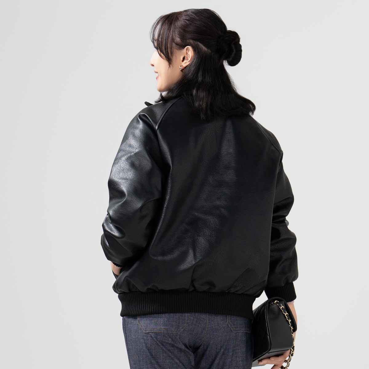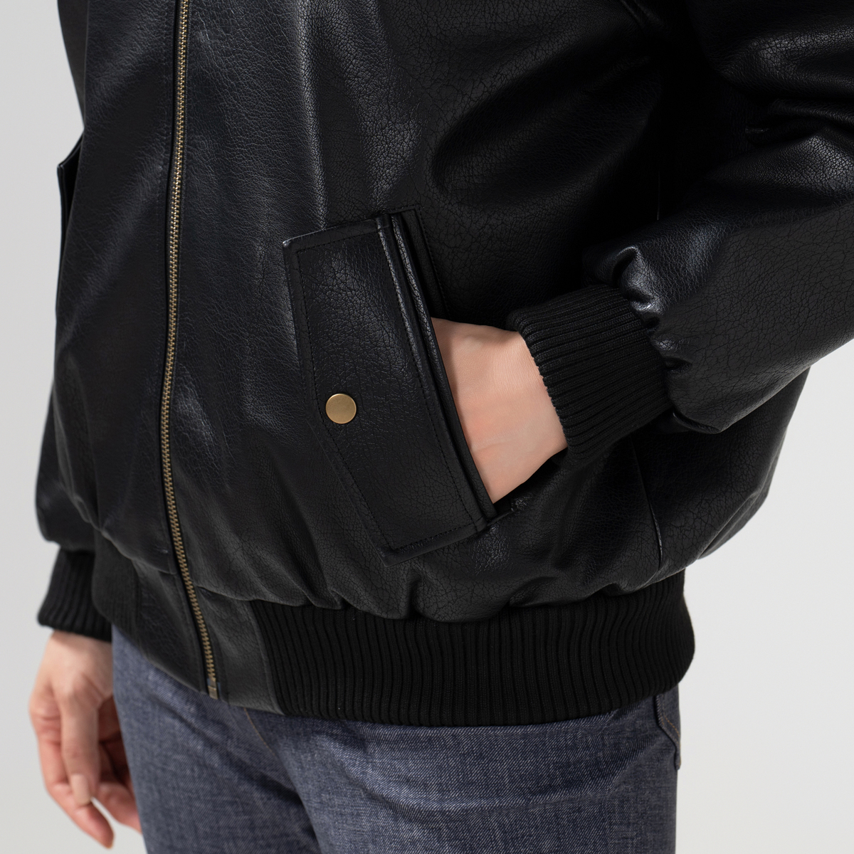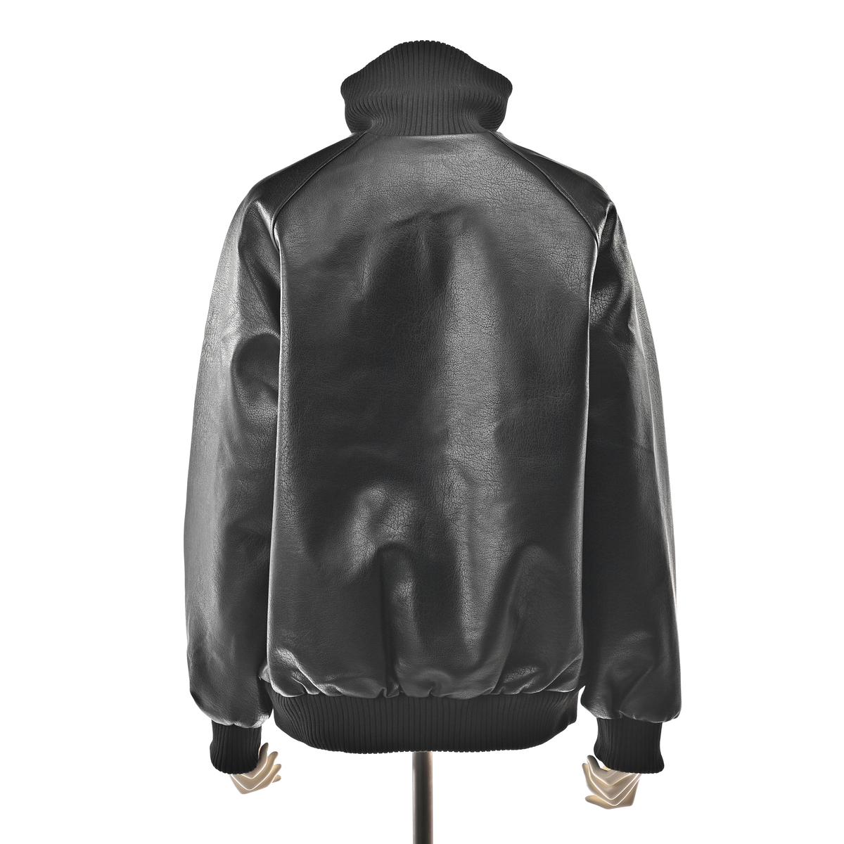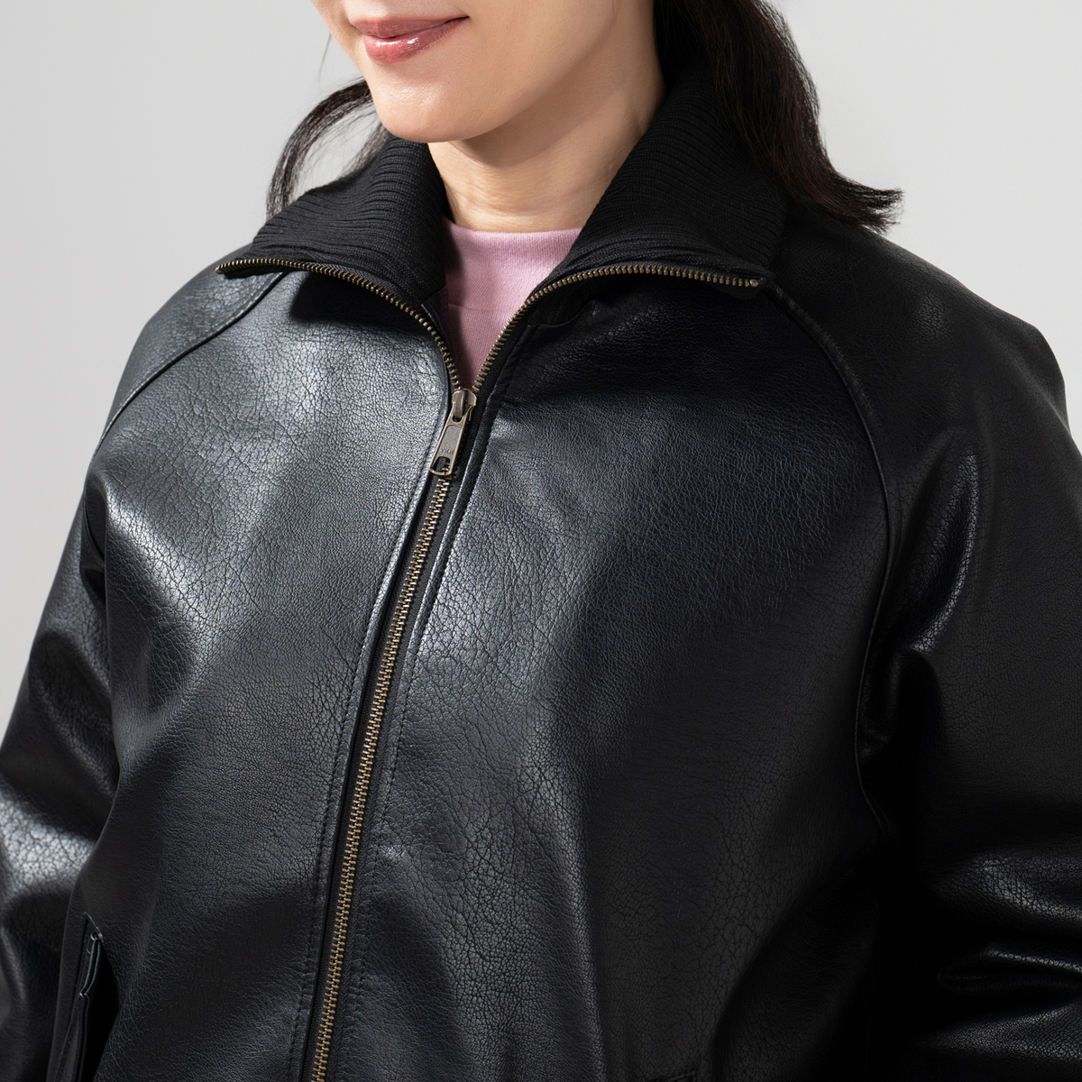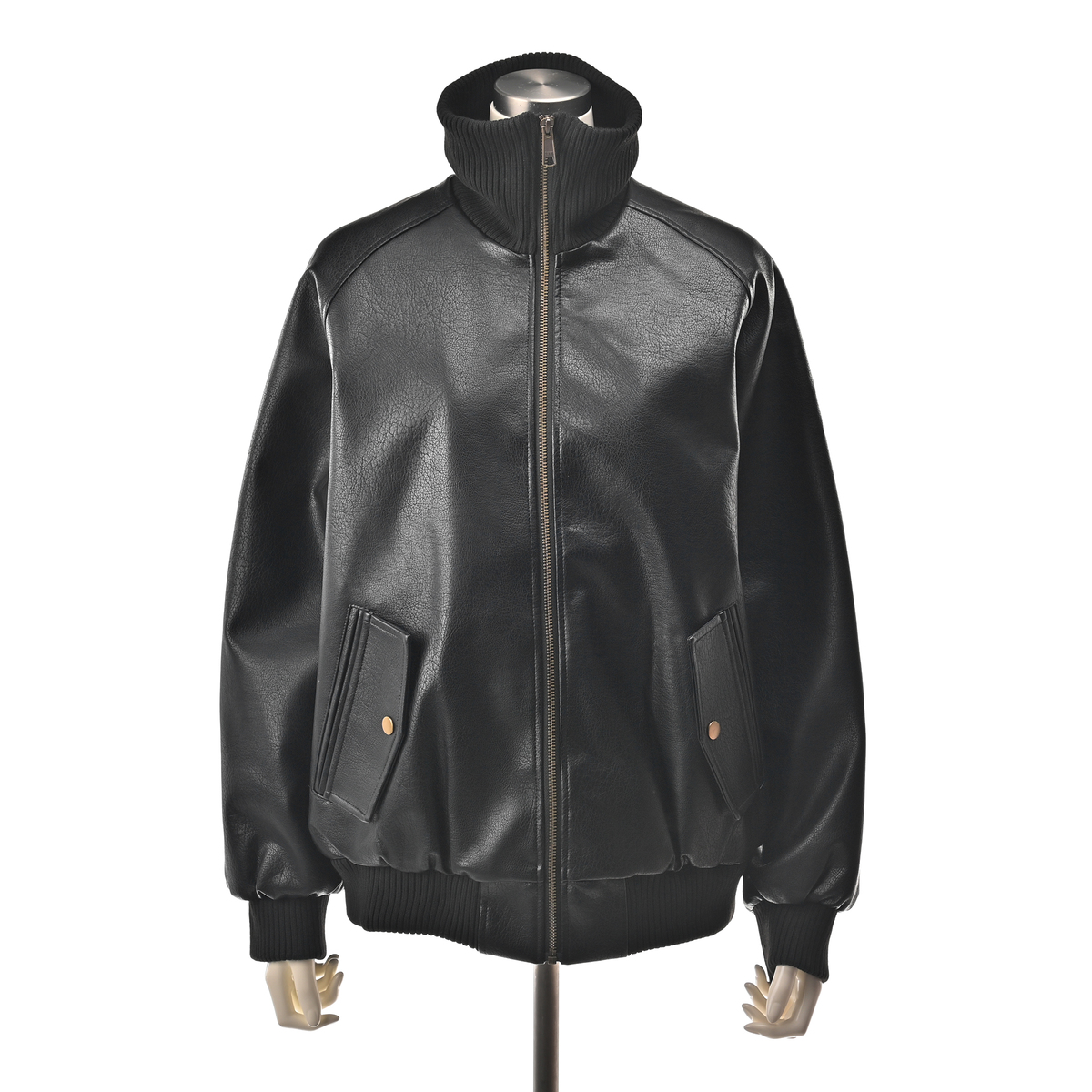 シボ感のある厚手の合成皮革が高見えするレザー調のブルゾン。裏地はポリエステルタフタと中綿をキルティング加工したあたたかな仕様。襟や袖口などは厚手のリブ使いで、寒い季節のコート代わりに。スタイリッシュさとあたたかさを両立します