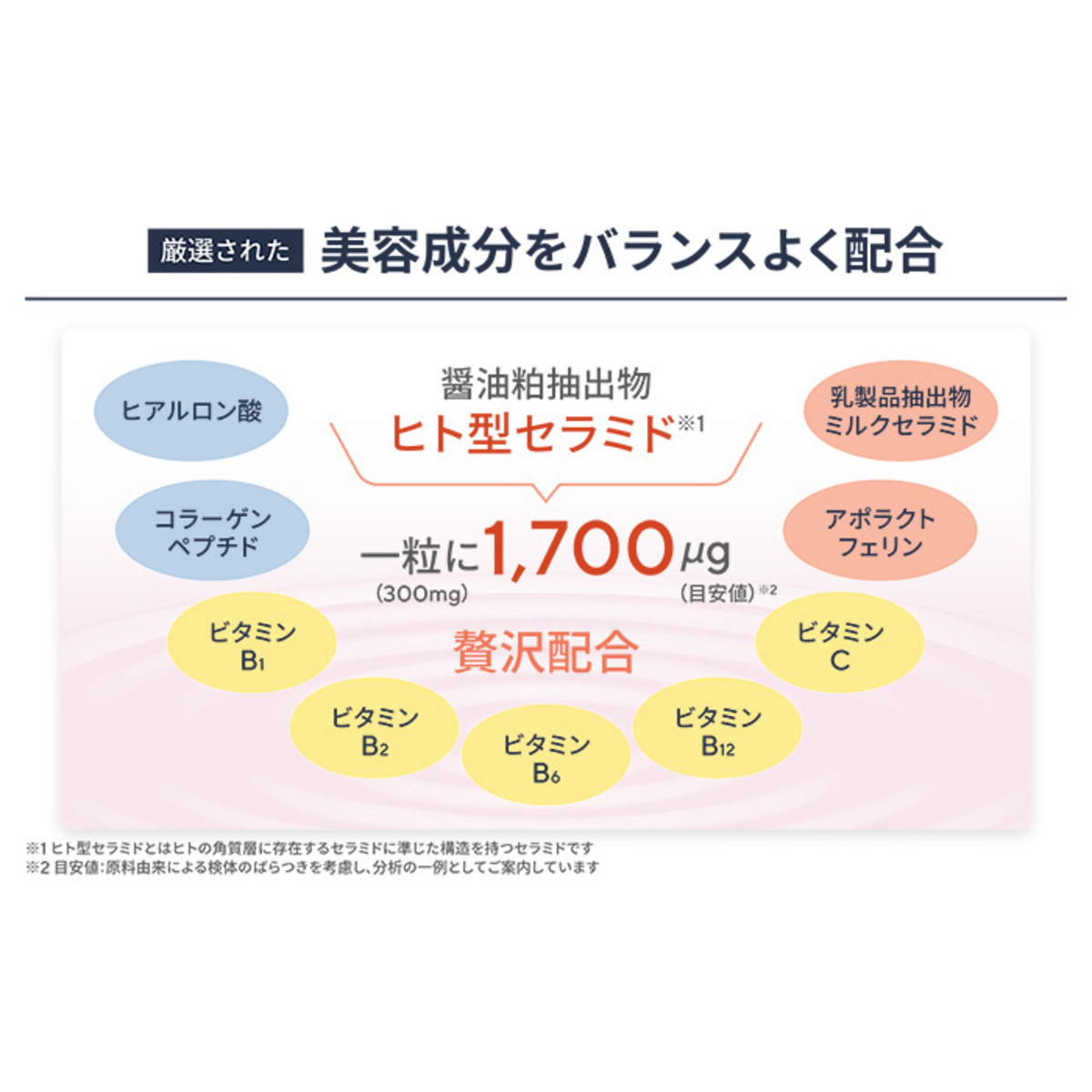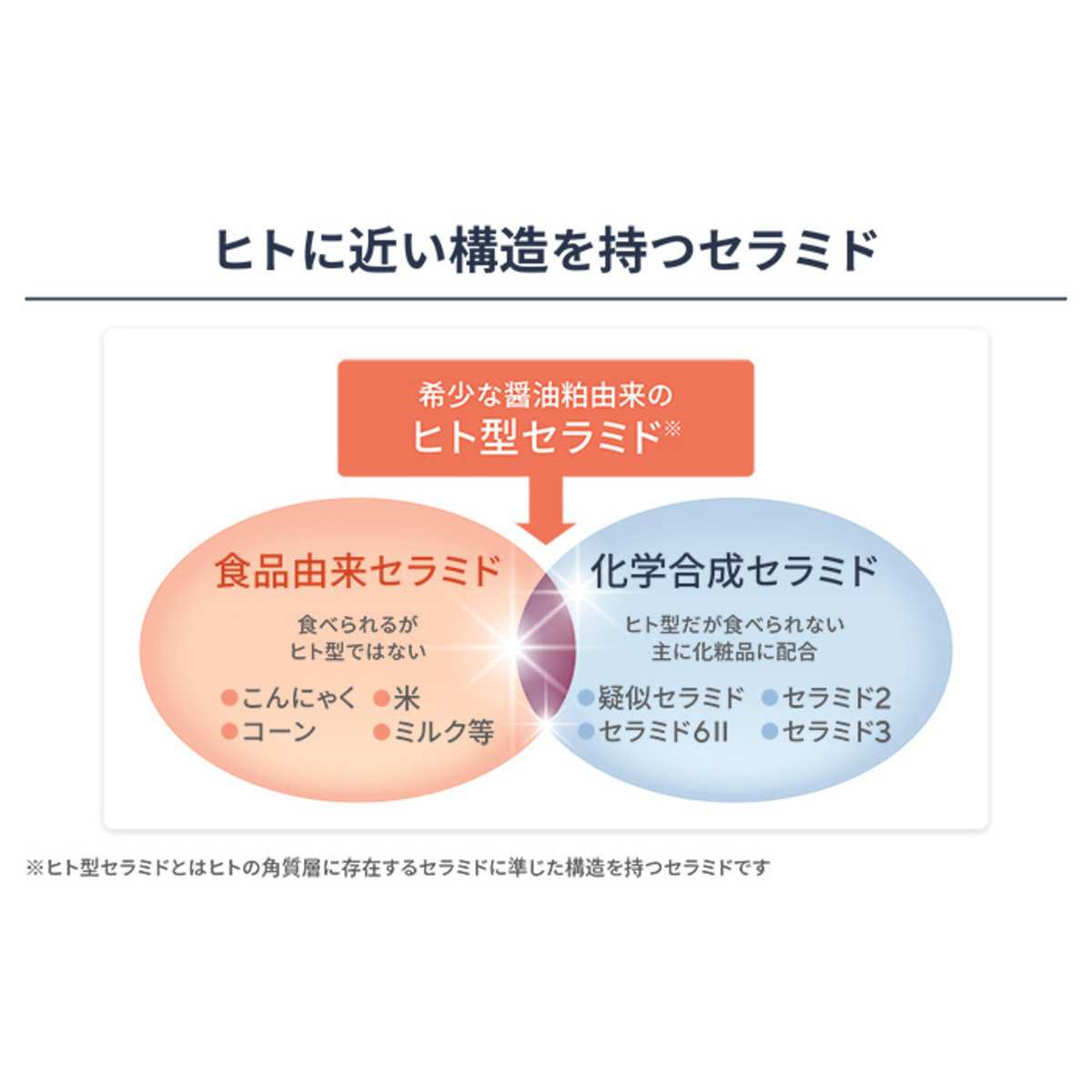 醤油粕由来セラミド(醤油粕抽出物)とミルク由来セラミド(乳製品抽出物)の2種類のセラミド原料を配合し、1種のヒト型セラミド(*1)を含むサプリメント。醤油粕由来のセラミド(醤油粕抽出物)はセラミド純度90%以上(*2)です