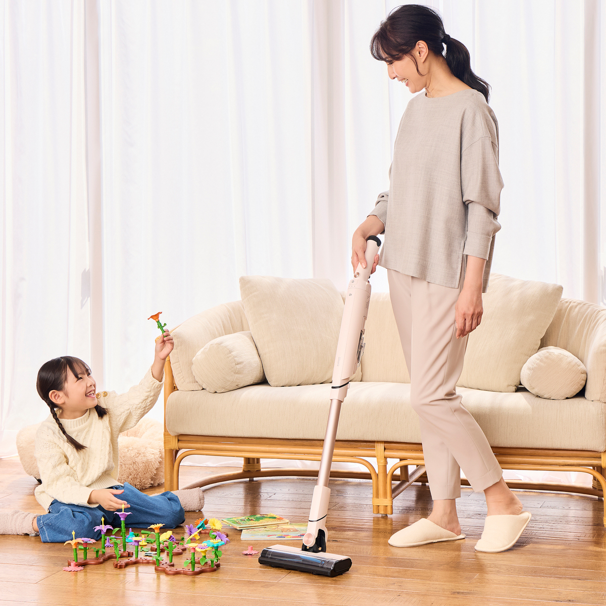 お掃除にやっかいな長い髪の毛やペットの毛も、パワーフィンで強力に取り除きます(*3)。ブラシレスパワーフィンが、フローリングやカーペットなどあらゆる床に常に密着。大きなゴミから細かいホコリまで効率よくキャッチし、ヘッドはなめらかに動くので、自由自在にお掃除が可能です