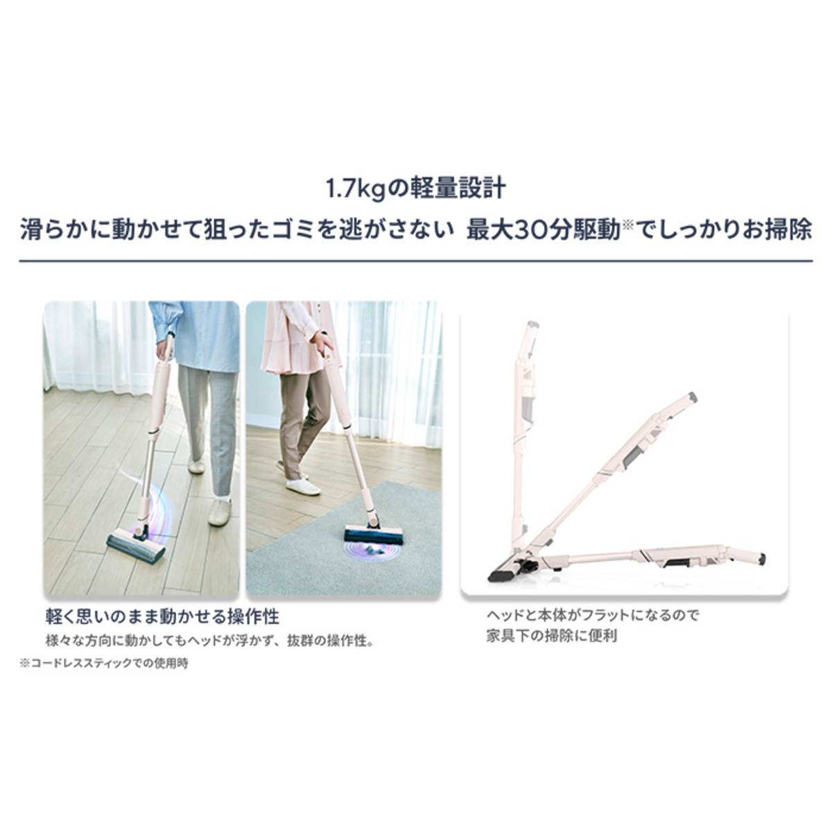 [サイズ]高さ×幅×奥行 コードレススティック:104.1×26.7×15.2cm ハンディ本体:51.0×9.1×7.1cm 充電ドック収納時:106.1×28.0×25.7cm [重量] 約1.7kg(ハンディクリーナーにバッテリー、パイプ、電動フロアノズル装着時) [充電時間] 約3.5時間充電で最大30分(コードレススティック時)使用可能 [使用方法] <製品の組み立て> 1.ハンディークリーナー(掃除機本体)、パイプ、電動フロアノズルを接続・固定する 2.ドック用ダクトを自動ゴミ収集ドックに差し込む <充電> 1.電源プラグをコンセントに差し込む 2.充電方法:ハンディ本体で直接充電 <使用方法> 1.ハンドル部にある電源ボタンを押す 2.電源を切るには、もう一度ボタンを押す [お手入れ] <ダストカップを空にする> 1.ゴミ捨てボタンを前方にスライドさせてダストカップを開きゴミを捨てる 2.乾いた布で汚れを拭き取る。 <ダストカップとフィルターの清掃> 1.フィルターリリースボタンを押し、フィルター容器を引き出す 2.フィルターとフィルター容器を水洗いし24時間以上自然乾燥させる 3.取り外したダストカップは、水で洗うか湿らせた布で拭き取る。洗浄後は十分に自然乾燥させる <フロアノズルのお手入れ> 1.フロアノズルをパイプから取り外す 2.フロアノズルを湿らせた布で拭き上げる <ゴミ詰まりの点検> ハンディークリーナー、パイプ、フロアノズルを取り外し、中にゴミや異物が詰まっていた場合は取り除く ■組み立て式(組み立て所要時間:5分以内) ■取り扱い説明を充分にご確認の上、ご使用下さい 【中国製】 [注意事項] ※本製品の構成部品には電気端子や配線、可動部品が含まれているため、ご使用の際は十分ご注意下さい ※使用する前に、必ずすべての部品を点検し、破損がないことを確認してください ※必ず取扱説明書の説明に従って使用して下さい。取扱説明書で説明する目的以外のいかなる目的にも本製品を使用しないで下さい ※本製品の部品は、フィルターおよびダストカップを除き、水などの液体にさらさないで下さい ※本製品を業務用や掃除以外の目的に使用しない ※本製品や電源プラグを濡れた手で取り扱わない ※本製品が通常どおりに動作しない場合や、本製品を落とした場合、破損させた場合、屋外に放置した場合、浸水させた場合は使用しない ※本製品の部品は、フィルター(HEPAフィルターを除く)、ブラシロール、ダストカップを除き、水などの液体にさらさない
