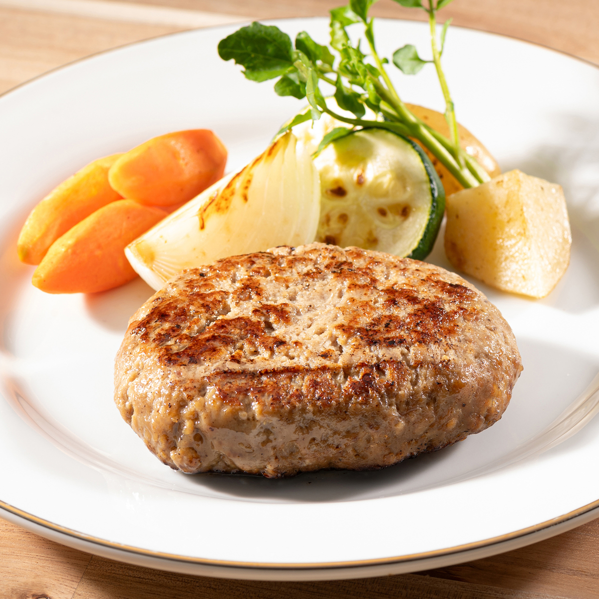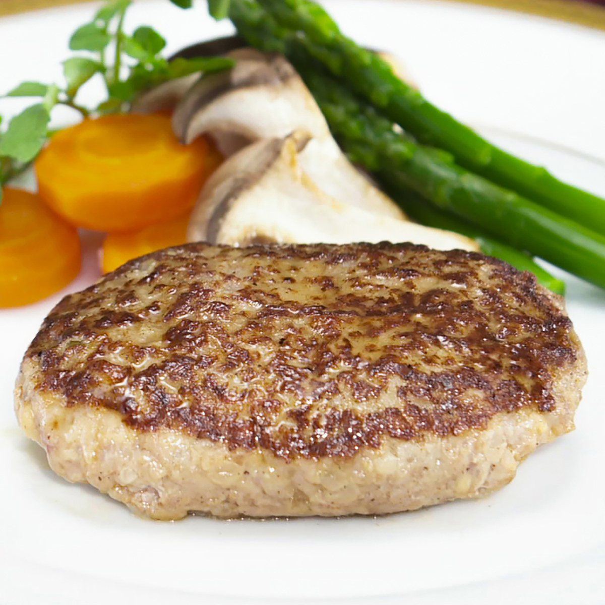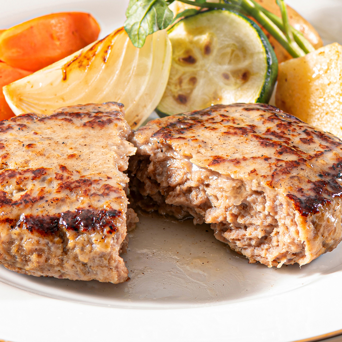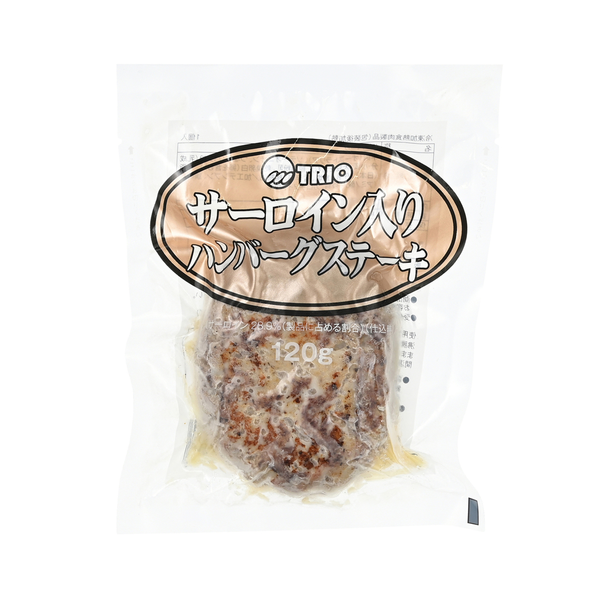 ステーキ用の牛肉を使った本格ハンバーグステーキ。牛肉の中でも希少部位でもあるサーロインを製品中28.9%使用しています。牛肉本来の美味しさをお楽しみいただけるよう、あえてソースはお付けしていません