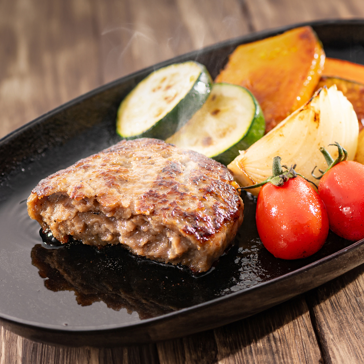 鉄板で焼いた肉の風味を表現したハンバーグにチーズを入れました。チーズはクリームチーズ、チェダーチーズ、モッツァレラチーズ、カマンベルチーズパウダー、マスカルポーネチーズの5種をブレンドしました
