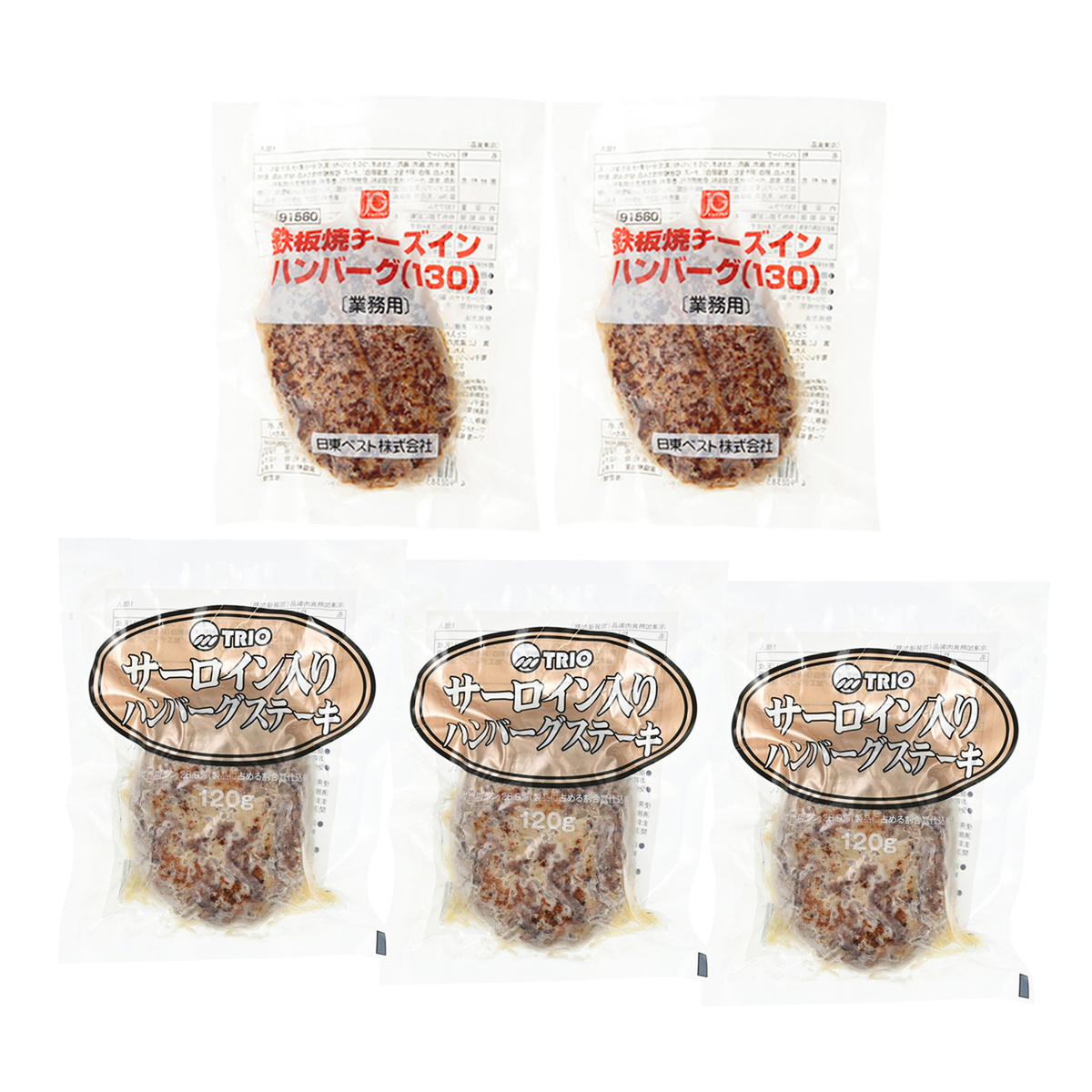 [アレルギー物質特定原材料8品目] 卵、小麦、乳 [商品内容] ・サーロイン入りハンバーグ 120g×3個 ・チーズインハンバーグ 130g×2個 [賞味期限] 出荷時点で賞味期限まで120日以上ある商品をお届けします [保存方法] 開封前:冷凍(-18℃以下)で保存してください 開封後:お早めにお召し上がりください [お召し上がり方] <サーロイン入りハンバーグ> 沸騰したたっぷりのお湯に、凍ったままの商品を袋ごと入れ、約20分間温めてください <チーズインハンバーグ> ボイル:沸騰したたっぷりのお湯に、凍ったままの商品を袋ごと入れ、約20分間温めてください 蒸し:湯気の立った蒸し器に、凍ったままの商品を袋ごと入れ、約21分間温めてください 電子レンジ:凍ったままの商品の袋の表面に5〜6ヶ所小さな穴をあけ、耐熱性の容器にのせ、下記の時間を目安に温めてください 500W:4分00秒、600W:3分20秒 [注意事項] <共通> ※一度解凍したものは、再び凍結しないでください ※袋が熱い鍋のふちにふれたり、鍋からはみ出していると、溶ける場合があります ※加熱後は袋も中身も熱くなりますので、やけどにご注意ください <チーズインハンバーグ> ※オート(自動)機能は使わないでください ※目安の調理時間でも冷たい場合は10秒ずつ再加熱してください ※調理時間は目安です。機種や入れる個数により異なる場合があります ※長時間の加熱は香味低下や中のチーズが溶けだす原因になります [原料原産地] サーロイン入りハンバーグ:牛肉(オーストラリア)、牛脂(日本) チーズインハンバーグ:食肉(牛肉(オーストラリア)) [原産国] 日本 [原材料] サーロイン入りハンバーグステーキ: 牛肉(オーストラリア)、ソテーオニオン、つなぎ(パン粉(乳成分・小麦・大豆を含む)、脱脂粉乳、乾燥卵白(卵を含む))、牛脂(日本)、牛乳、食塩、香辛料、植物油/加工デンプン、調味料(アミノ酸)、香料、カロチノイド色素 鉄板焼チーズインハンバーグ: 食肉(牛肉(オーストラリア)、豚肉、鶏肉)、たまねぎ、つなぎ(パン粉(乳成分・小麦・大豆を含む)、乳清たん白、液卵白(卵を含む)、乾燥卵白)、チーズ、粒状植物性たん白、植物油脂、動物油脂、食塩、ペースト状混合調味料、発酵調味料、香辛料、チーズ加工品、粉末状混合調味料/加工デンプン、安定剤(加工デンプン、増粘多糖類)、トレハロース、pH調整剤、リン酸塩(Na)、乳化剤、調味料(アミノ酸等)、グリシン、着色料(ココア、カラメル、カロチノイド)、香料