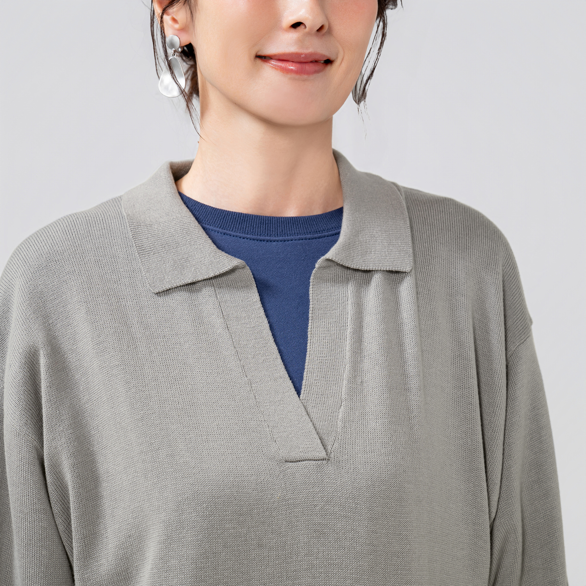 デコルテ周りを綺麗に演出する、スキッパー風のニット衿付きプルオーバー。ちょうど良い肉感でサラッとした天竺編みのニット素材を使い、1枚着はもちろん、レイヤードスタイルも楽しめます