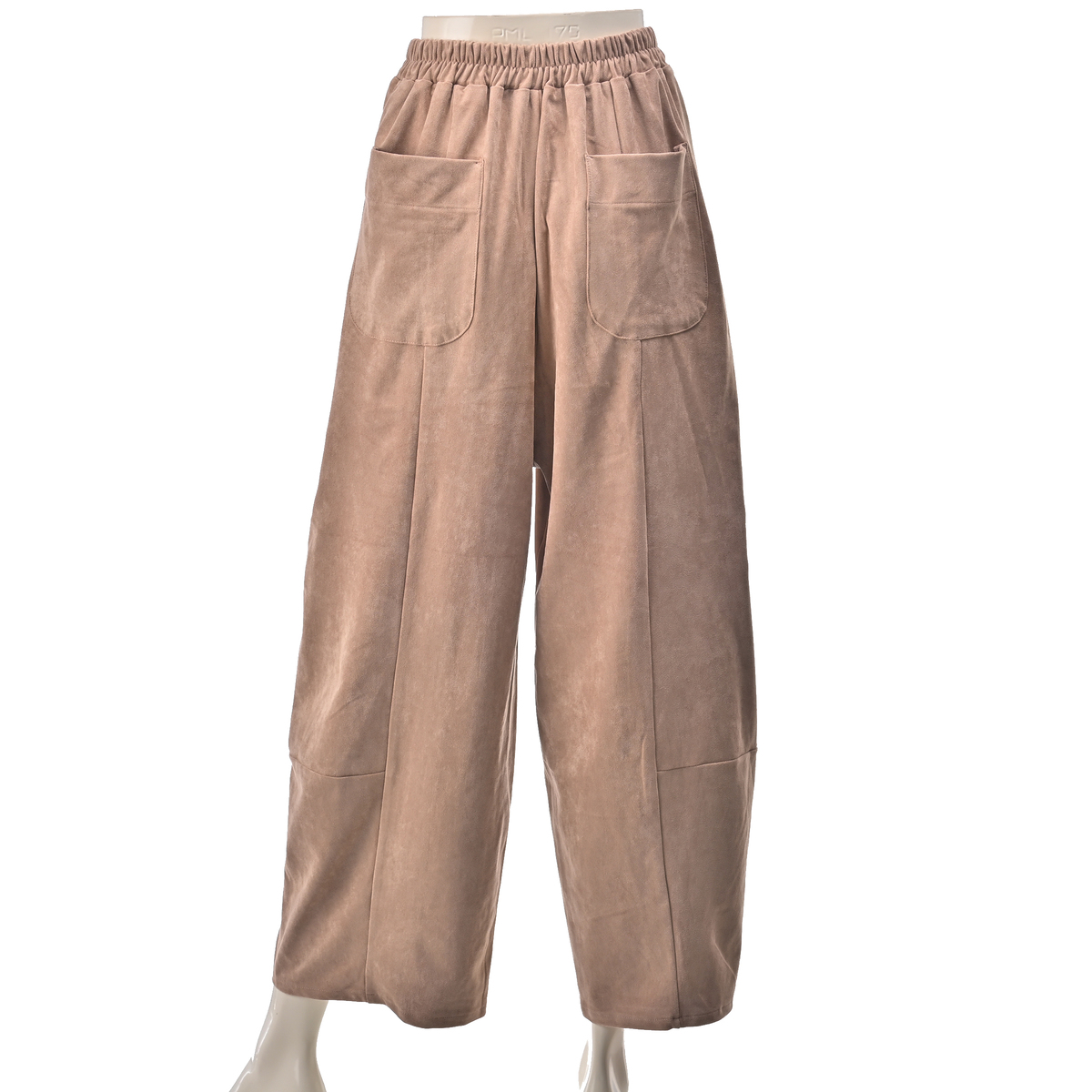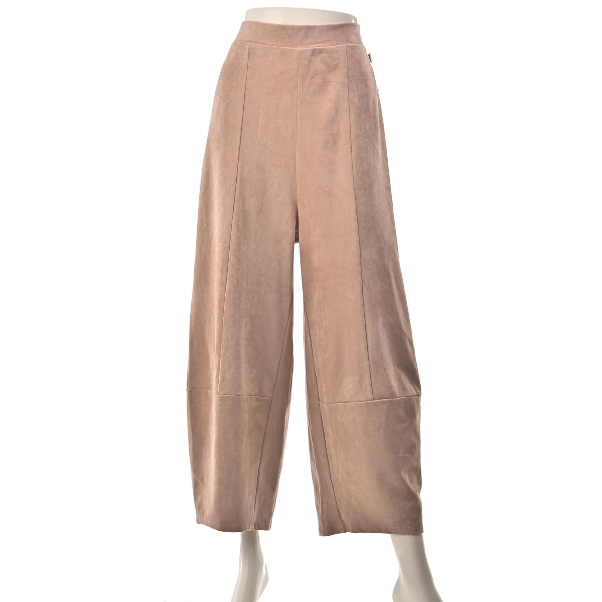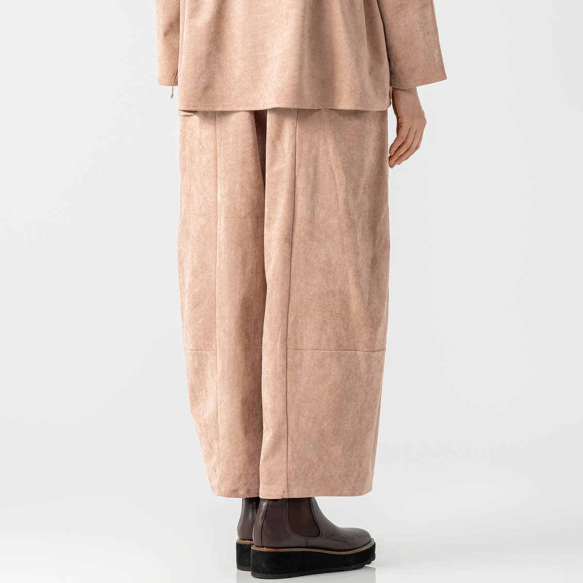 スウェードジャージのパンツ。ジャージ素材ならではの快適さと、高級感のある表面が特徴です