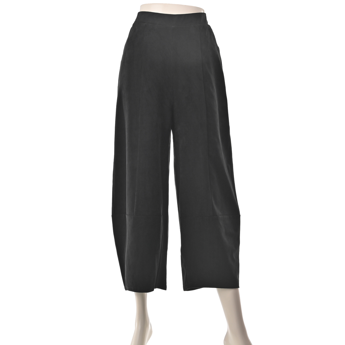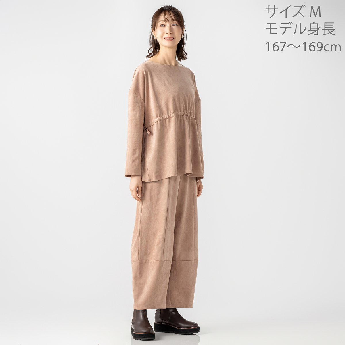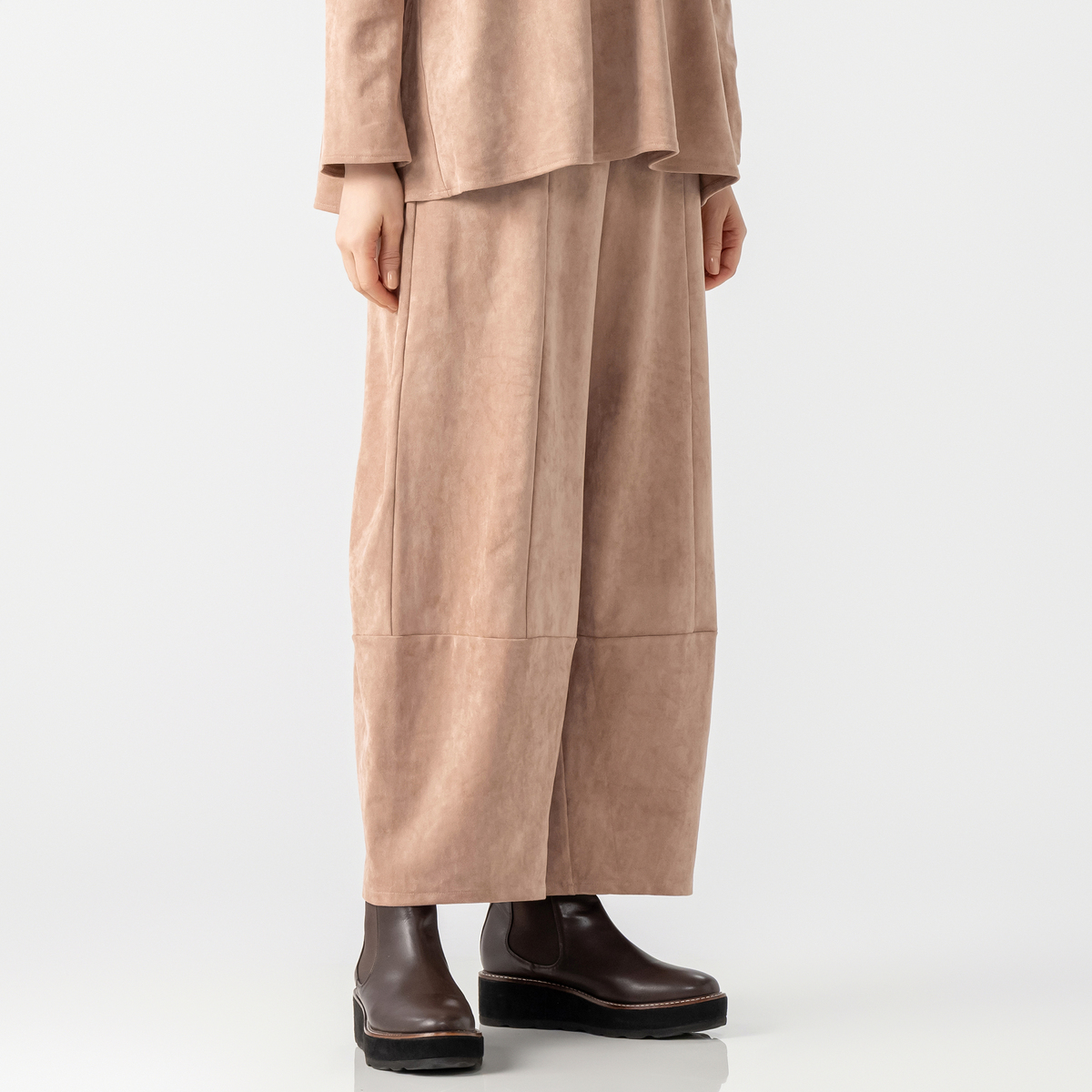 スウェードジャージのパンツ。ジャージ素材ならではの快適さと、高級感のある表面が特徴です