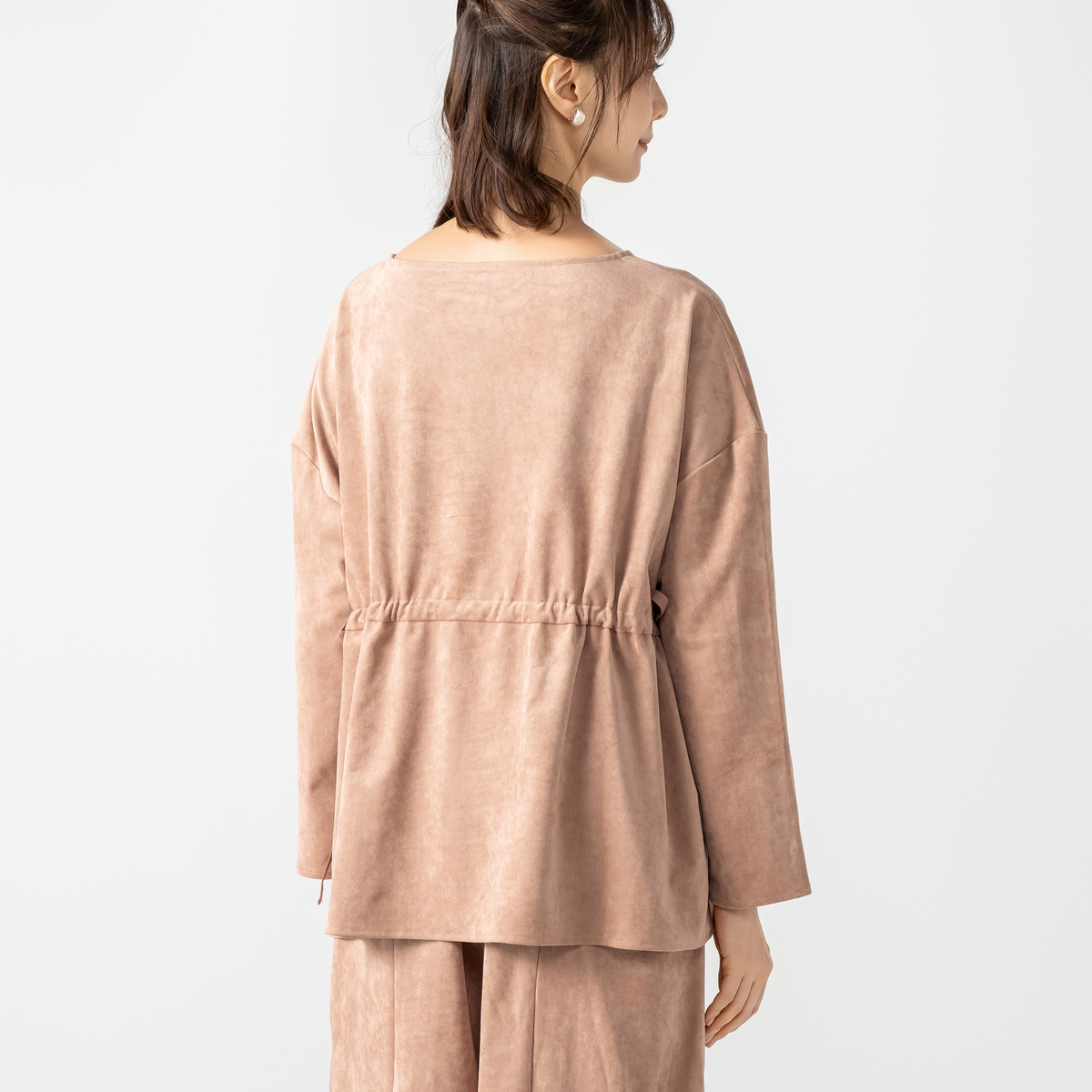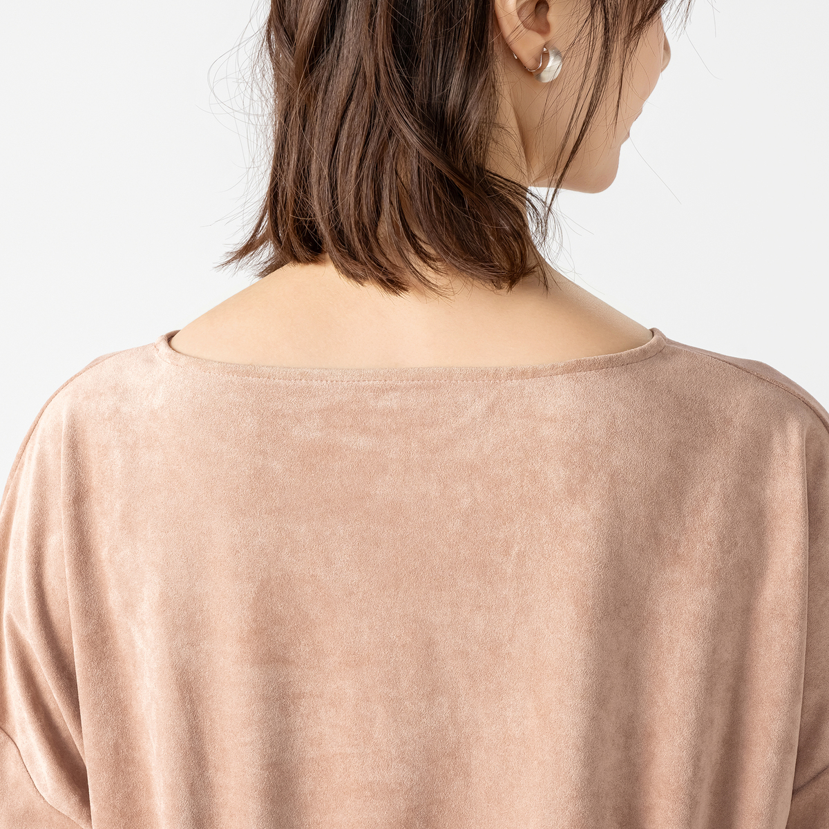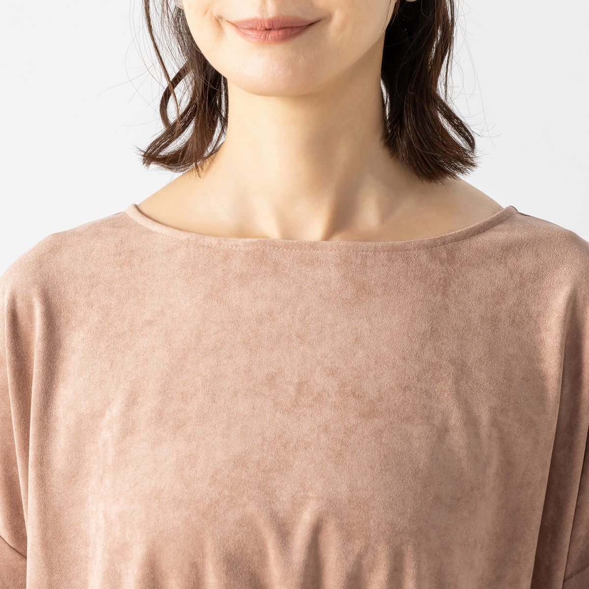スウェードジャージ素材のプルオーバー。独特な表面の質感と落ち着いた色合いが、着こなしに奥行きを加えます
