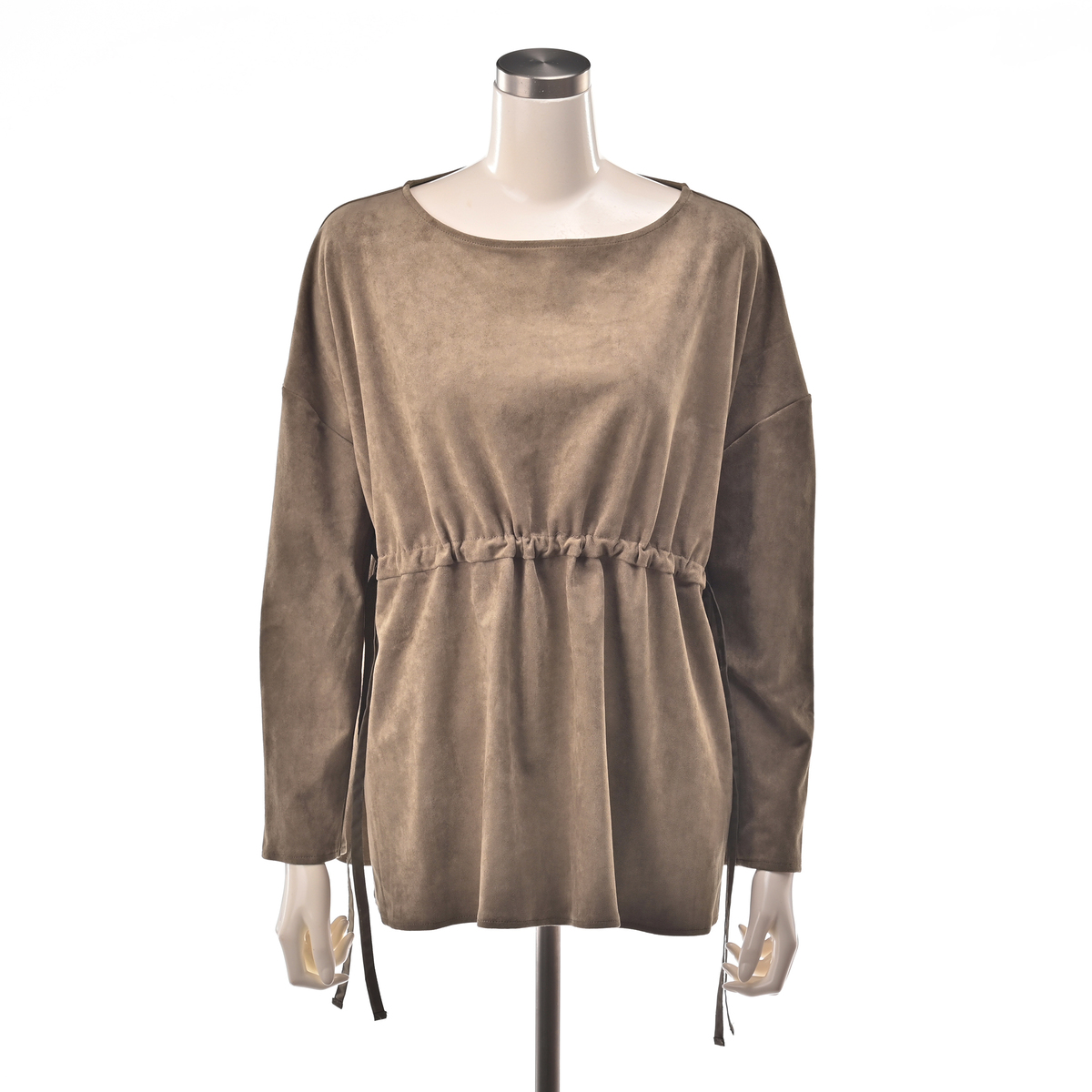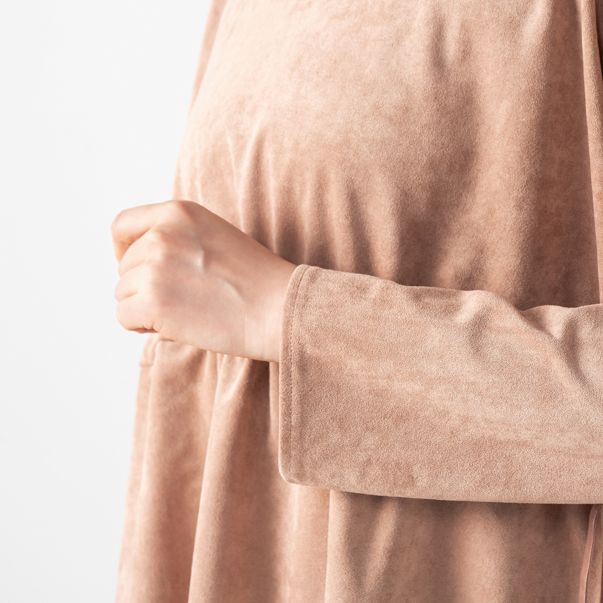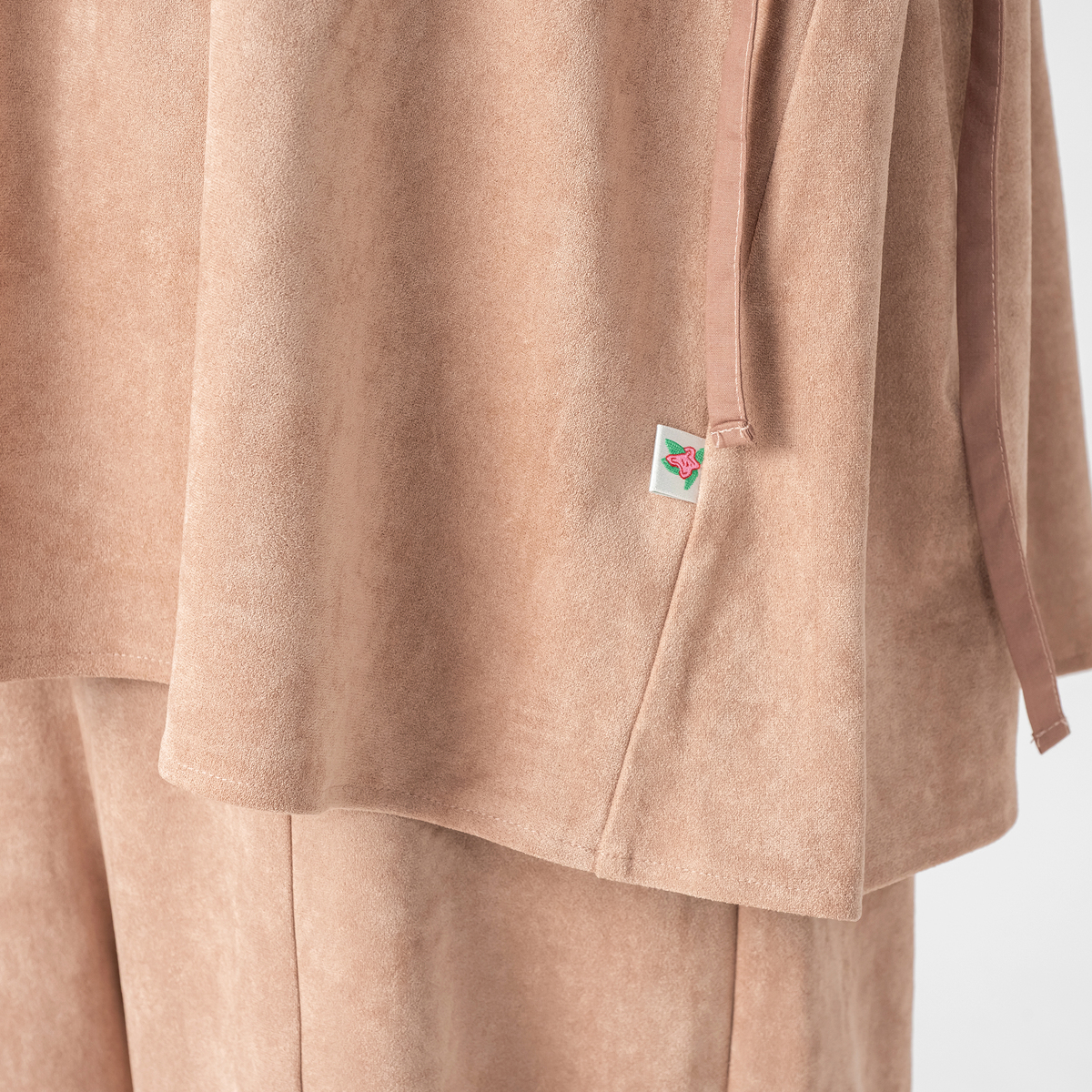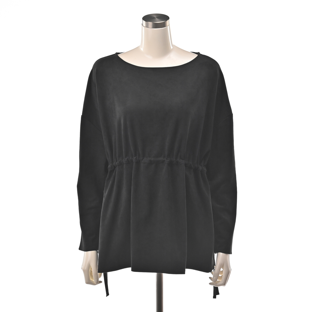 スウェードジャージ素材のプルオーバー。独特な表面の質感と落ち着いた色合いが、着こなしに奥行きを加えます
