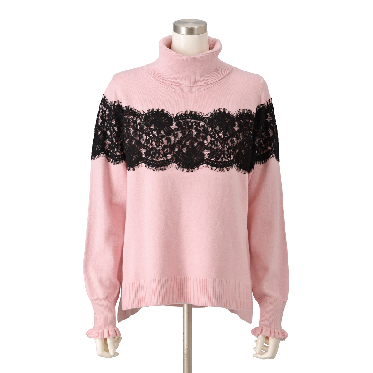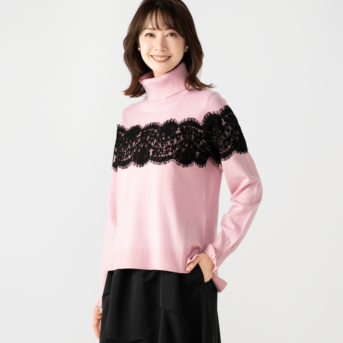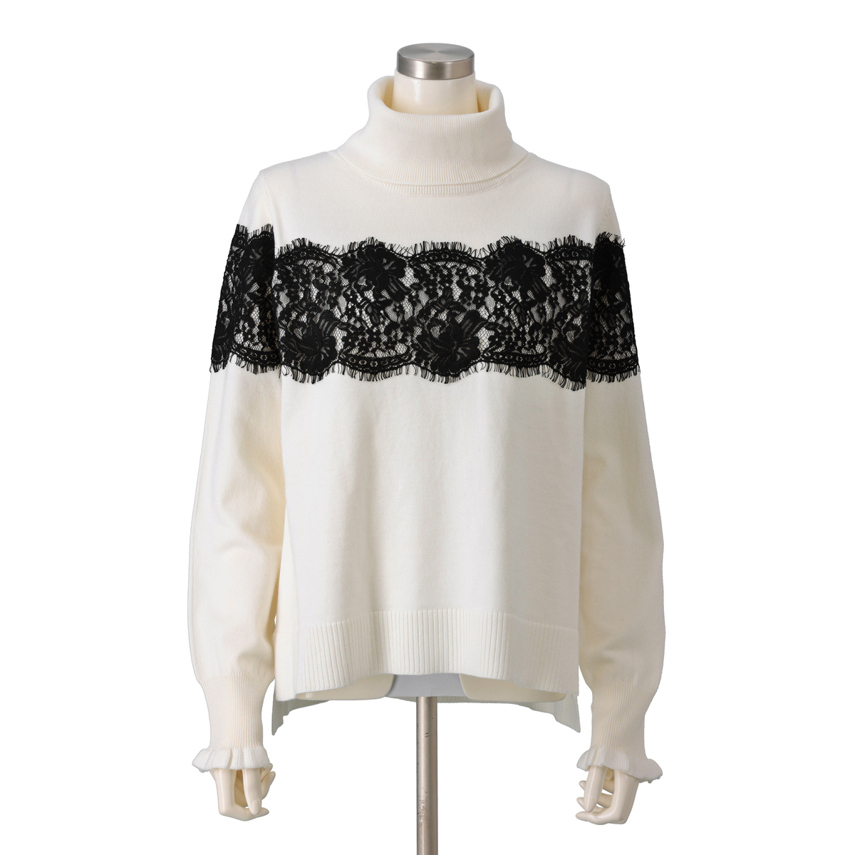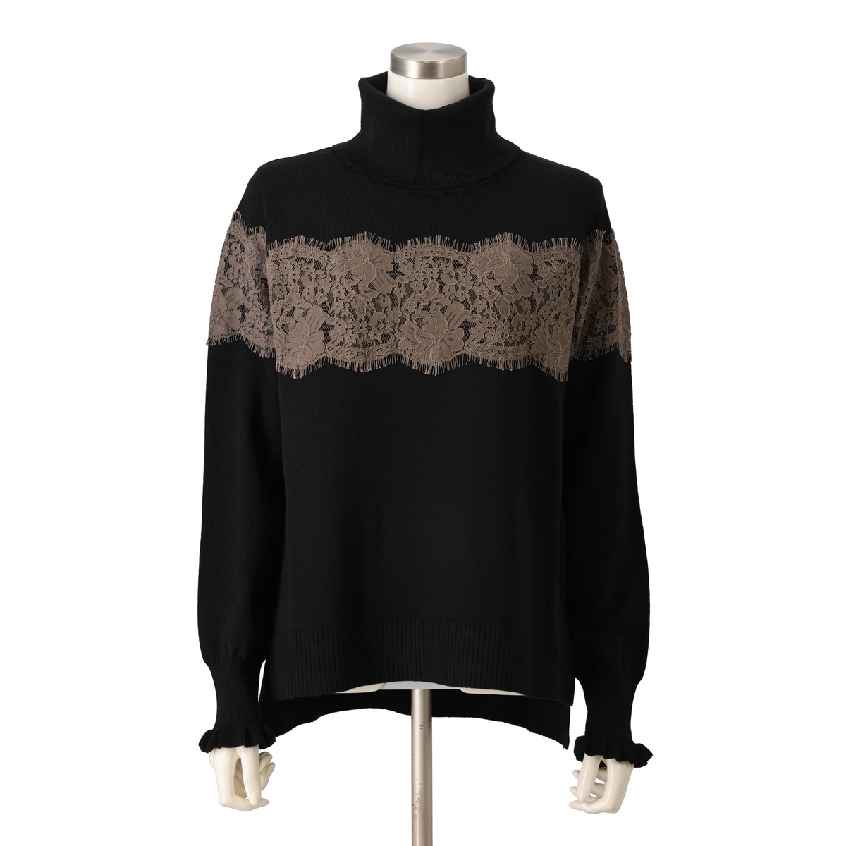 胸元から袖にかけて太めのコードレースを贅沢にあしらったタートルニットプルオーバー。繊細なレースが存在感を放ちます