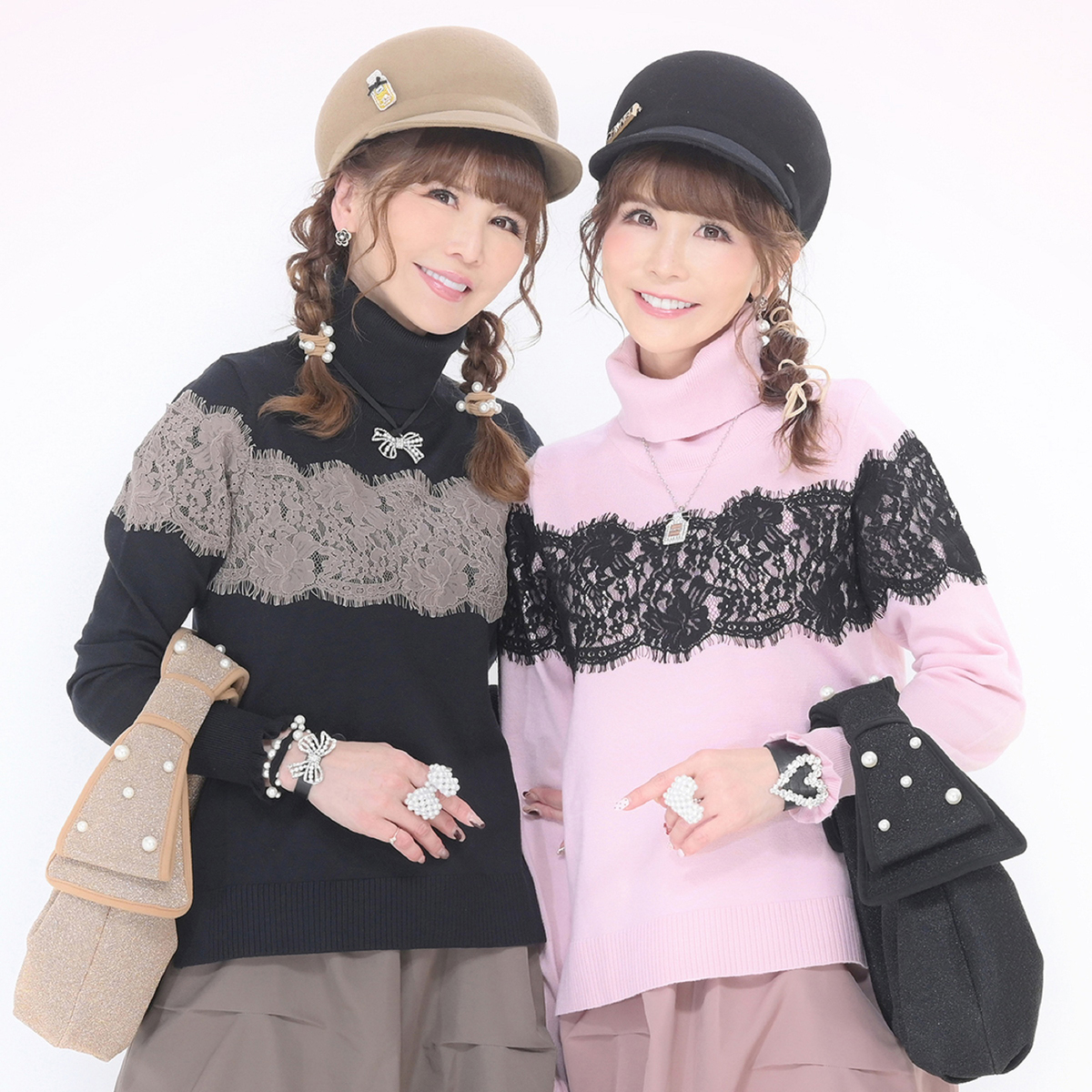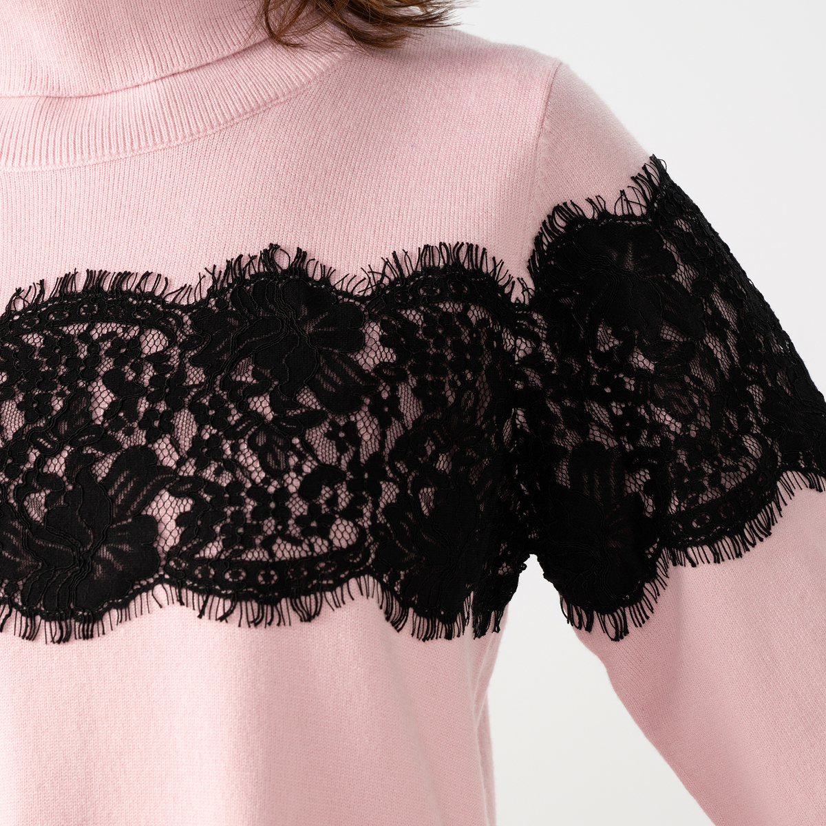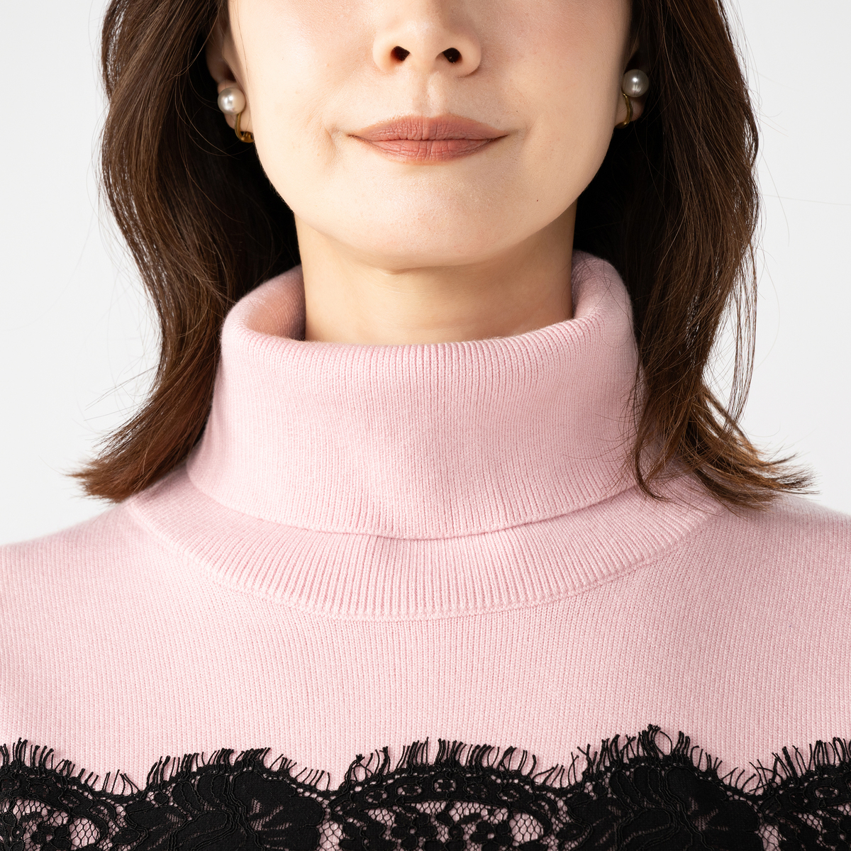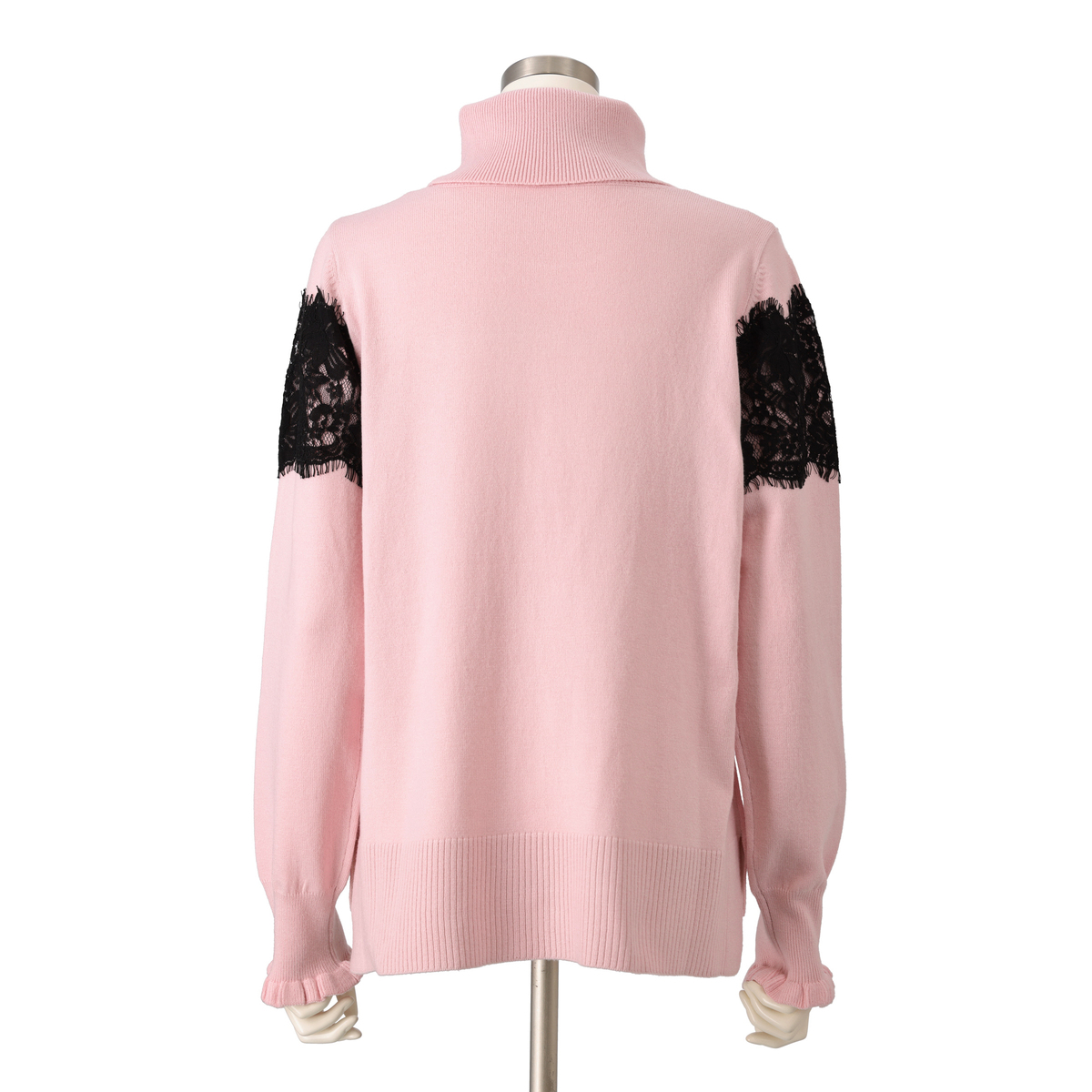 胸元から袖にかけて太めのコードレースを贅沢にあしらったタートルニットプルオーバー。繊細なレースが存在感を放ちます