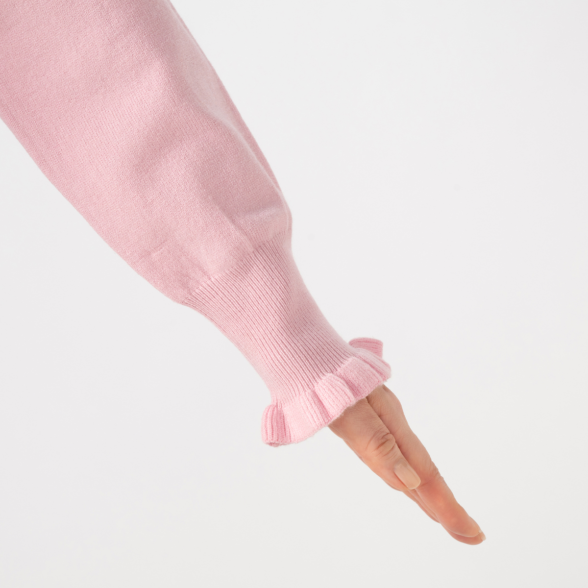 袖口の畦編みフリルでさり気ないフェミニンさをプラス。裾の両サイドにスリット入りで、抜け感のある着こなしが楽しめます