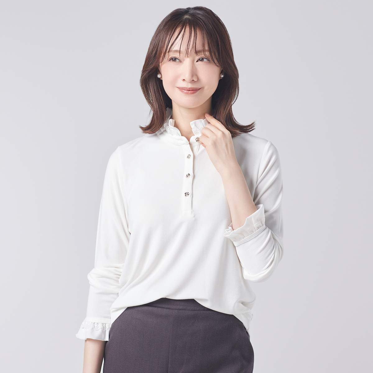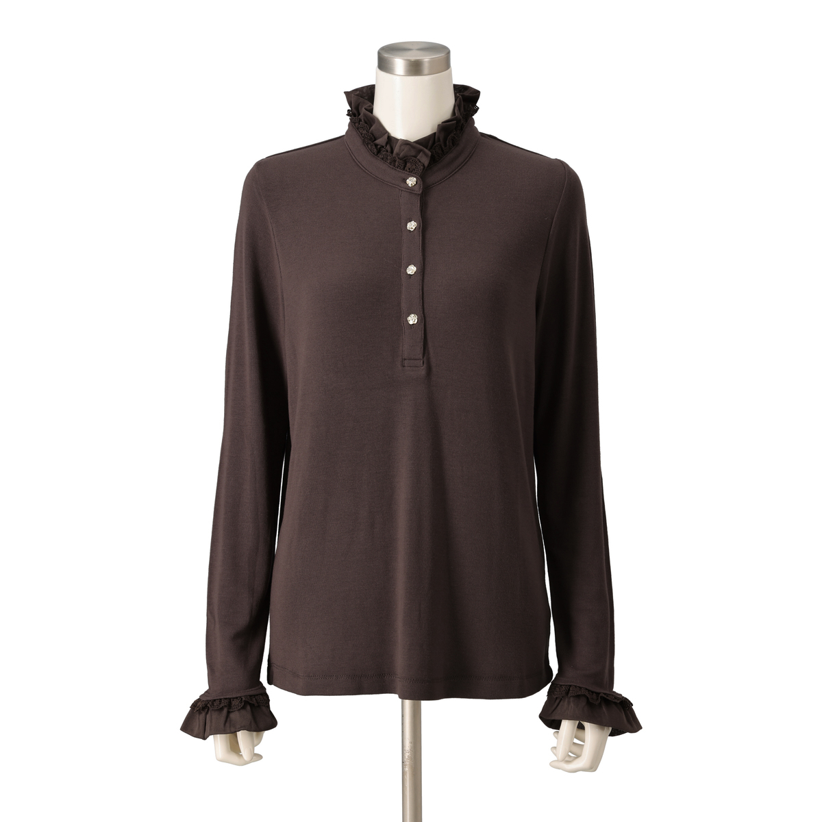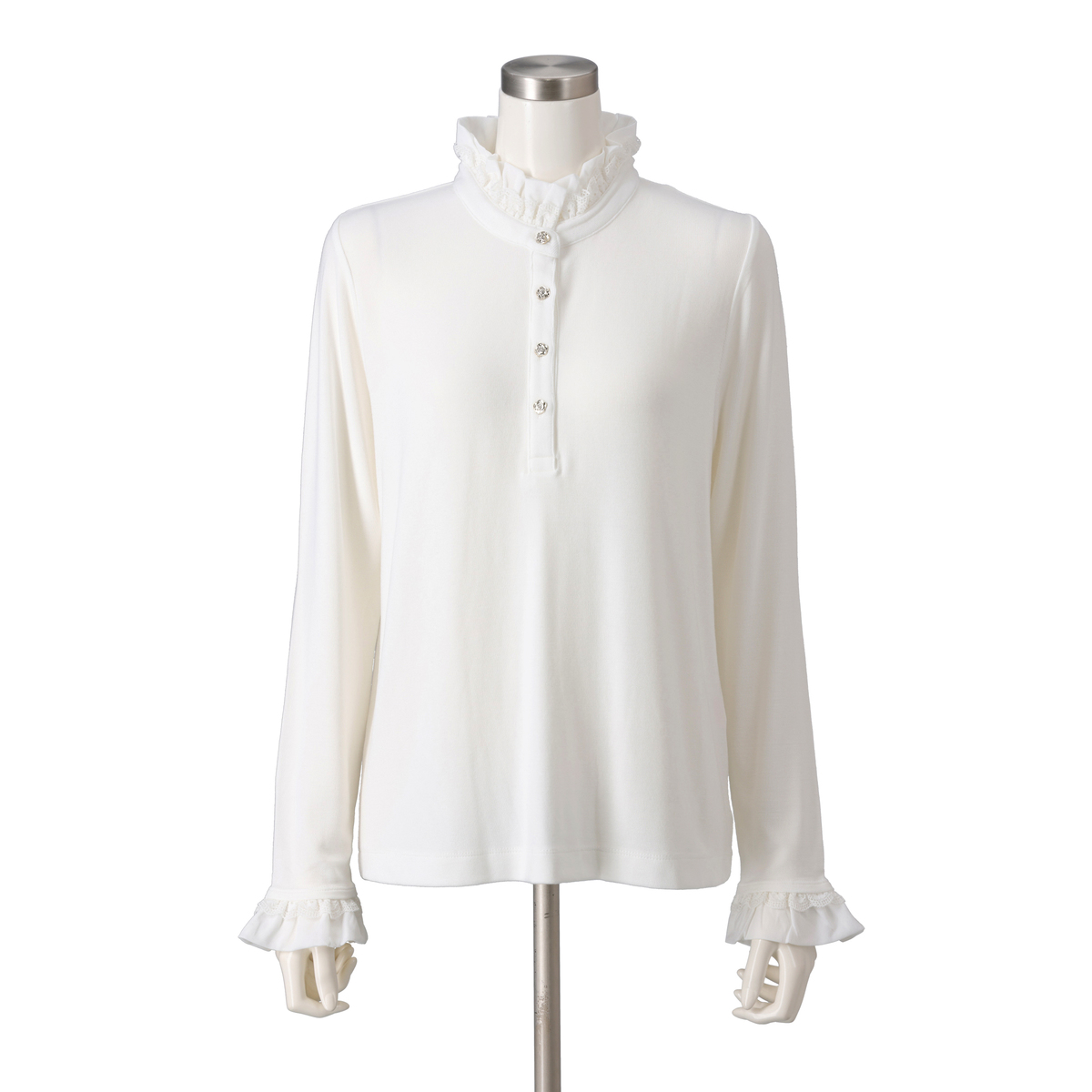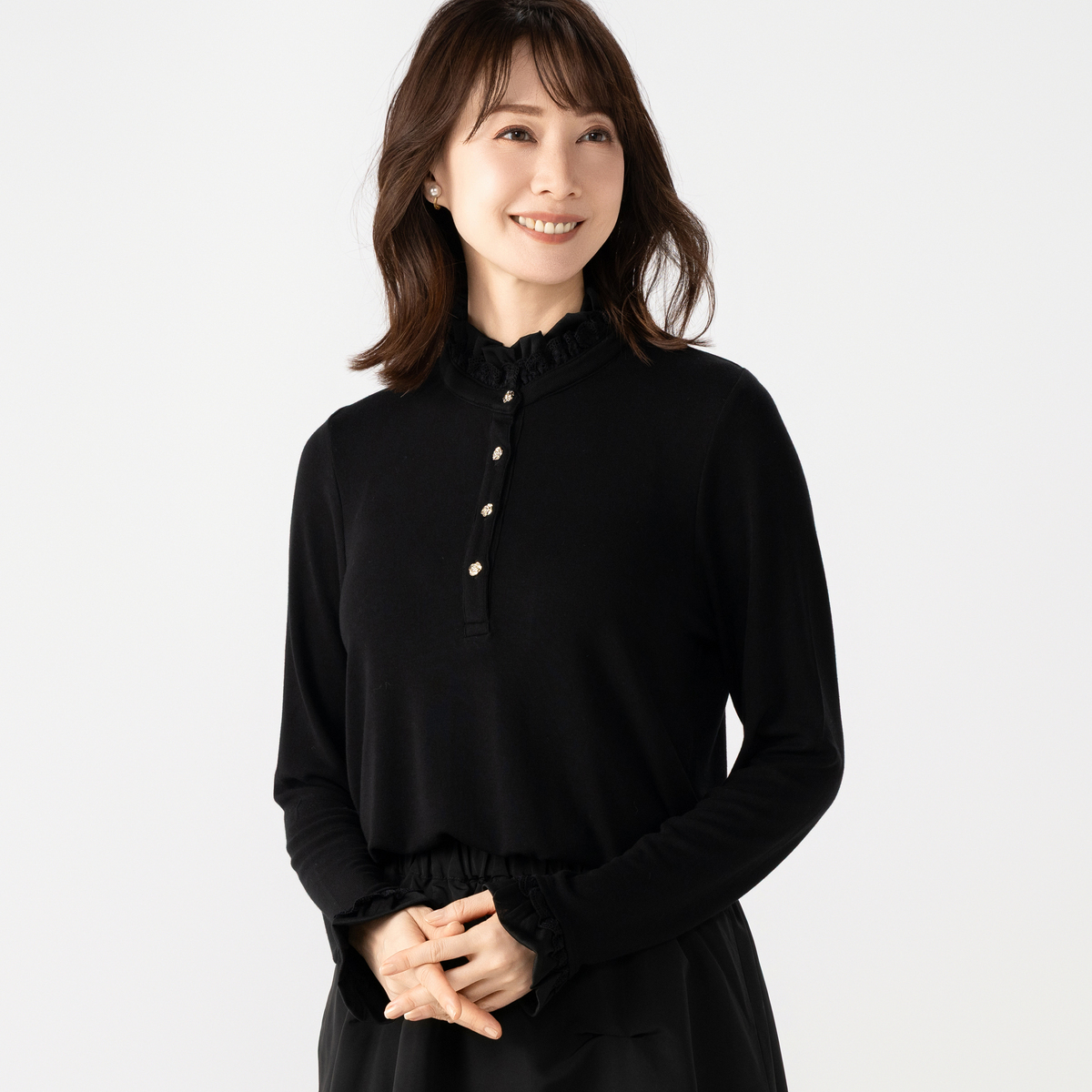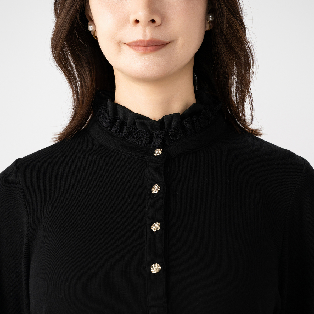 前開きのカメリアボタンが、さりげなく華やかさをプラス。衿元と袖口のフリルが、重ね着スタイルにも映え、上品なアクセントになります