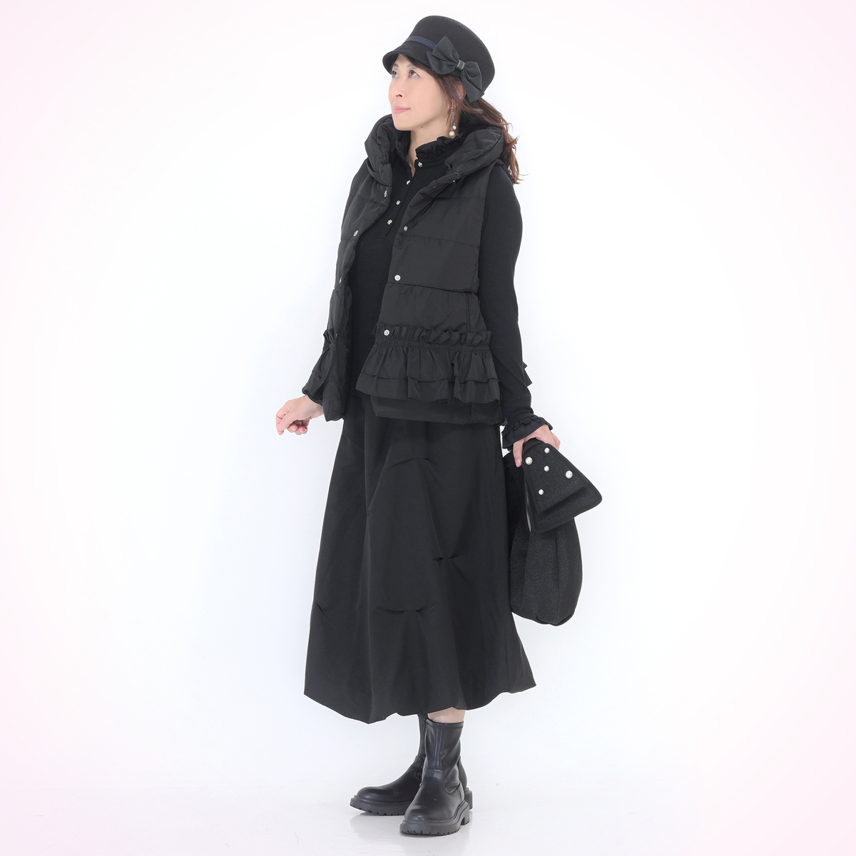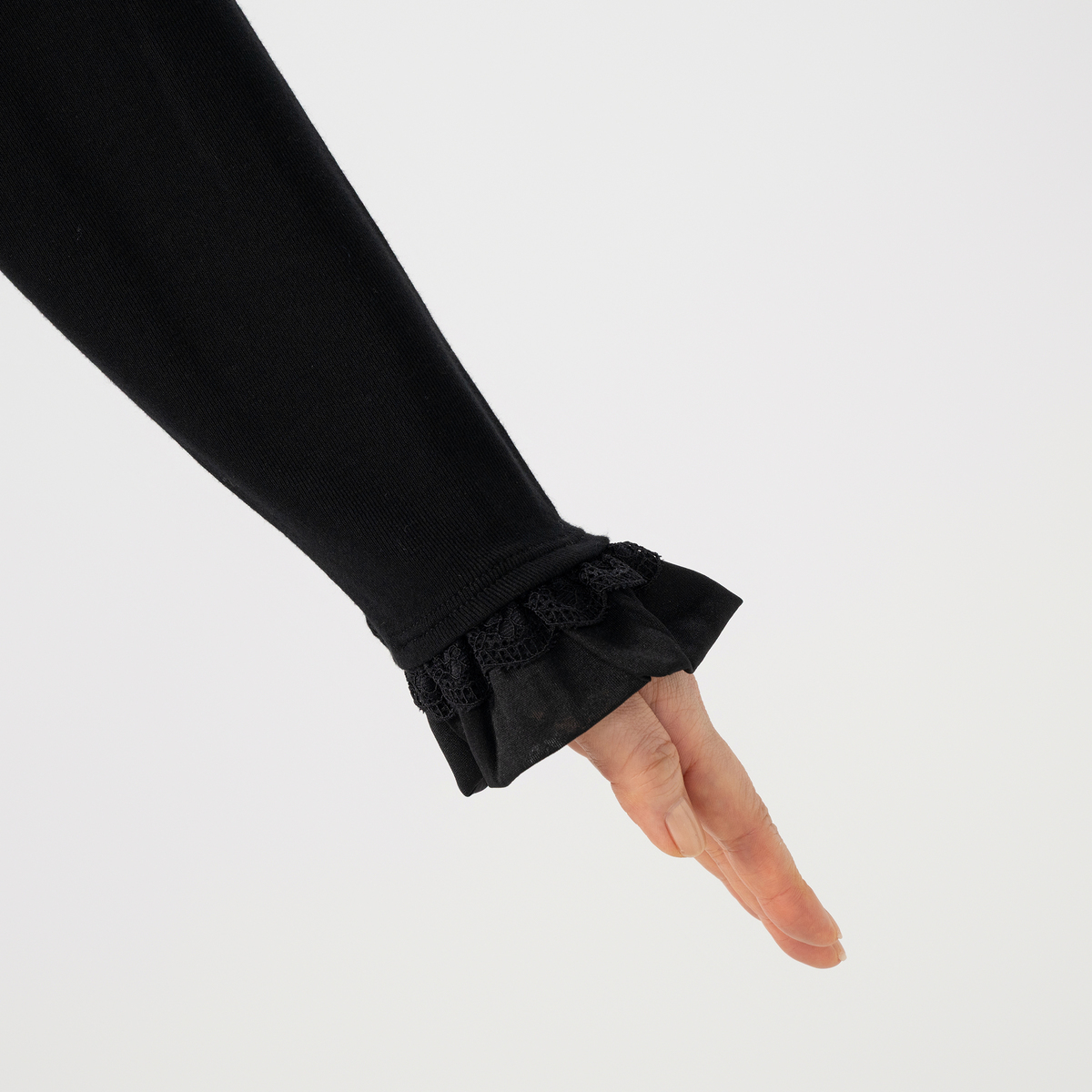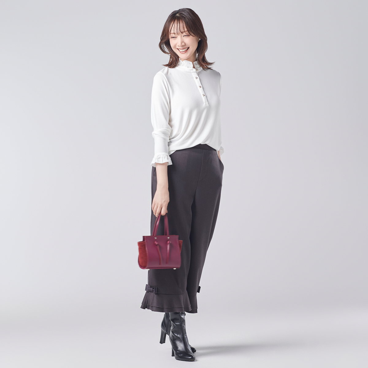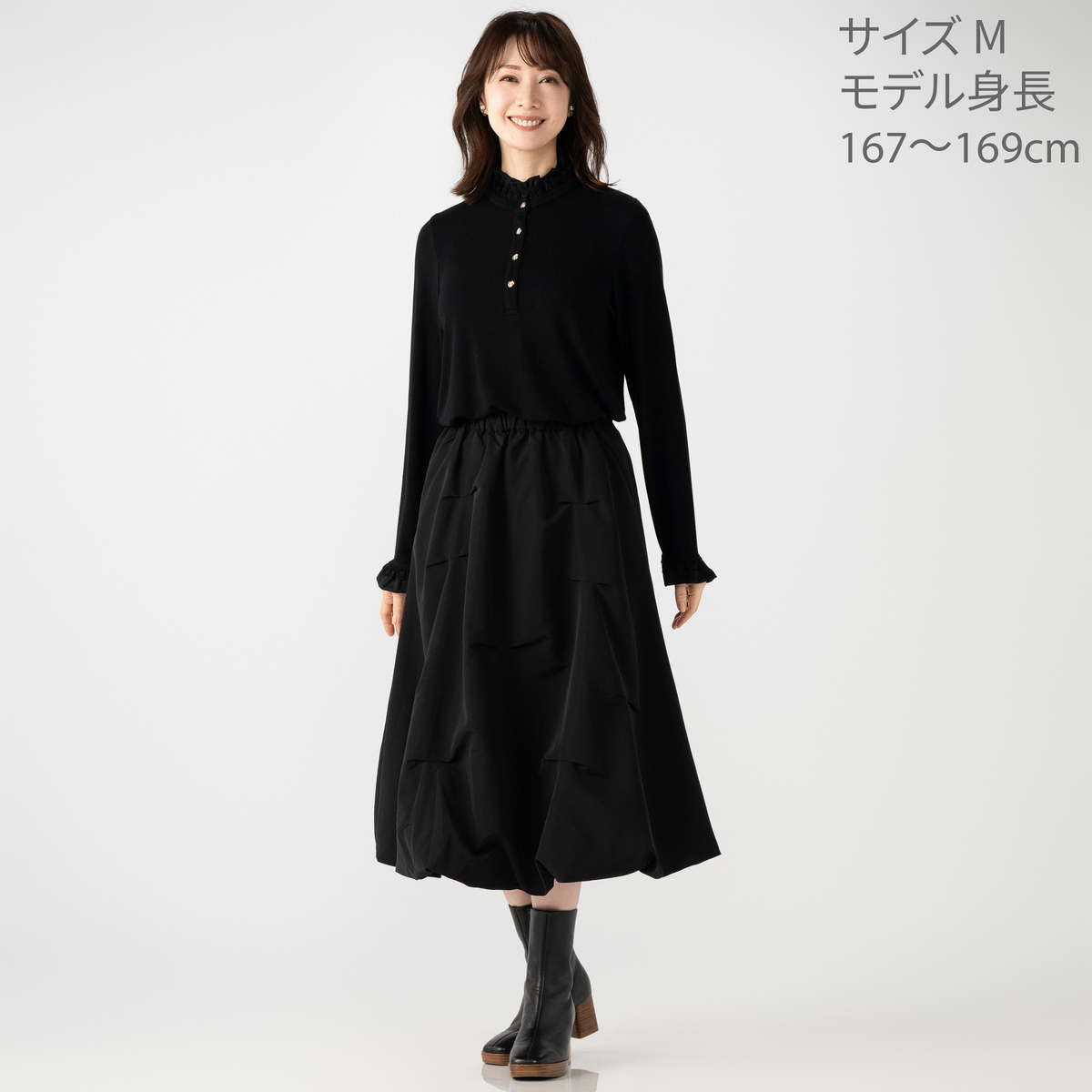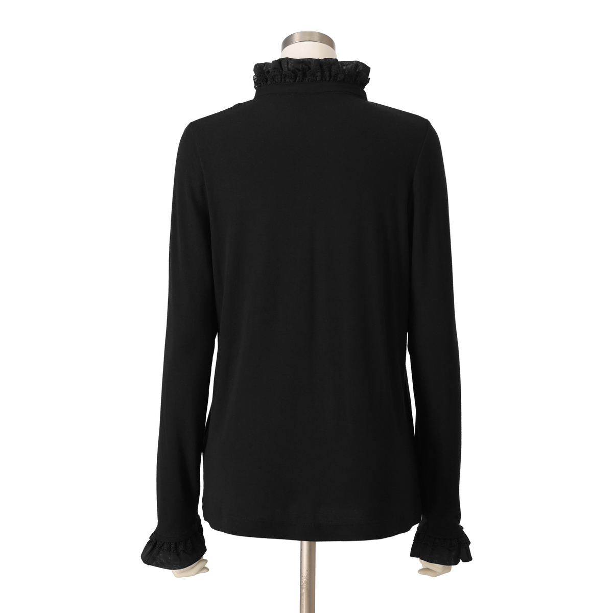 前開きのカメリアボタンが、さりげなく華やかさをプラス。衿元と袖口のフリルが、重ね着スタイルにも映え、上品なアクセントになります