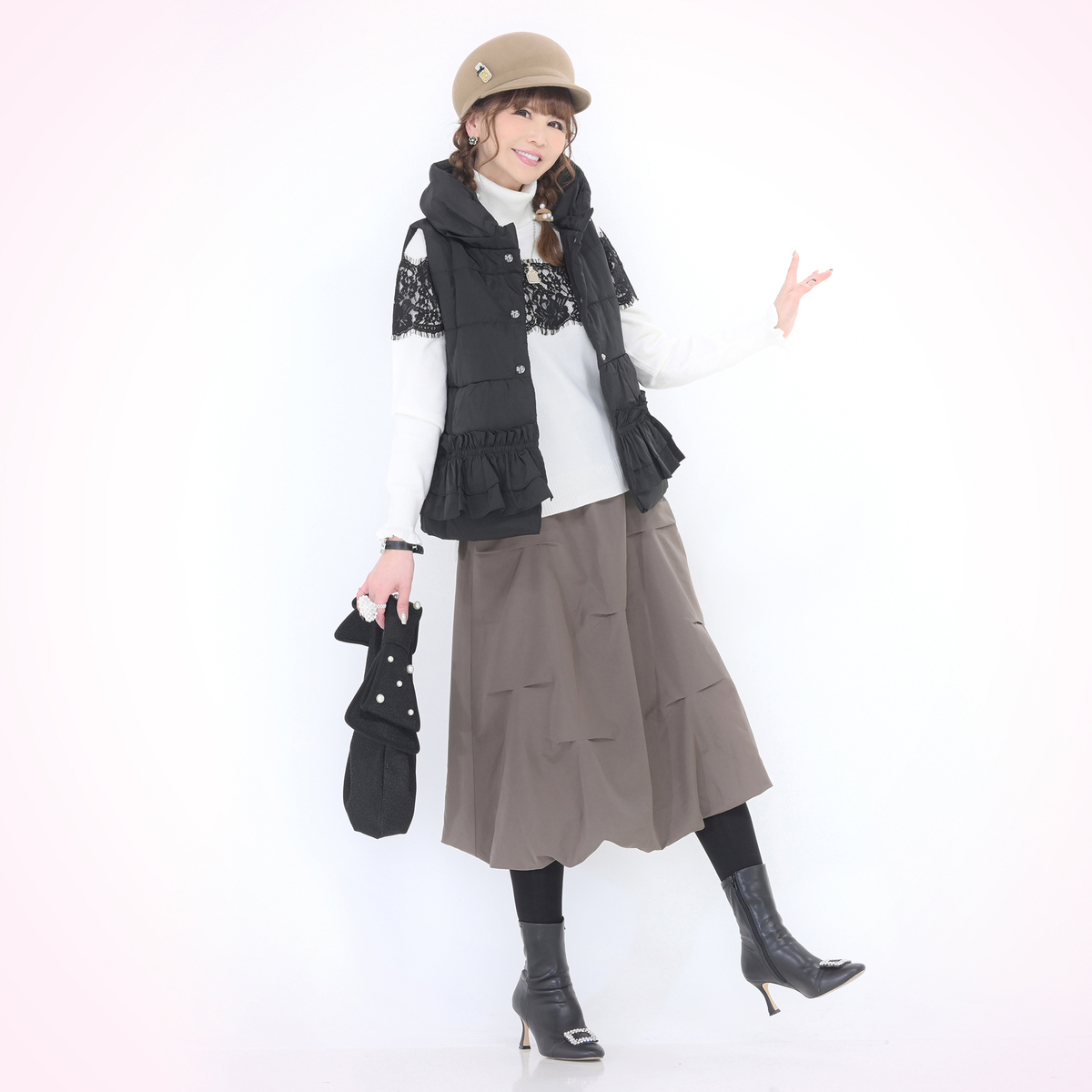 オンエア前から気になってエクリュを購入しました。襟、裾のフリル、ボタン…アンドラブがいっぱい!中綿ですが変なボリュームもなくスッキリ着れるのには驚きです。パンツにもスカートにも合わせられるのでコーデも迷わずベビロテすると思います。