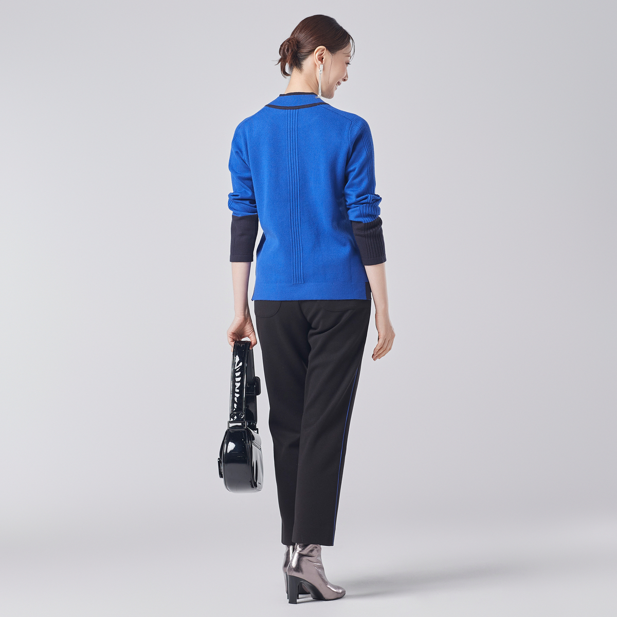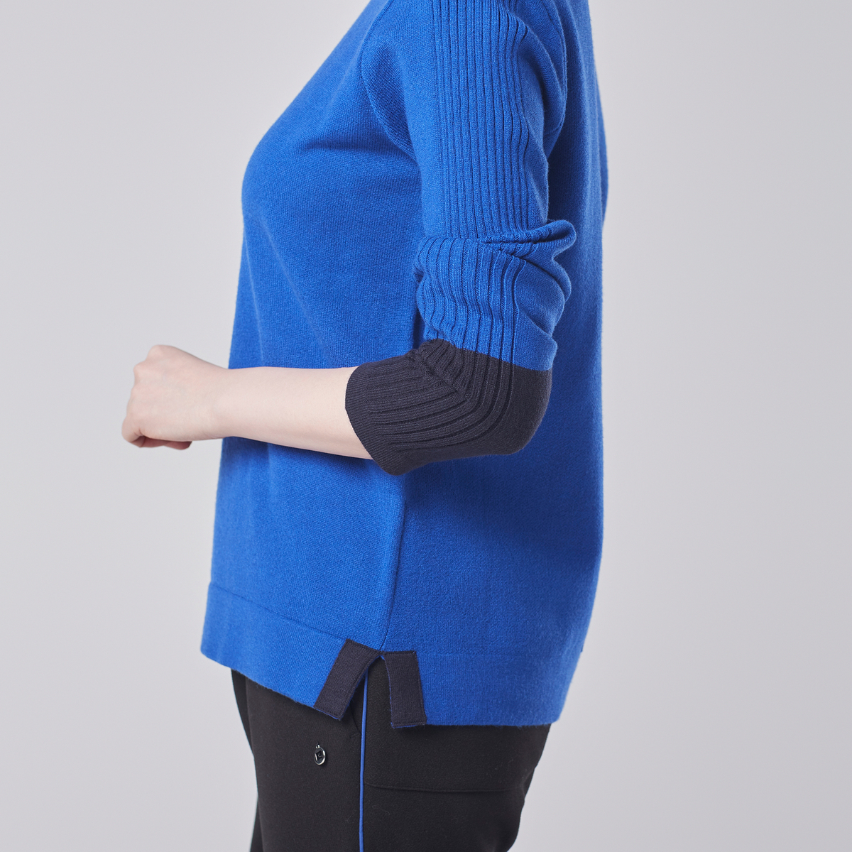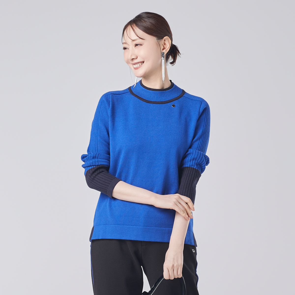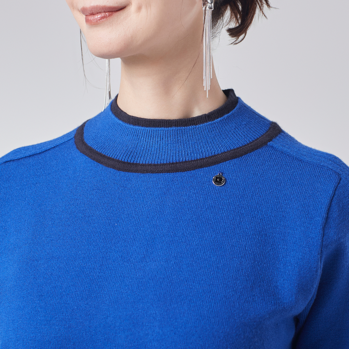 袖と衿の配色がポイントのニットプルオーバー。ハイネックの衿元は2枚重ねて配色を見せたこだわりのデザインです