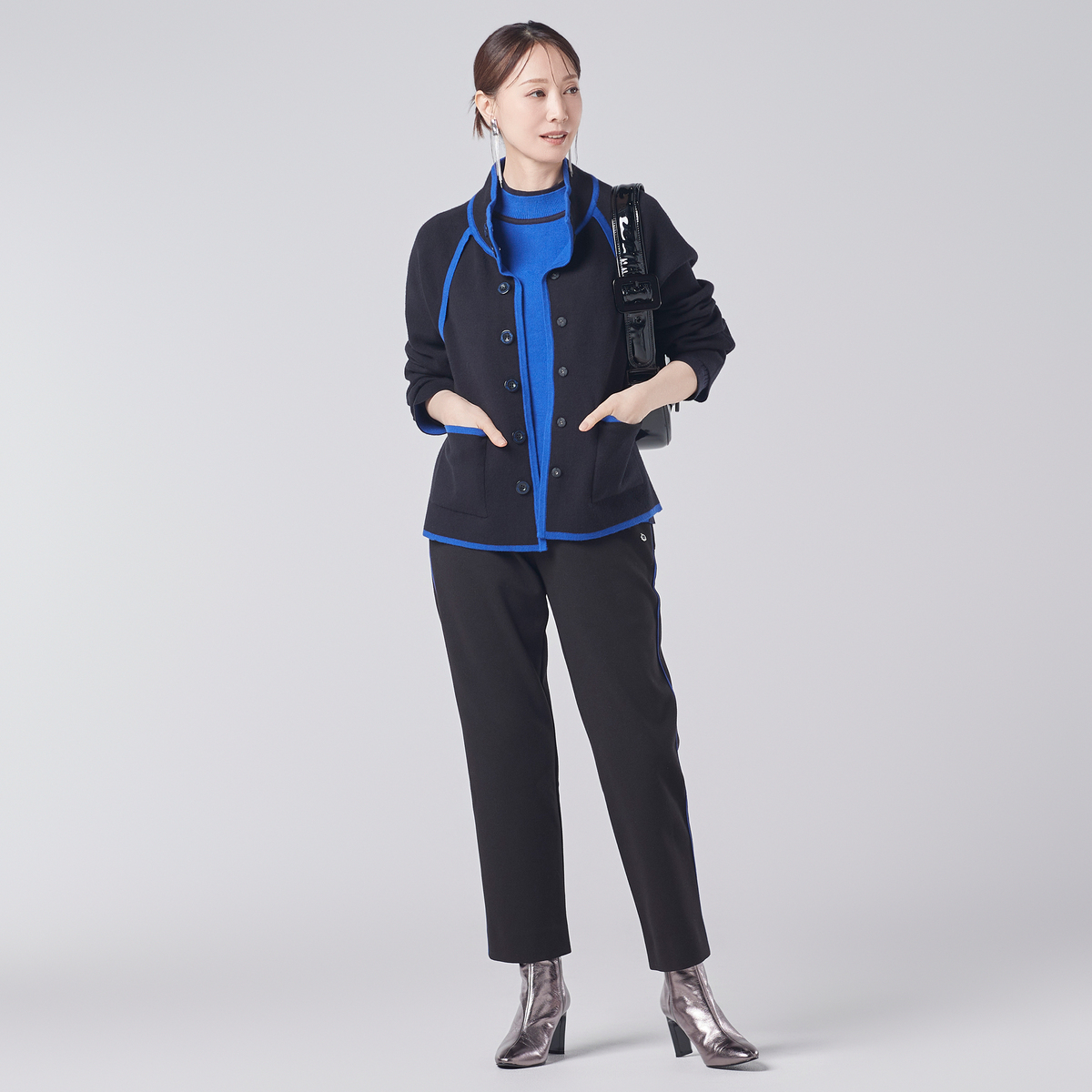 すっきり着こなせる程良いサイズ感。後中心と、肩から袖にかけてリブラインを入れ、シャープな雰囲気をプラスしました