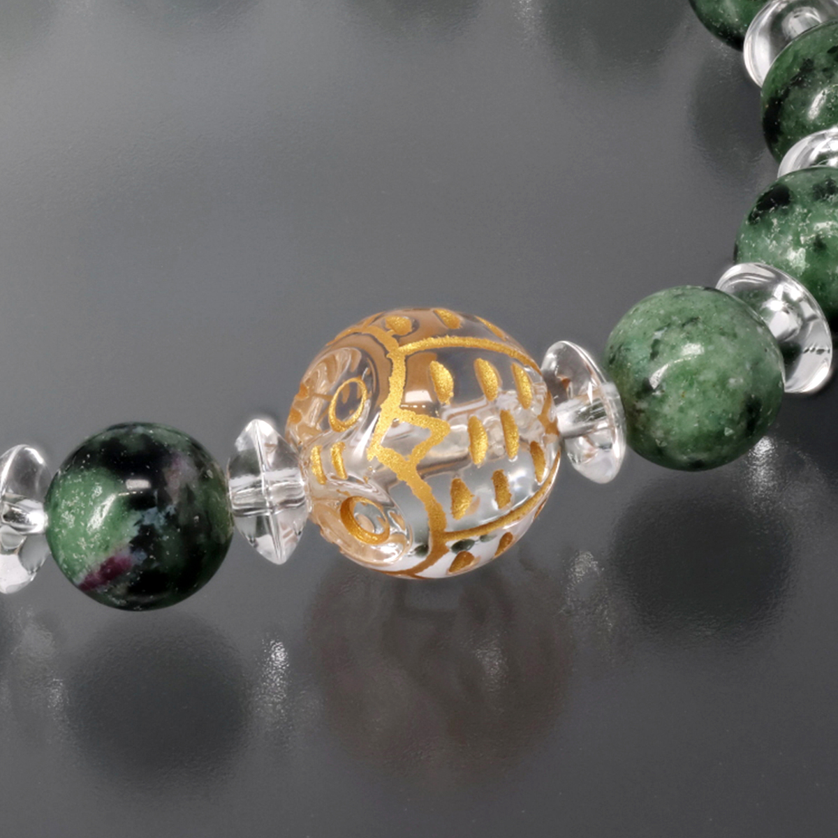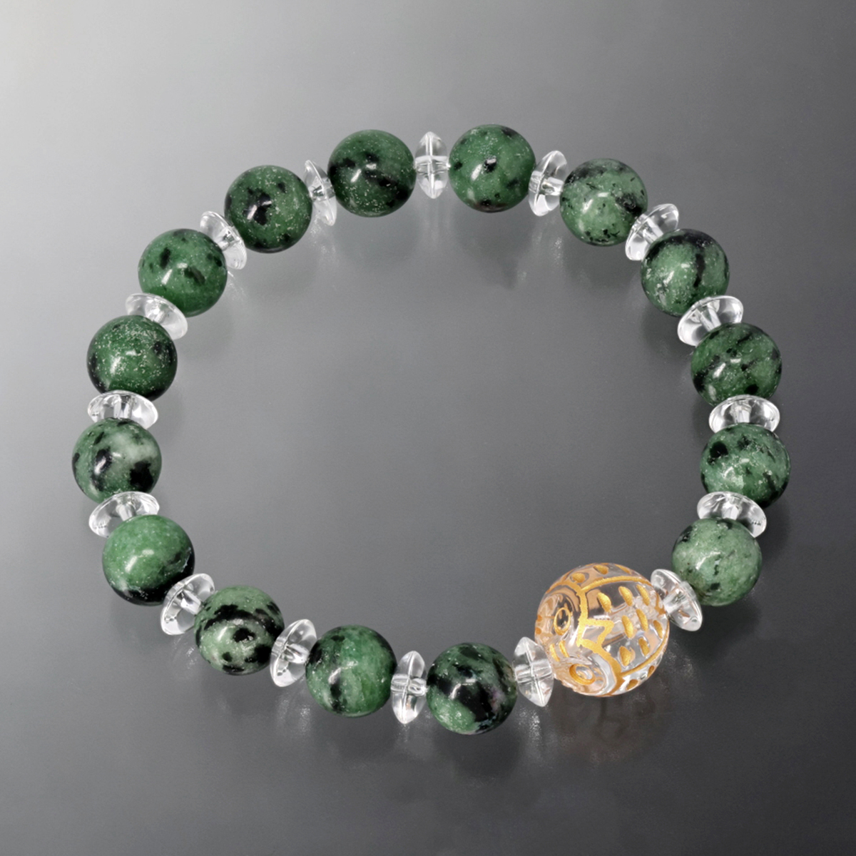 パワーストーンとしても人気の水晶に、ラッキーモチーフのふくろうを手彫りで施し、ブレスレットにセットしました。ナチュラルなゾイサイトの斑模様が印象的で、ユニセックスで楽しめます